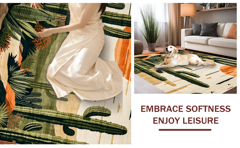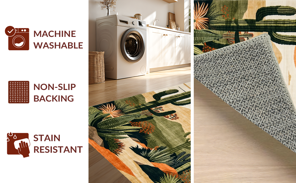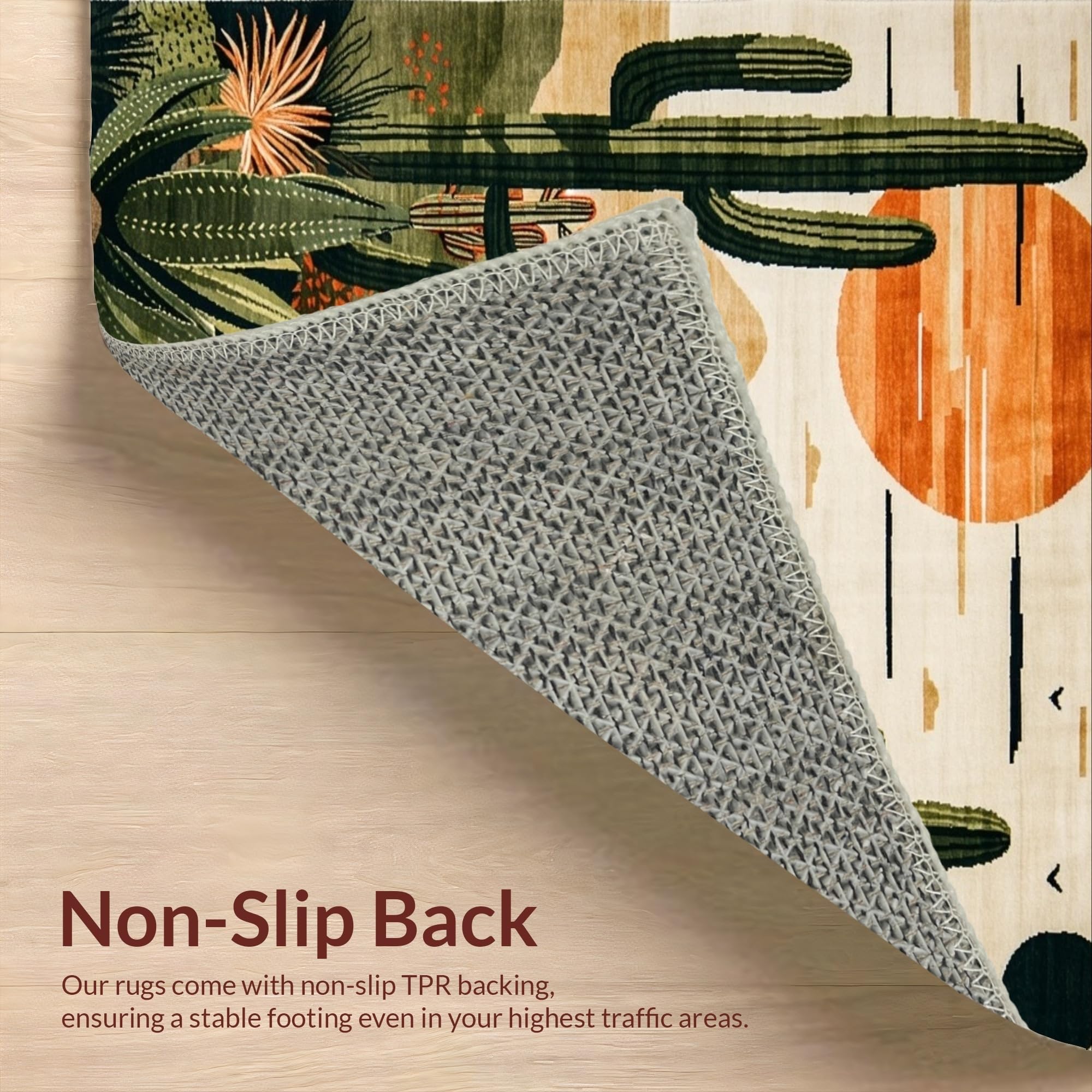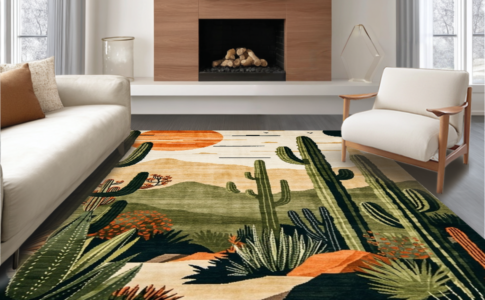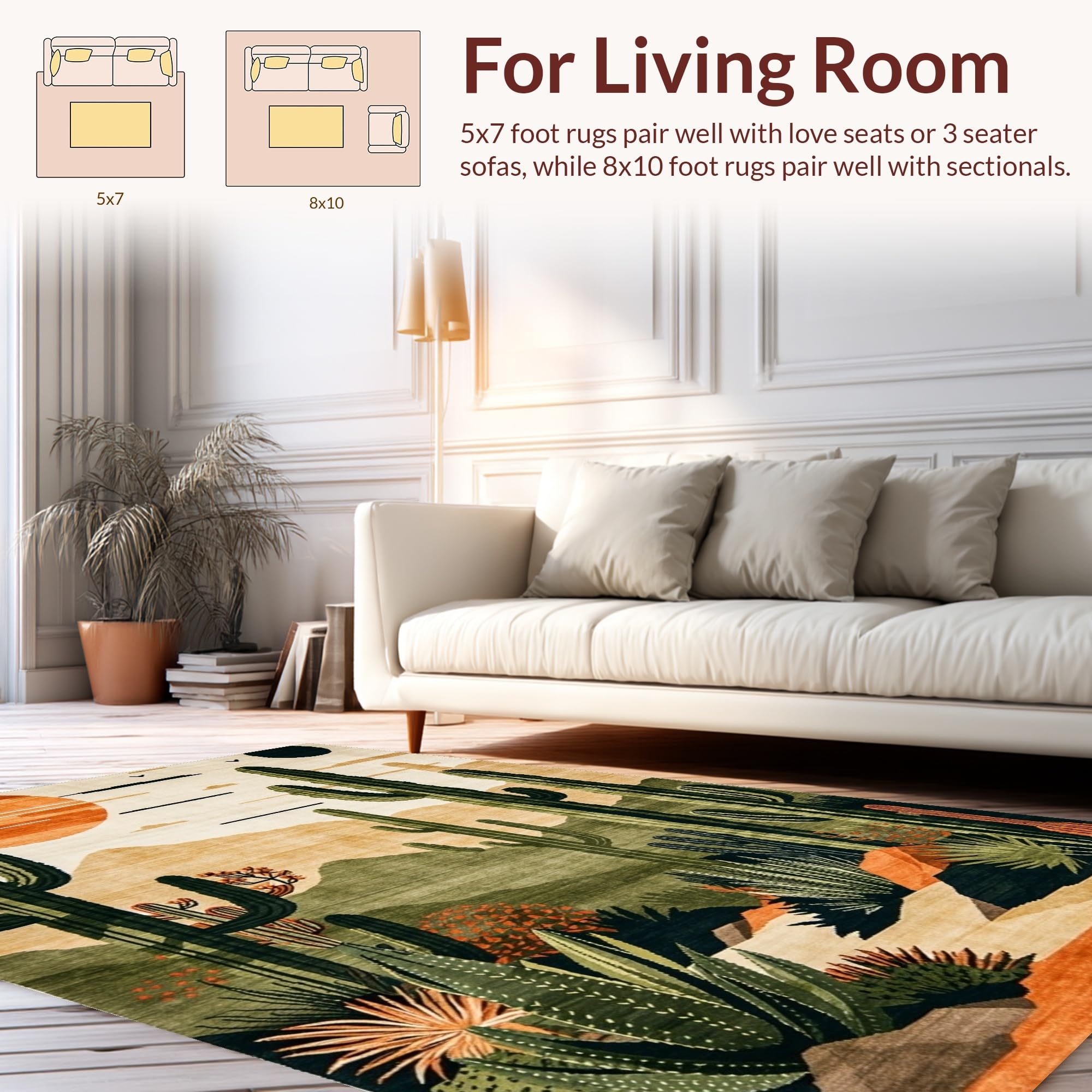 Ultra Soft Area Rug, Non Slip, Stain Resistant, Washable Area Rugs for Living Room, Bedroom, Joyful Rustic Cactus Imagery(Beige) Overview: