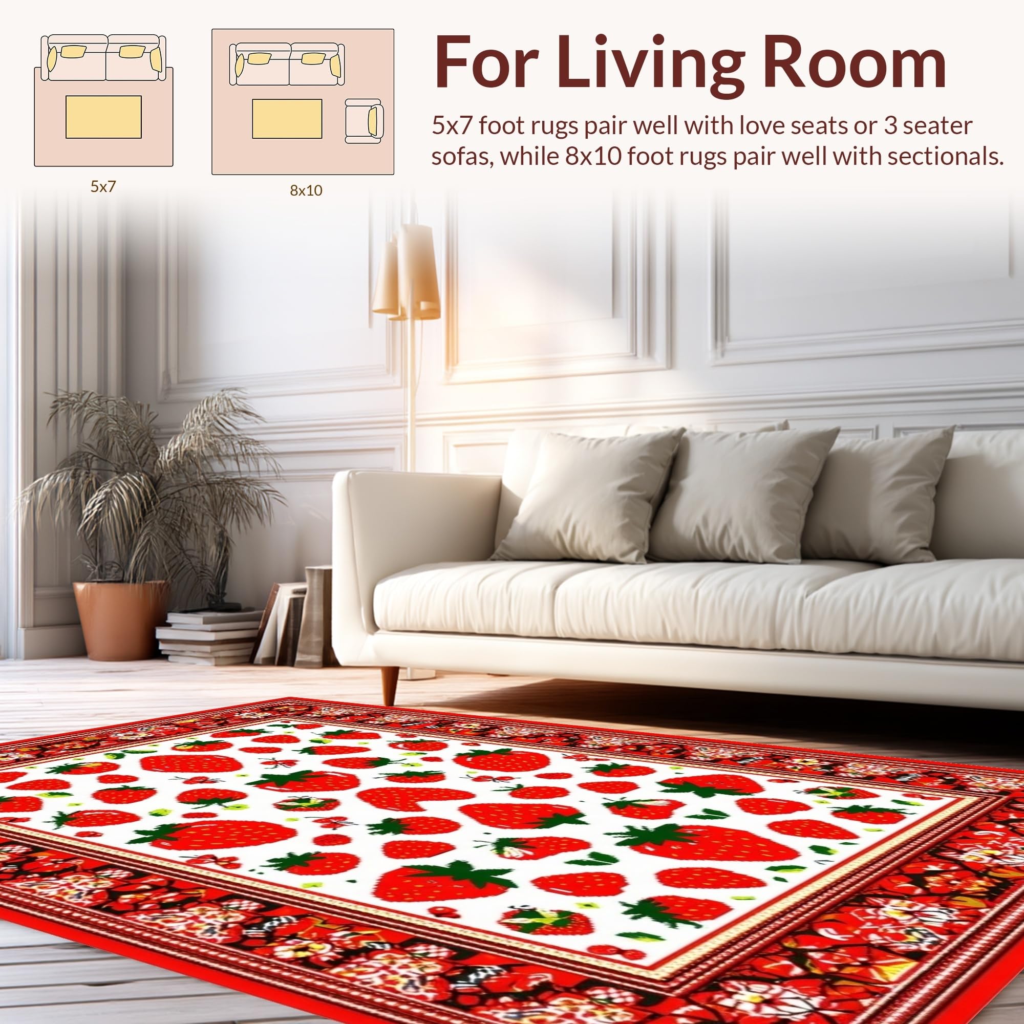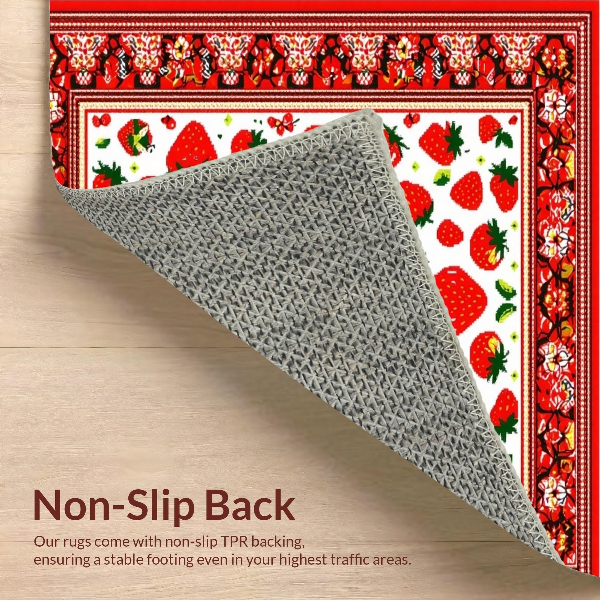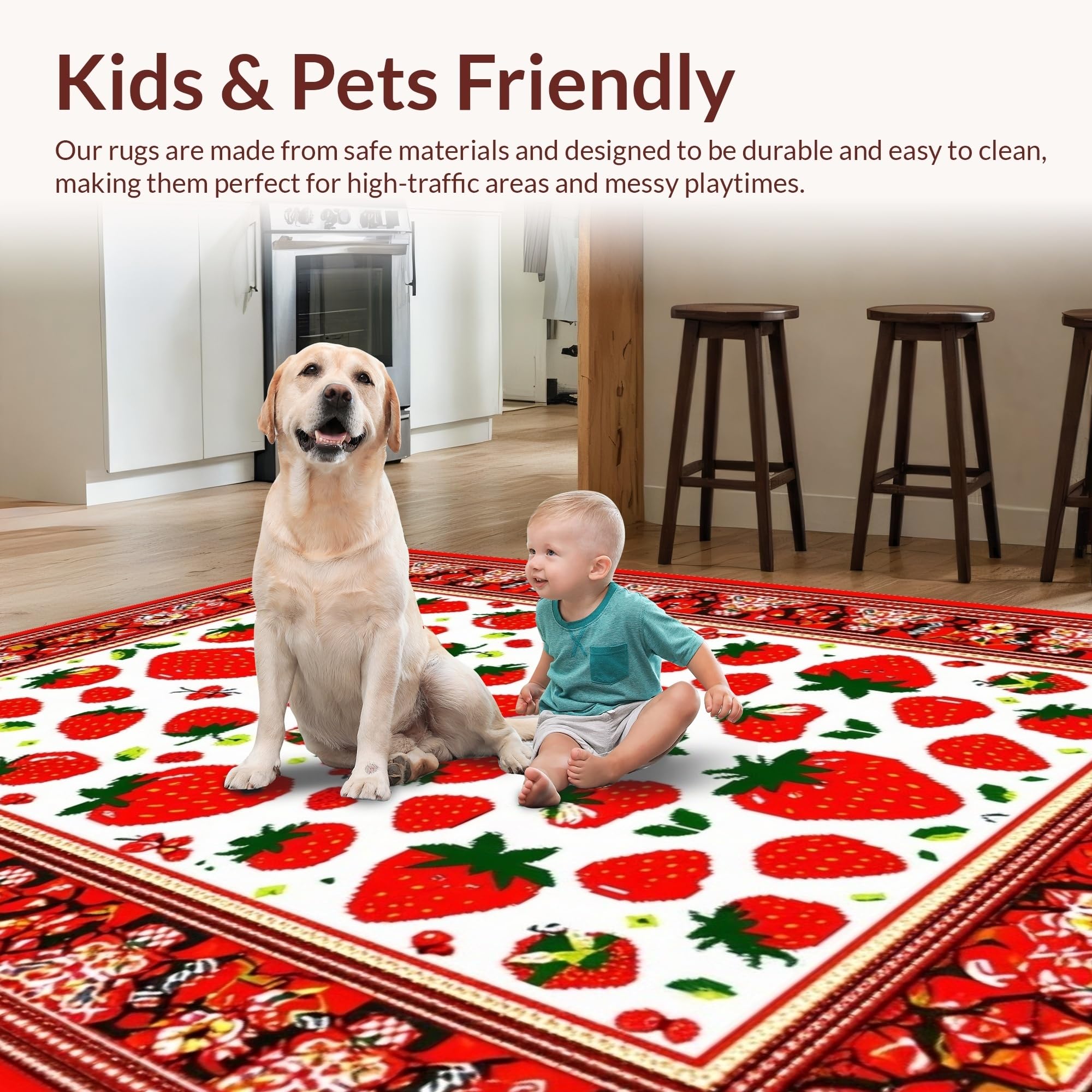 Ultra Soft Area Rug, Non Slip, Stain Resistant, Washable Area Rugs for Living Room, Bedroom, Joyful Springtime Fruit and Bee Fusion(Red) Overview: