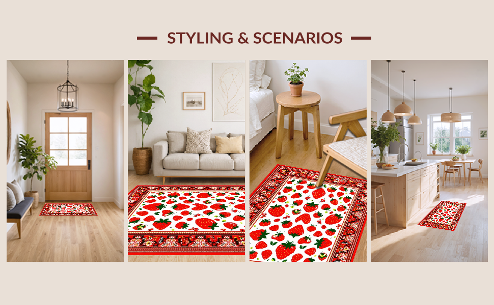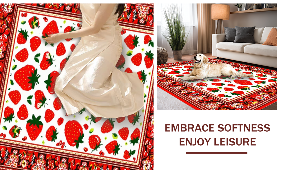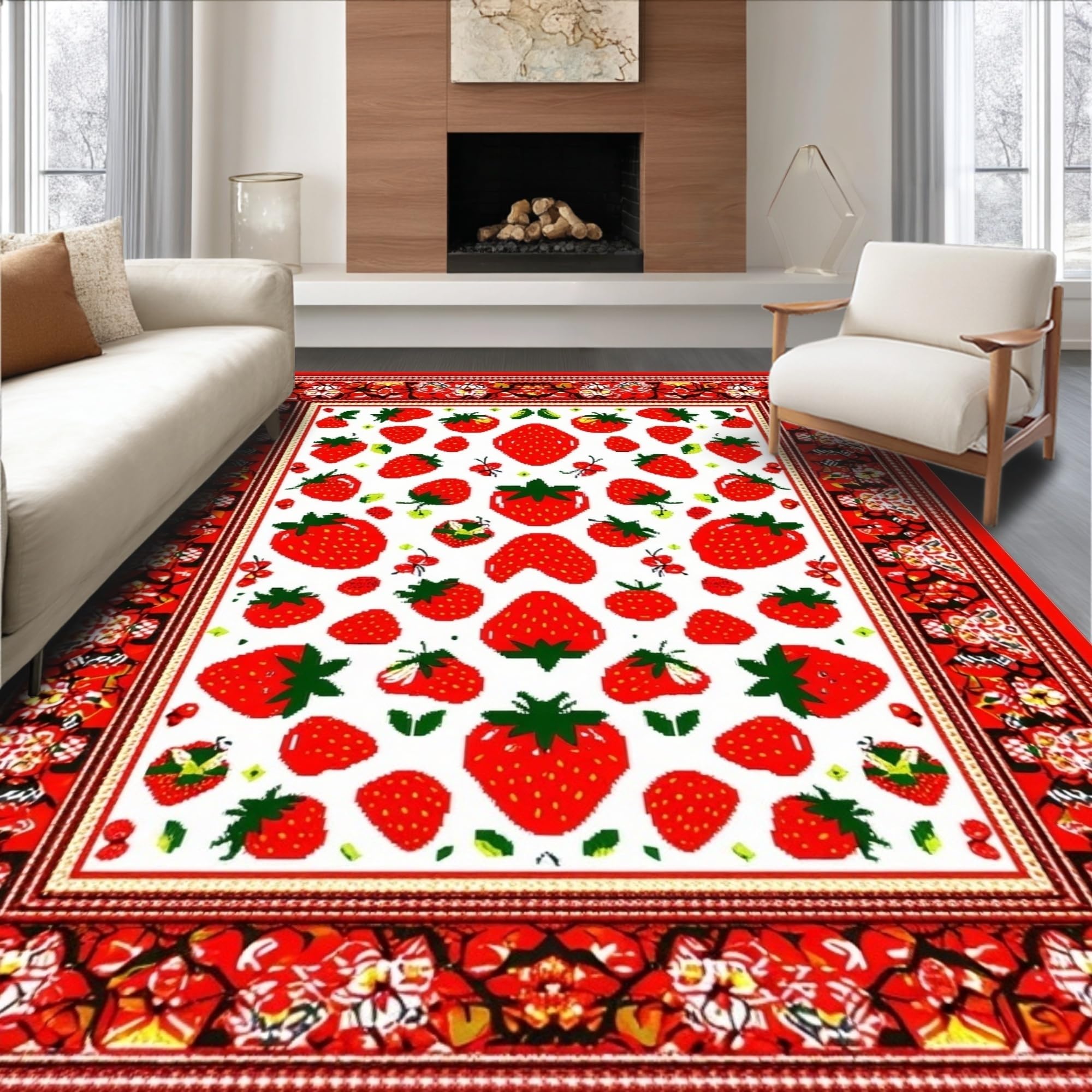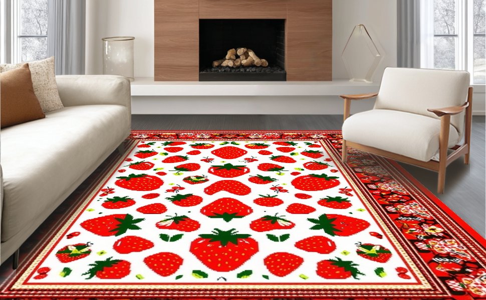 Ultra Soft Area Rug, Non Slip, Stain Resistant, Washable Area Rugs for Living Room, Bedroom, Joyful Springtime Fruit and Bee Fusion(Red) Overview: