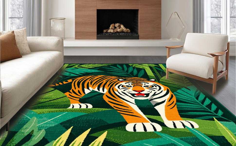 Ultra Soft Area Rug, Non Slip, Stain Resistant, Washable Area Rugs for Living Room, Bedroom, Jungle Inspired Colorful Animal Motif(Green) Overview: