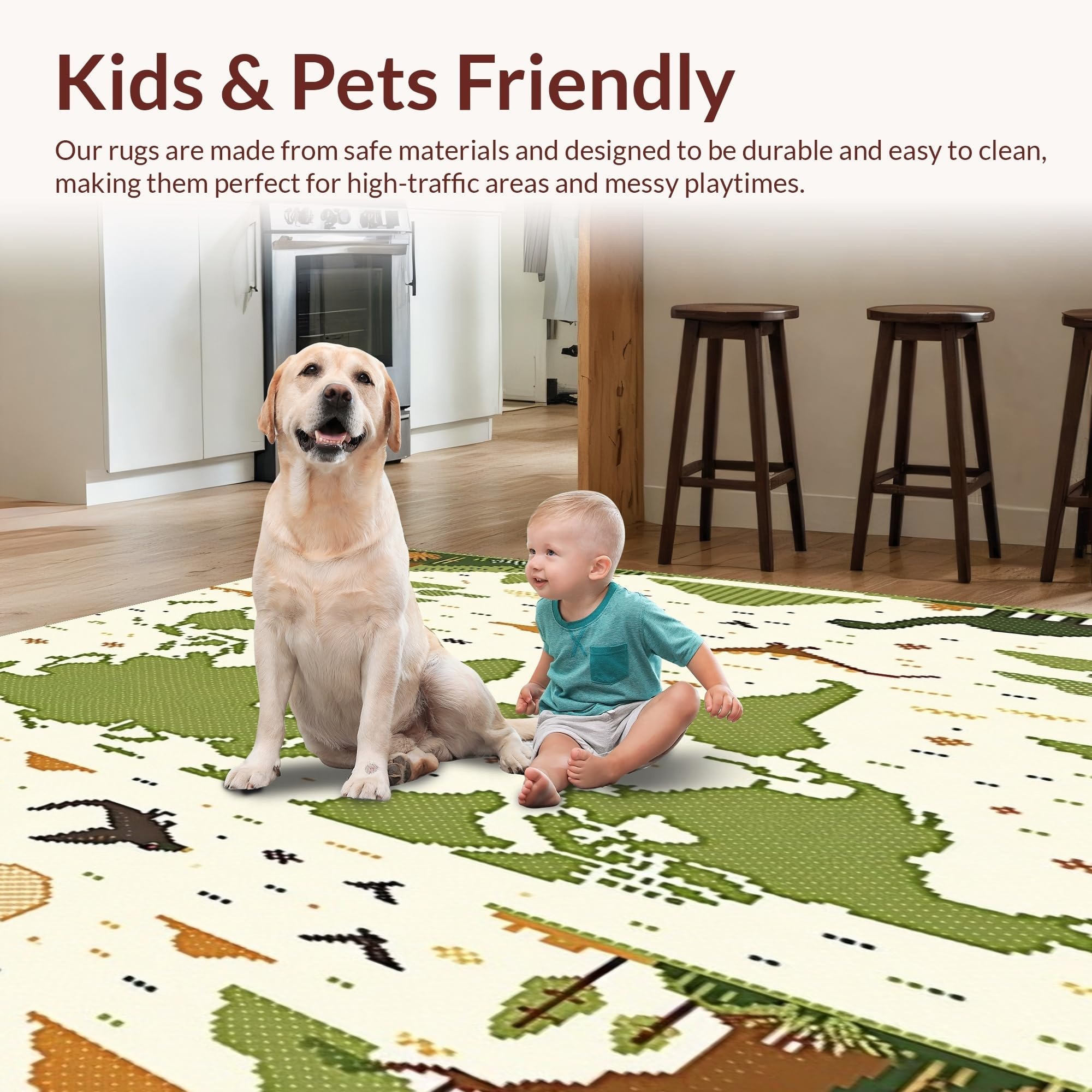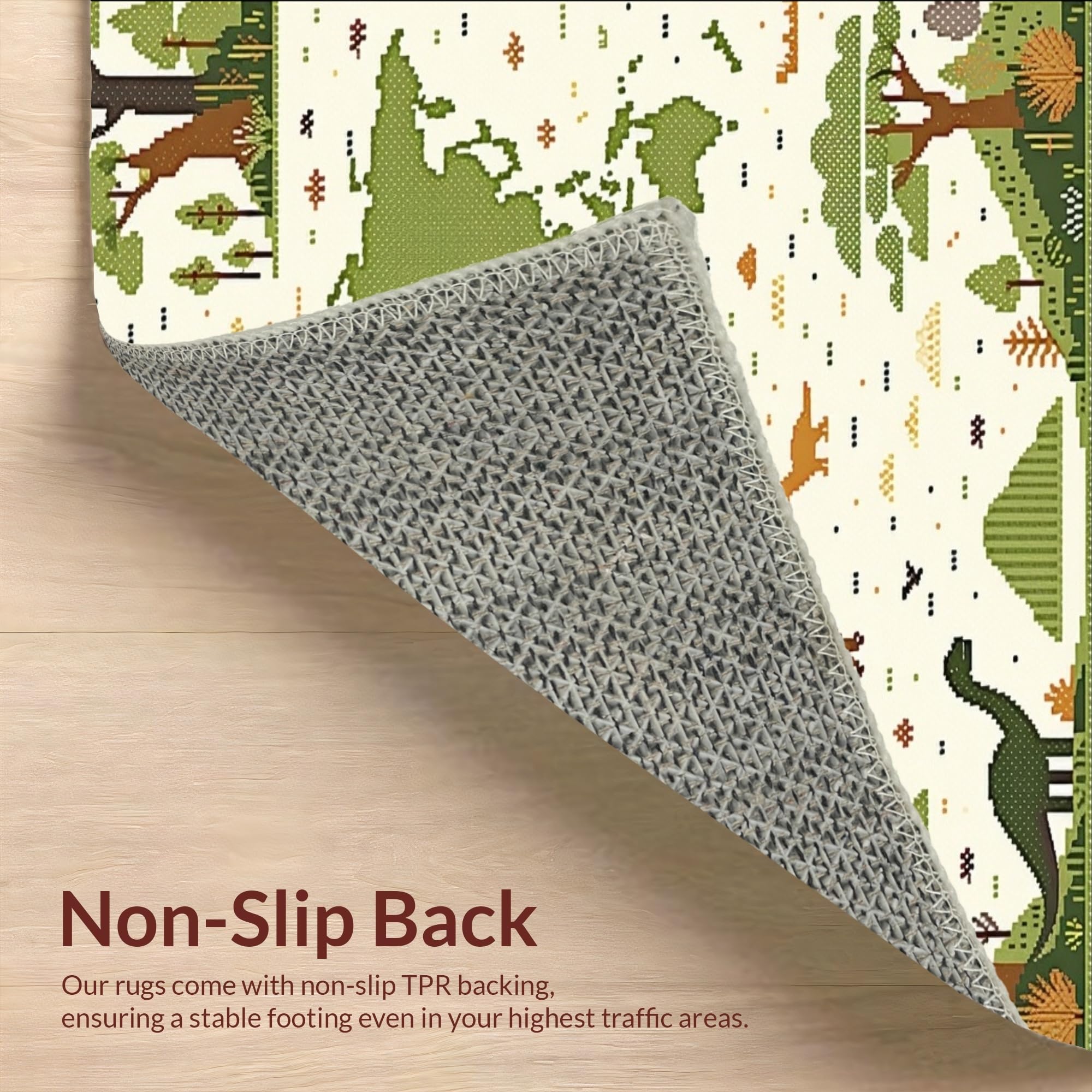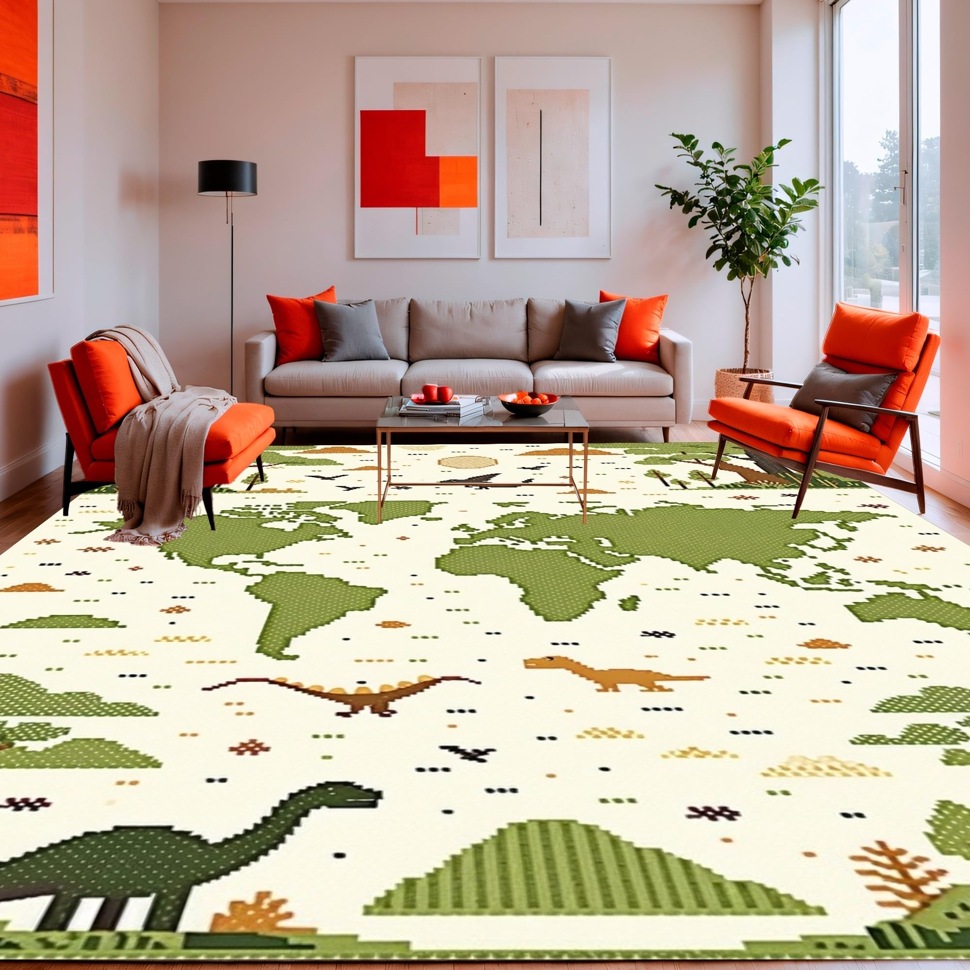 Ultra Soft Area Rug, Non Slip, Stain Resistant, Washable Area Rugs for Living Room, Bedroom, Light Beige Educational with Prehistoric Dinosaur Art and Earth Map Graphics(Green) Overview: