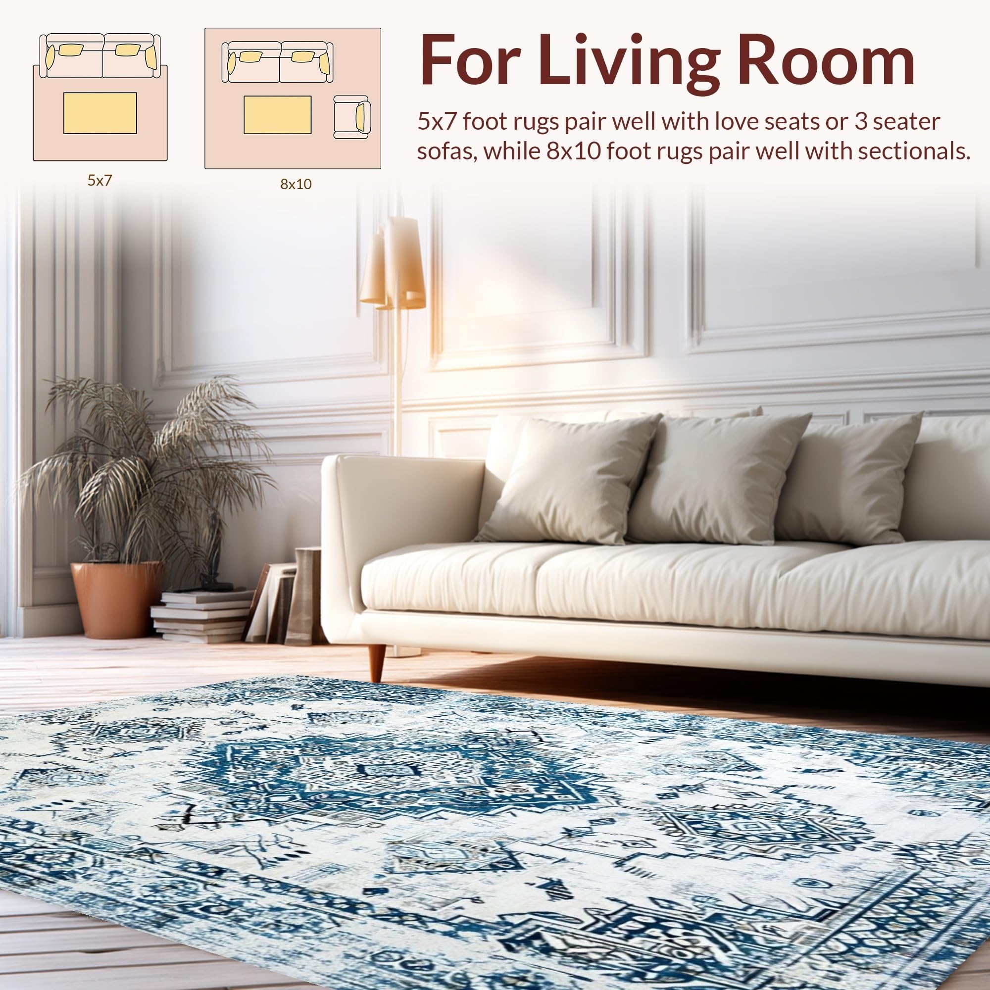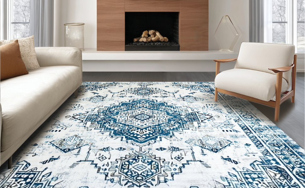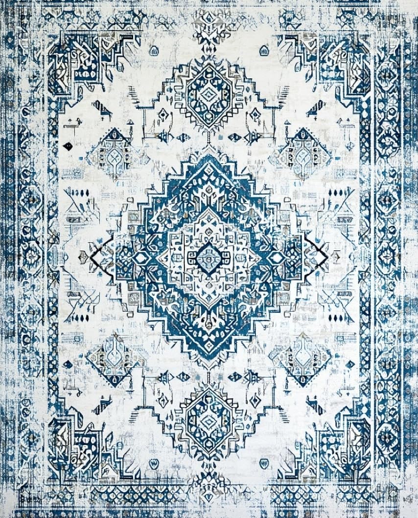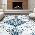 Ultra Soft Area Rug, Non Slip, Stain Resistant, Washable Area Rugs for Living Room, Bedroom, Light Blue Vintage Geometric Design(White) Overview:
