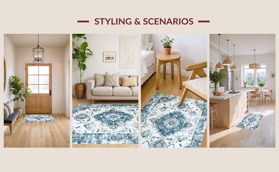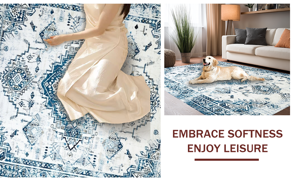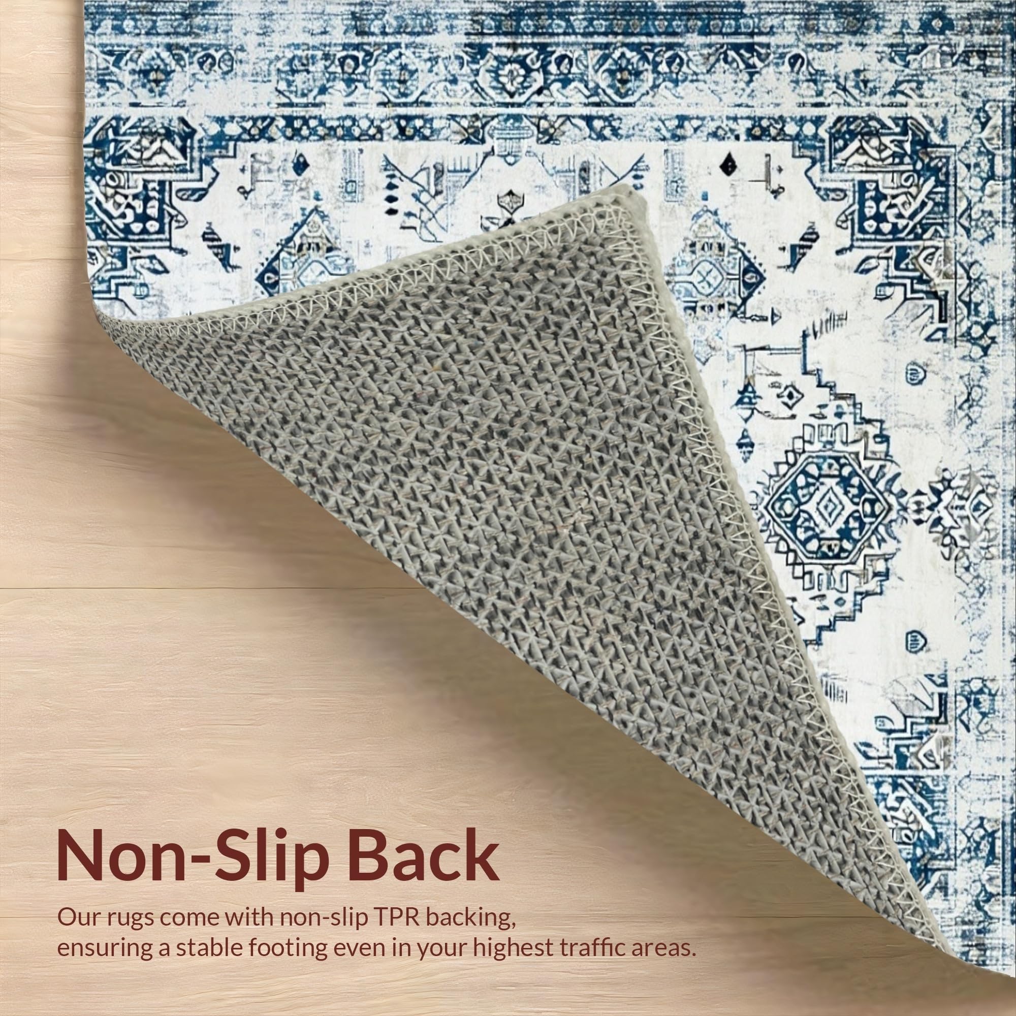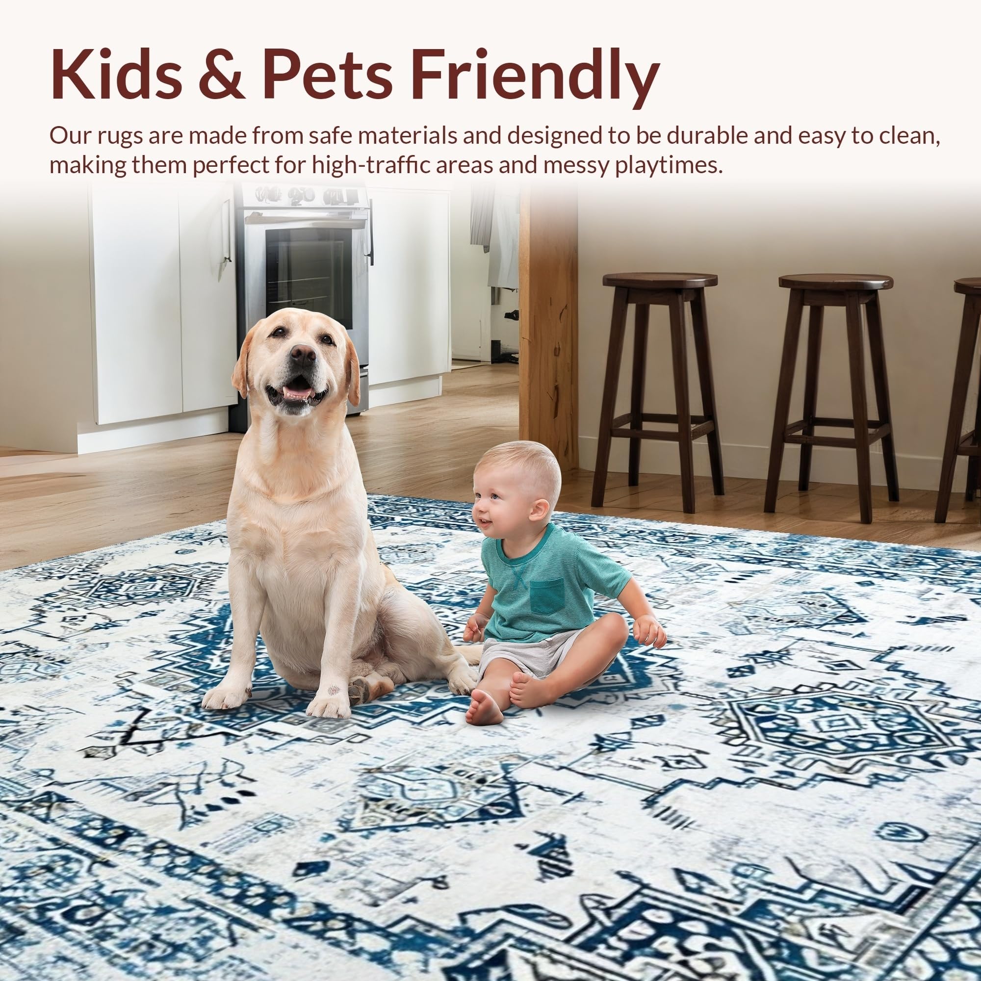 Ultra Soft Area Rug, Non Slip, Stain Resistant, Washable Area Rugs for Living Room, Bedroom, Light Blue Vintage Geometric Design(White) Overview: