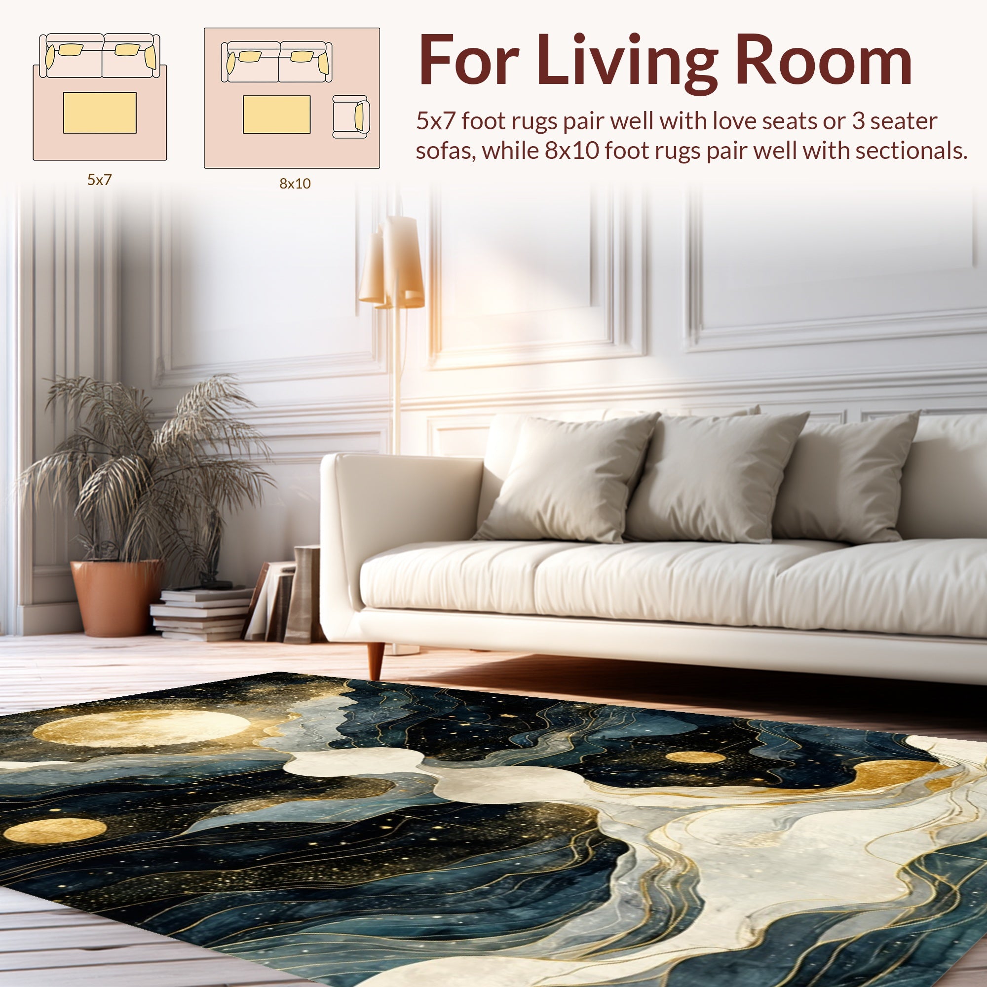 Ultra Soft Area Rug, Non Slip, Stain Resistant, Washable Area Rugs for Living Room, Bedroom, Liquid Celestial Waves Rug Abstract Sun Moon Phases with Flowing Star Trails(Blue) Overview: