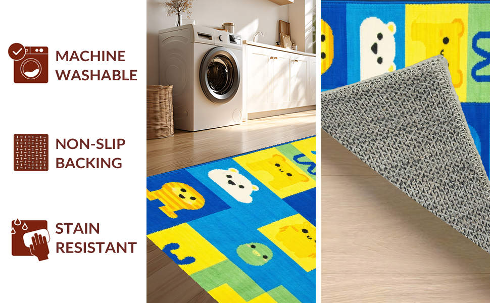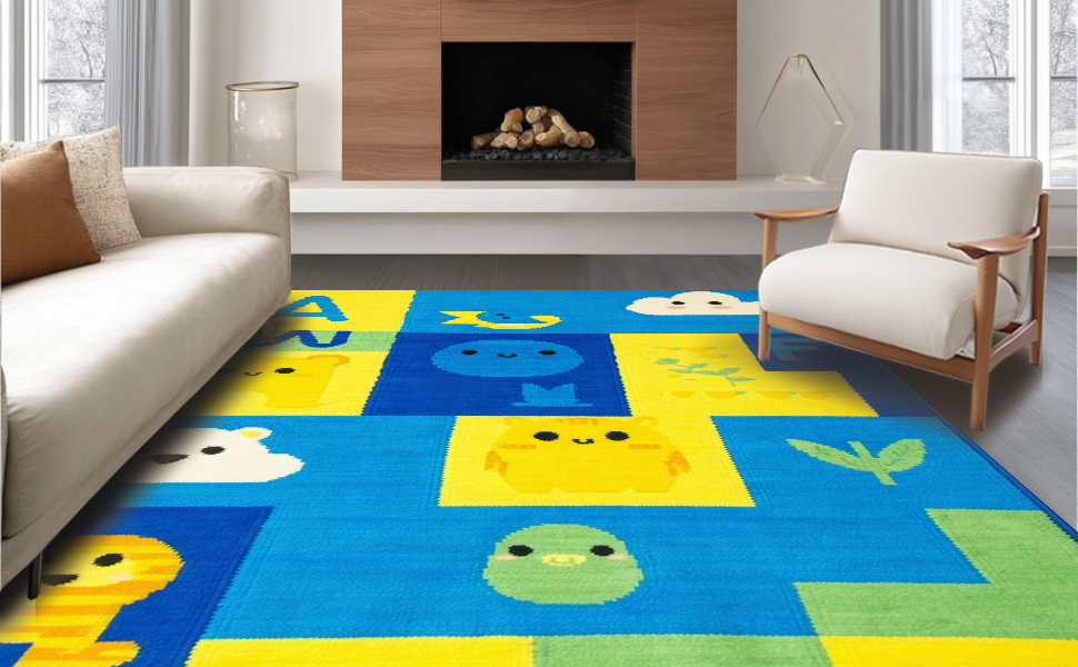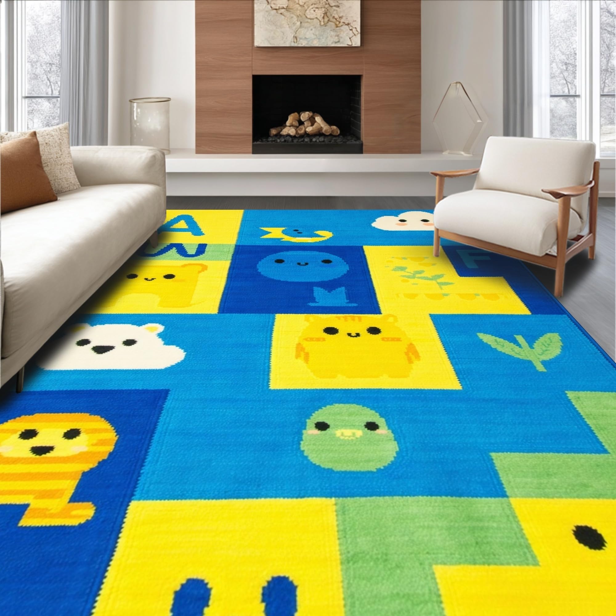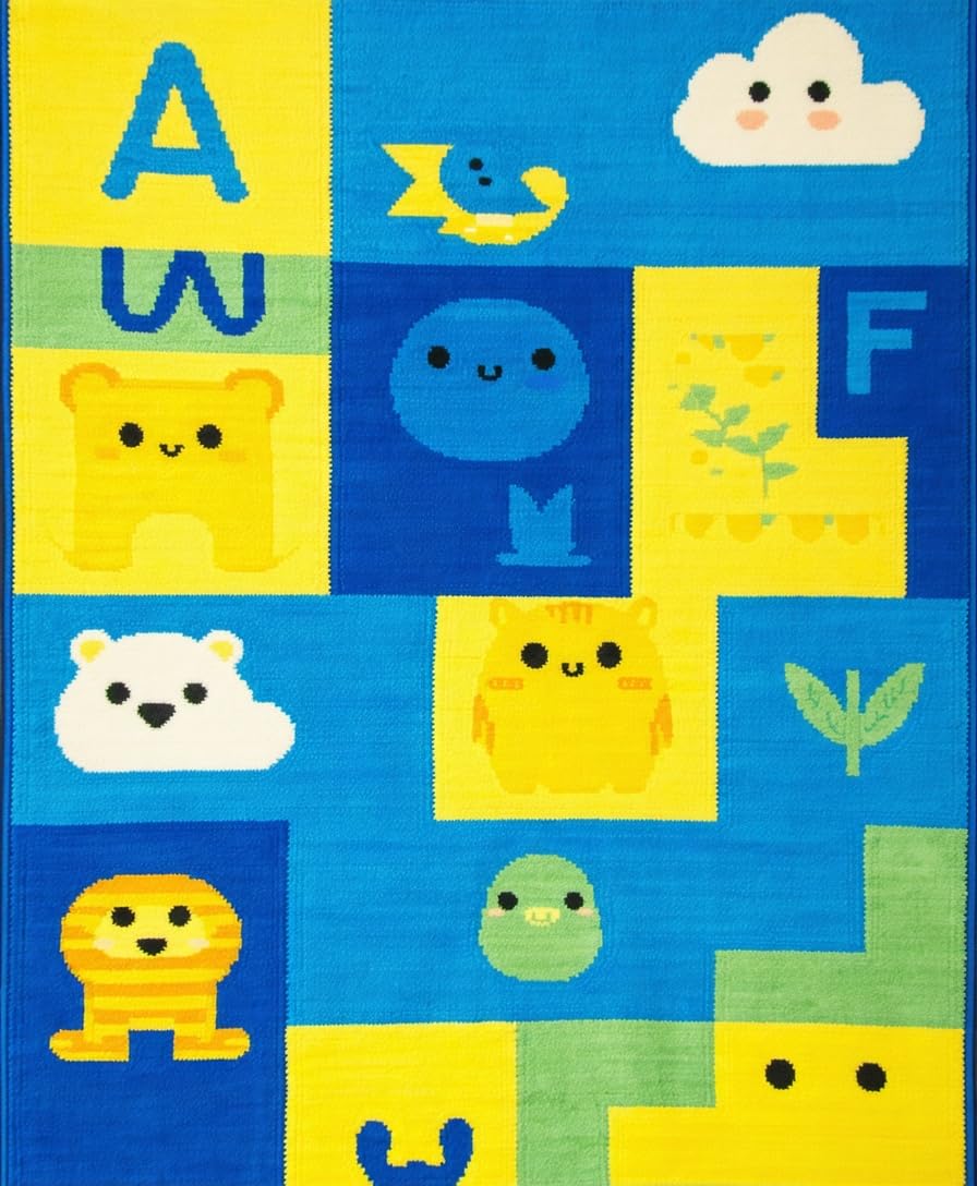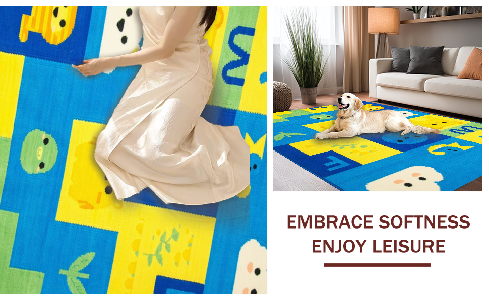 Ultra Soft Area Rug, Non Slip, Stain Resistant, Washable Area Rugs for Living Room, Bedroom, Lively Animal Alphabet Composition(Yellow) Overview: