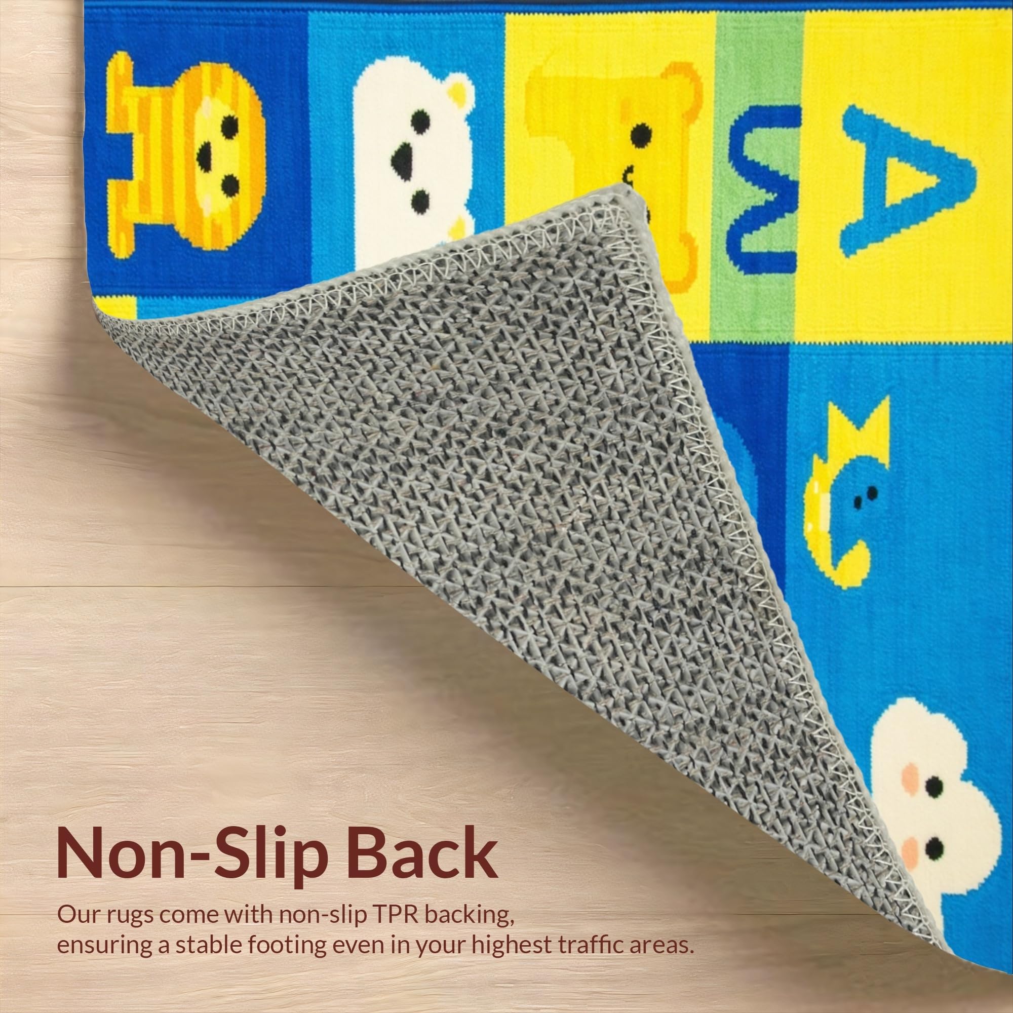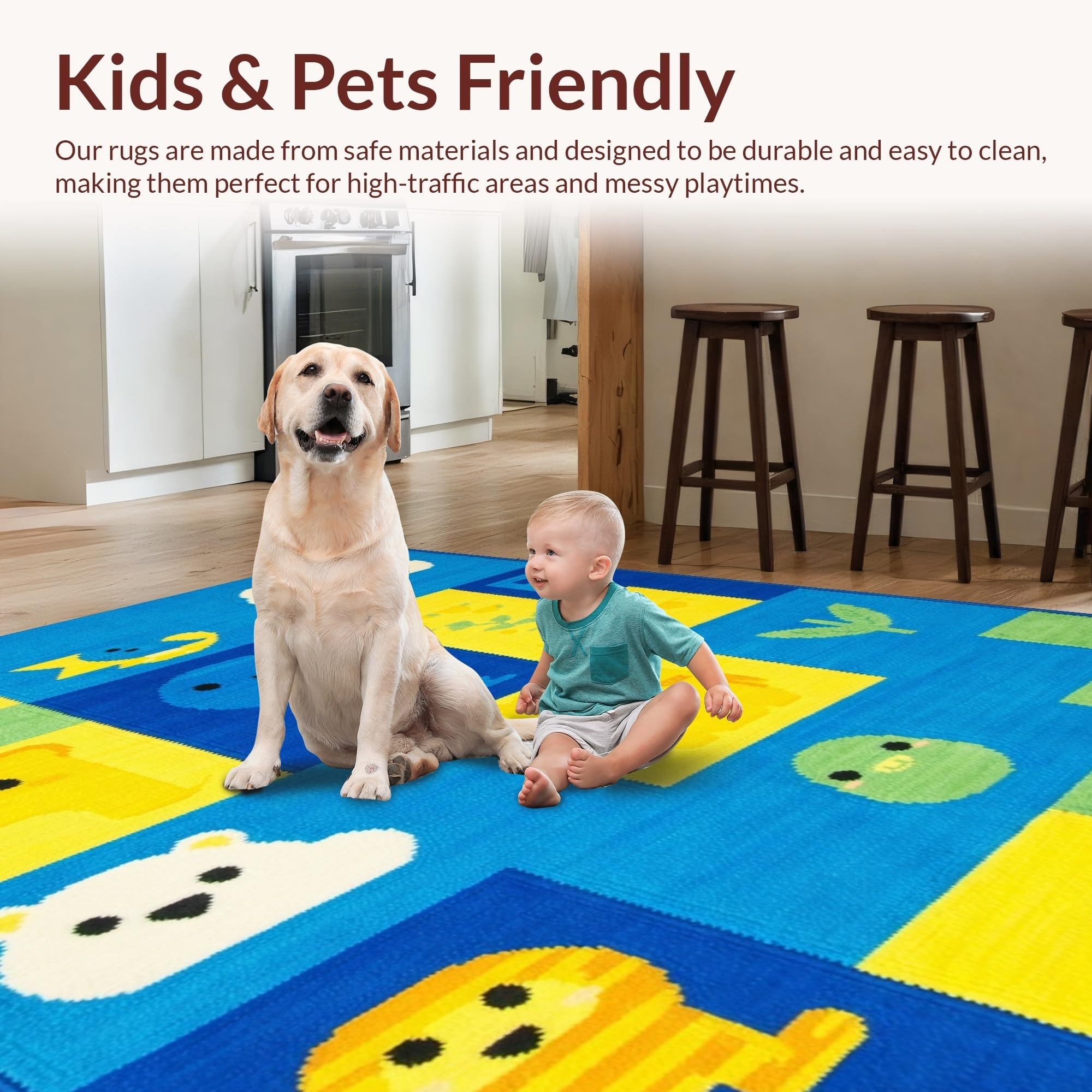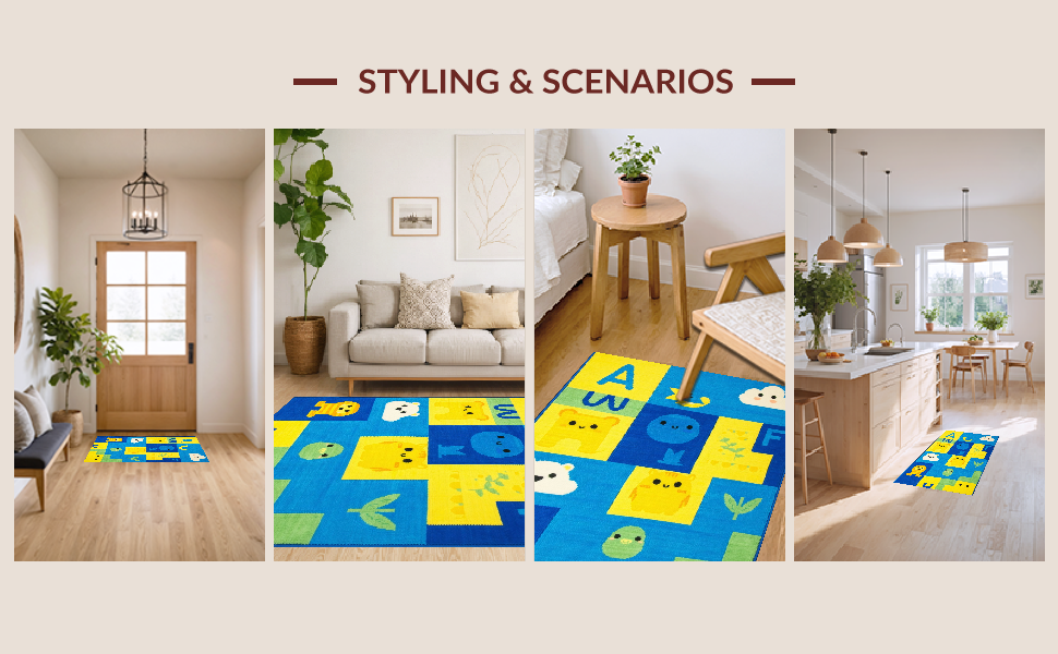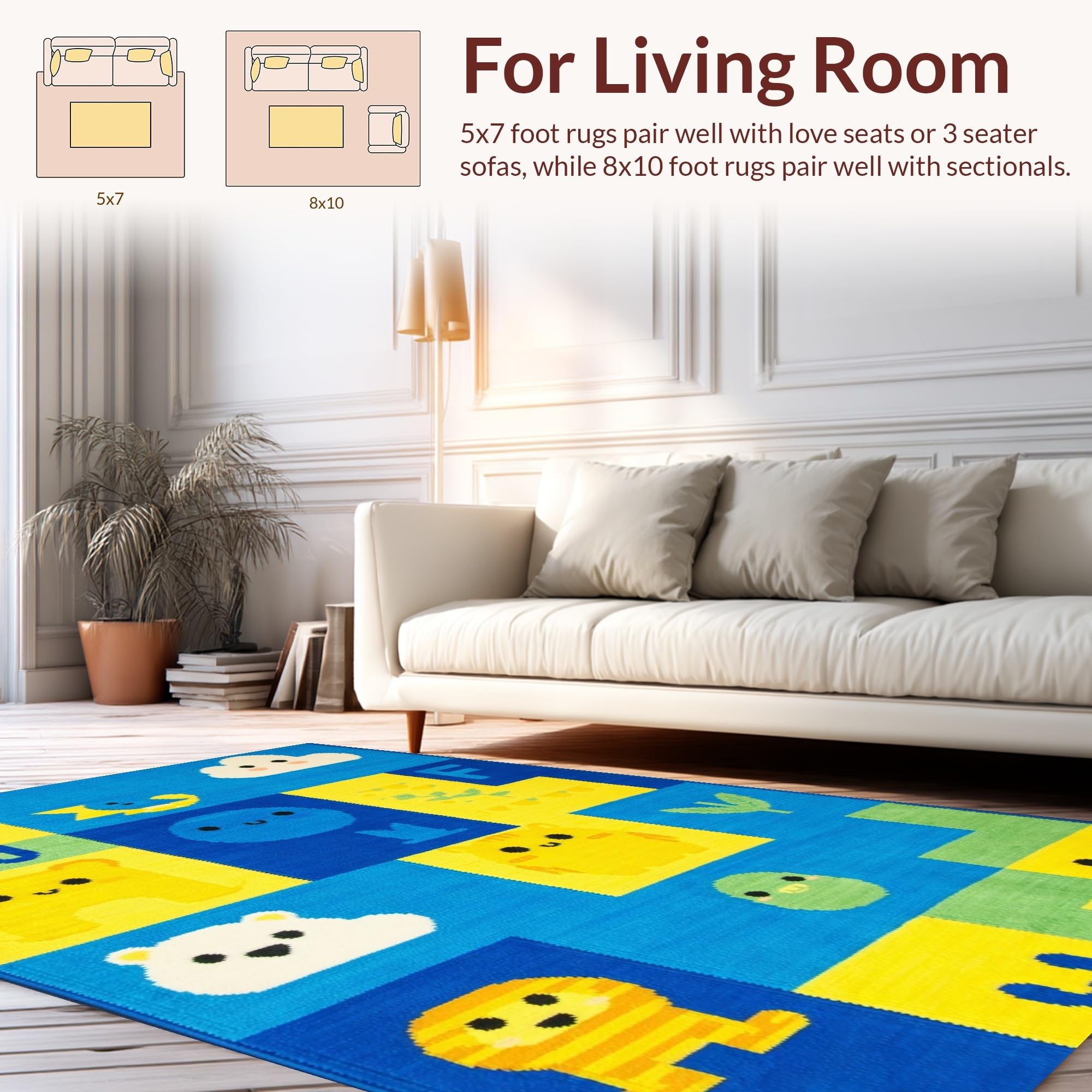 Ultra Soft Area Rug, Non Slip, Stain Resistant, Washable Area Rugs for Living Room, Bedroom, Lively Animal Alphabet Composition(Yellow) Overview: