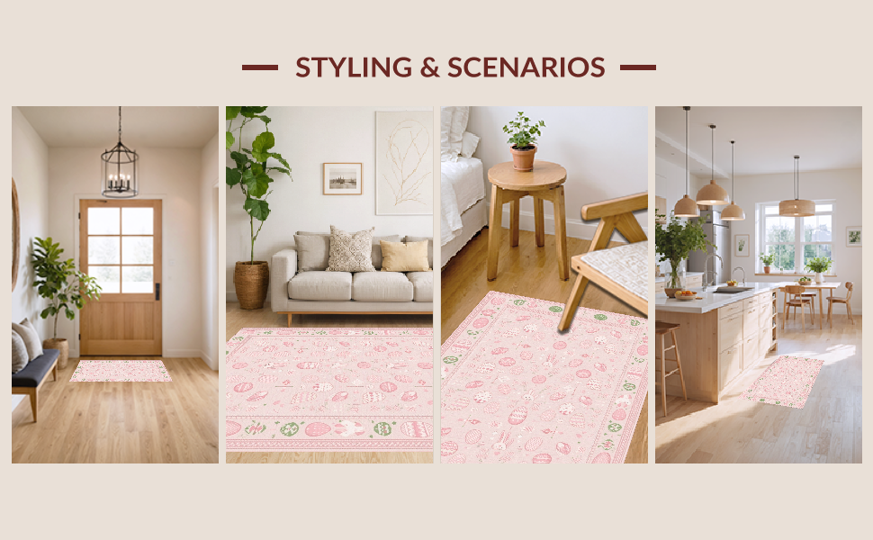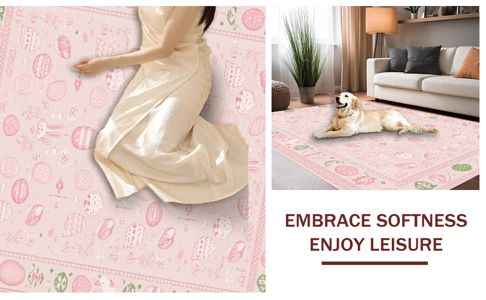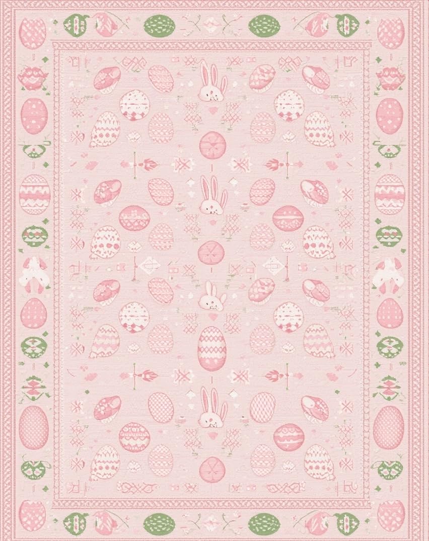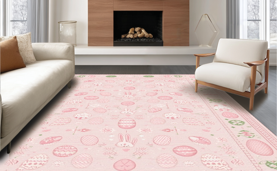 Ultra Soft Area Rug, Non Slip, Stain Resistant, Washable Area Rugs for Living Room, Bedroom, Lively Bunny and Floral Fusion(Pink) Overview: