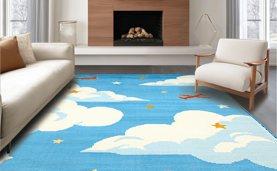 Ultra Soft Area Rug, Non Slip, Stain Resistant, Washable Area Rugs for Living Room, Bedroom, Lively Cartoon Sky Scene Composition(Blue) Overview: