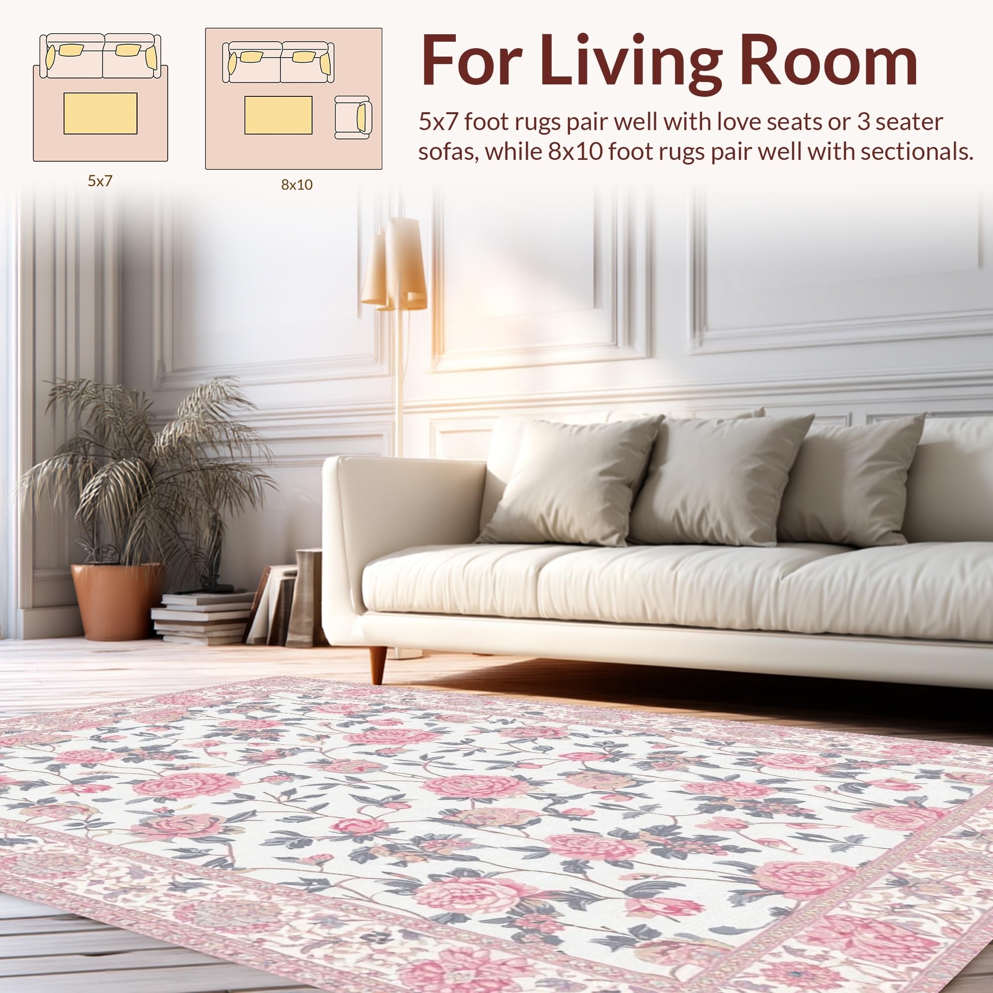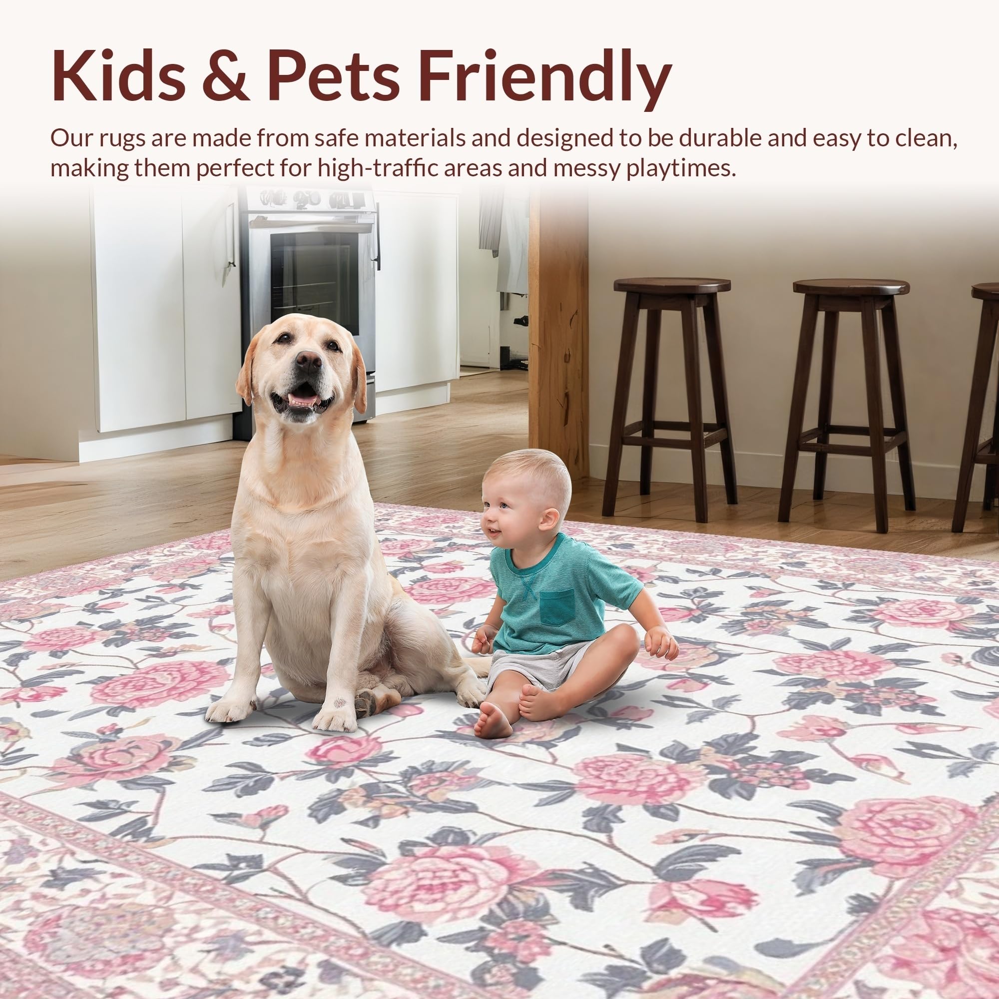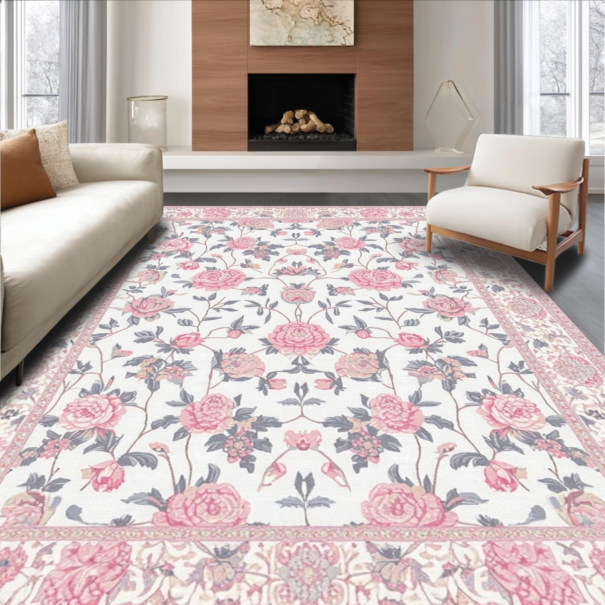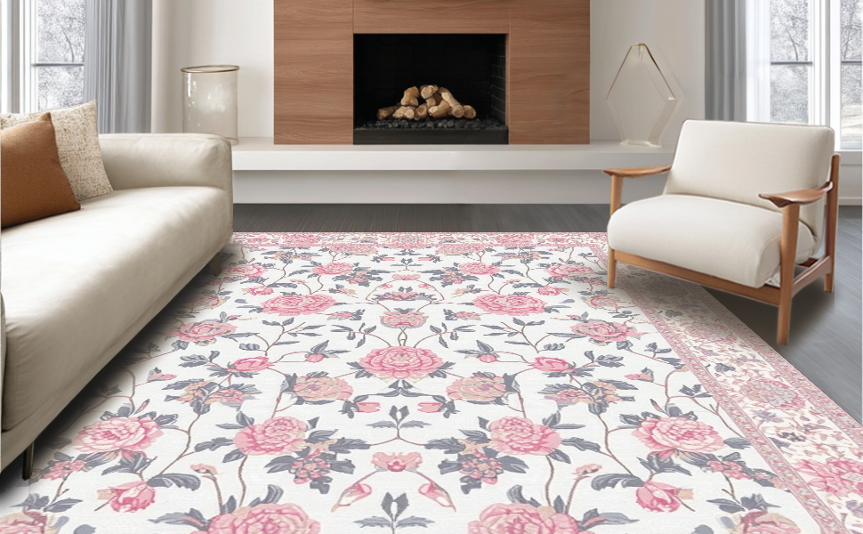 Ultra Soft Area Rug, Non Slip, Stain Resistant, Washable Area Rugs for Living Room, Bedroom, Lively Round Blossom Visual(White) Overview: