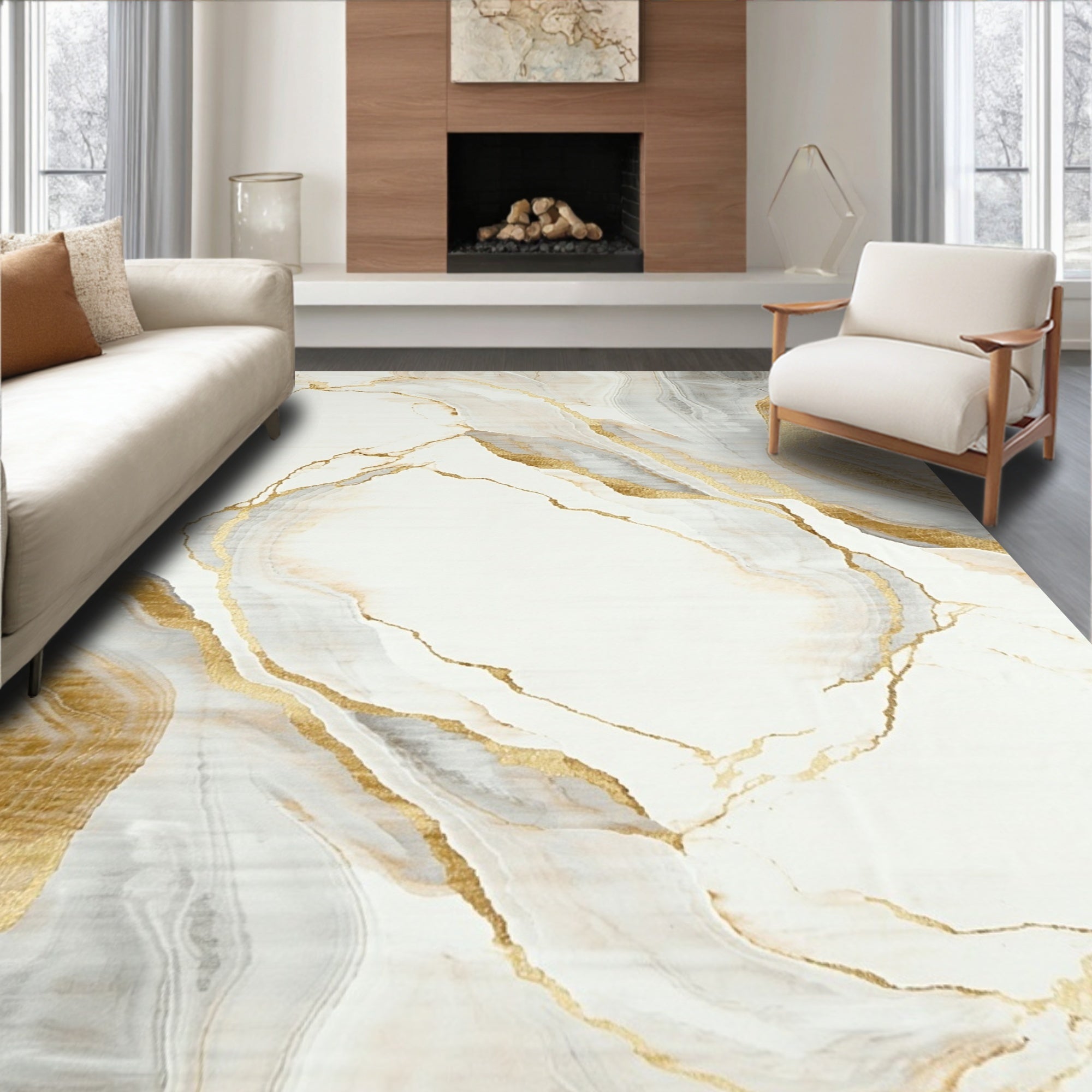 Flatwoven High Traffic Area Rug, Luxurious Beige Bathroom Abstract Marble Stone Design, Non Slip, Stain Resistant, Washable Area Rugs for Living Room, Bedroom (White) Overview: