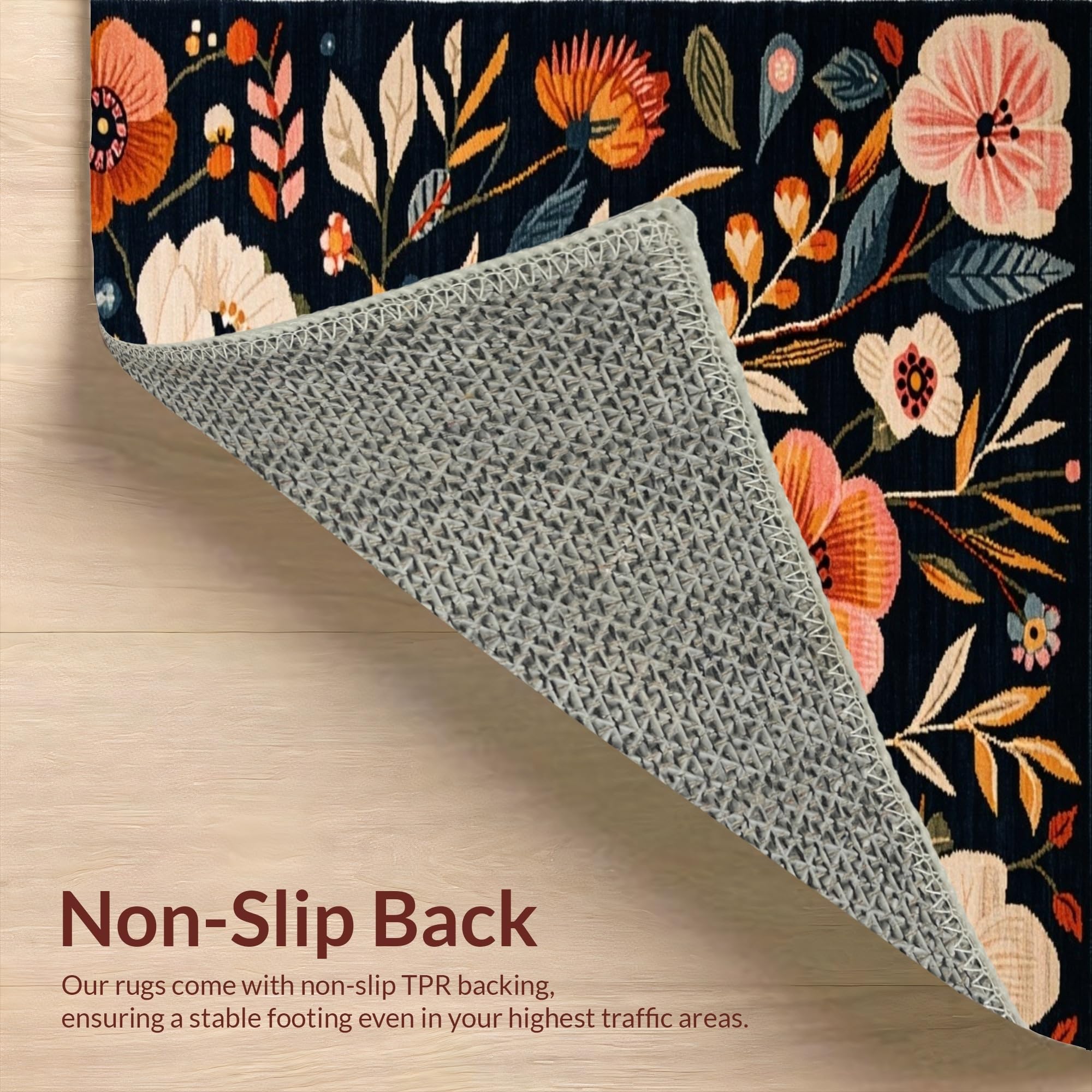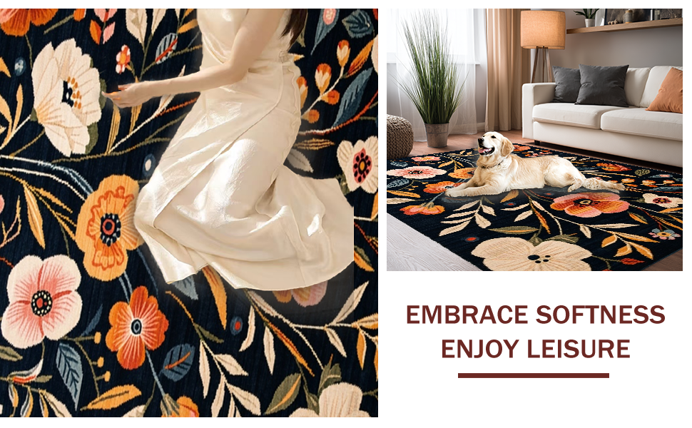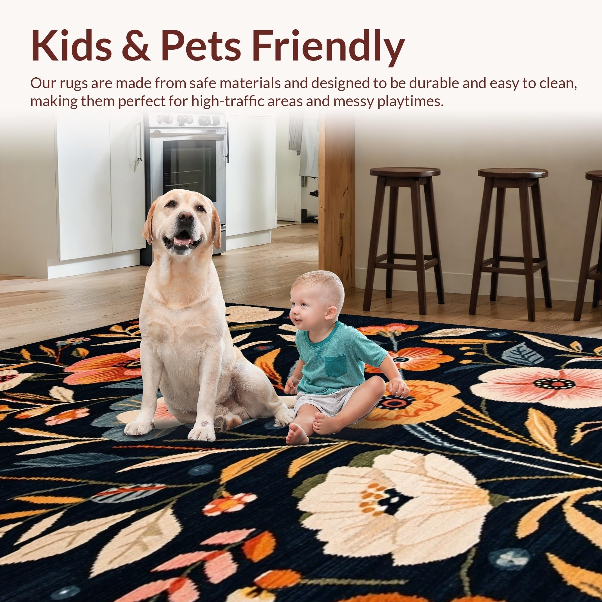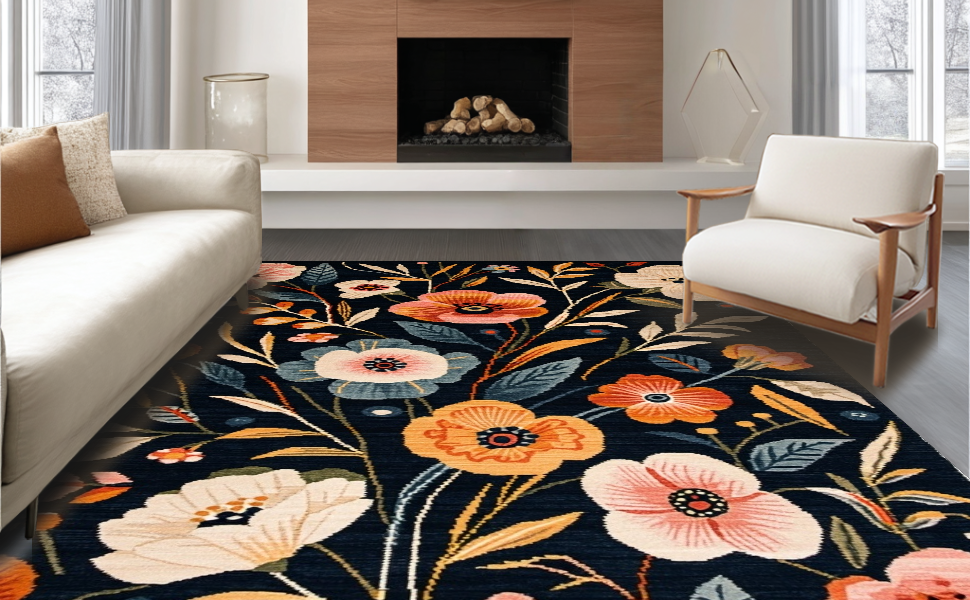 Ultra Soft Area Rug, Non Slip, Stain Resistant, Washable Area Rugs for Living Room, Bedroom, Luxurious Floral Accents in Dark(Black) Overview: