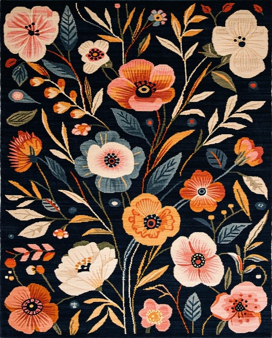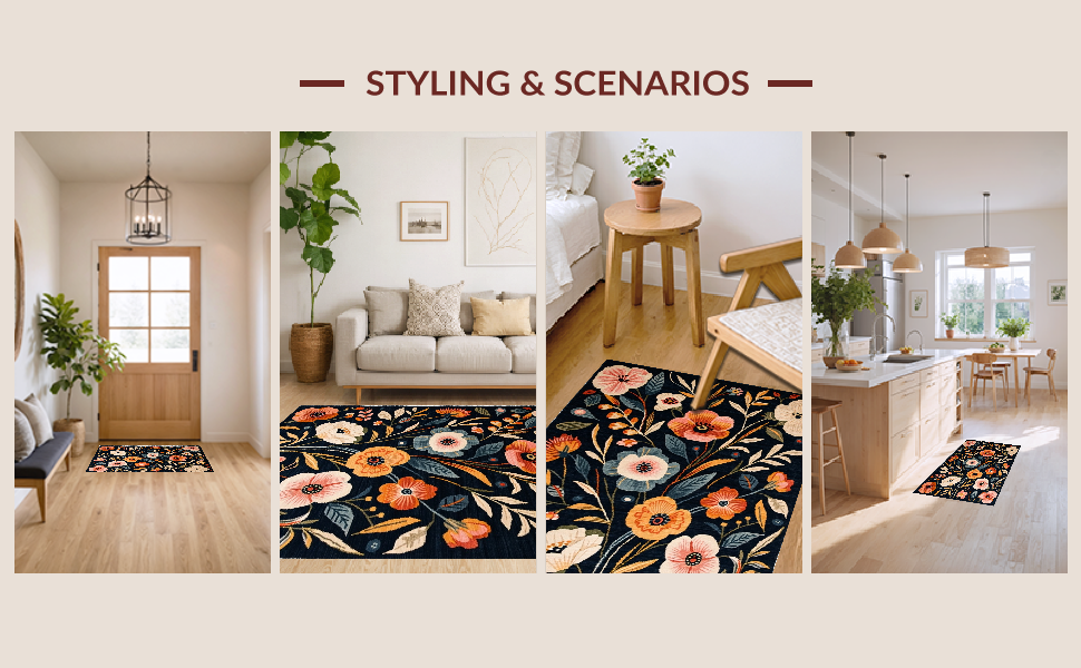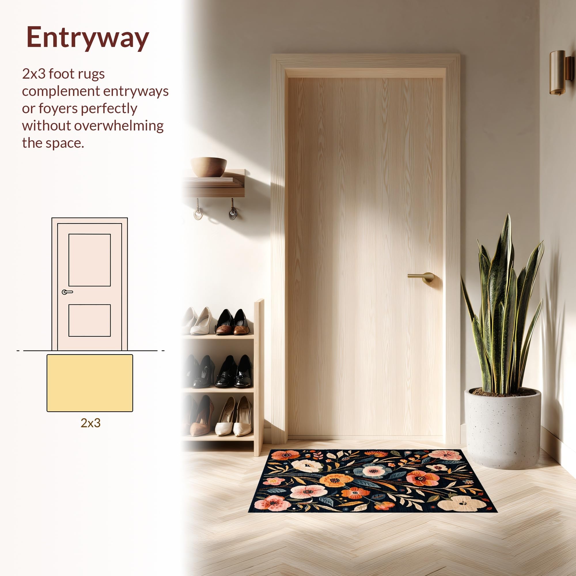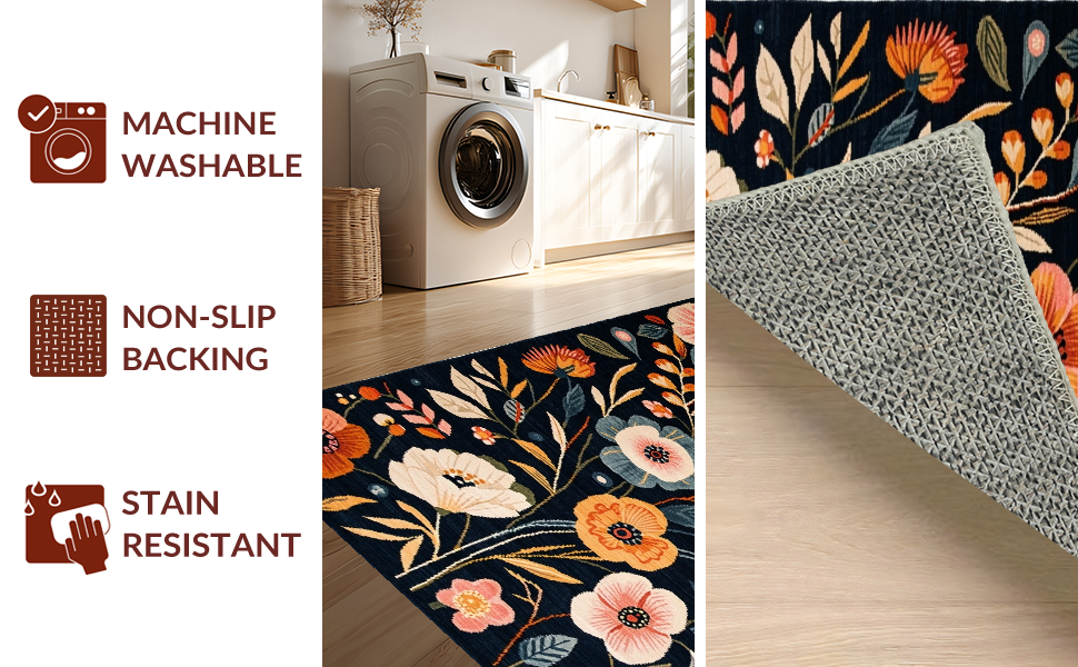 Ultra Soft Area Rug, Non Slip, Stain Resistant, Washable Area Rugs for Living Room, Bedroom, Luxurious Floral Accents in Dark(Black) Overview: