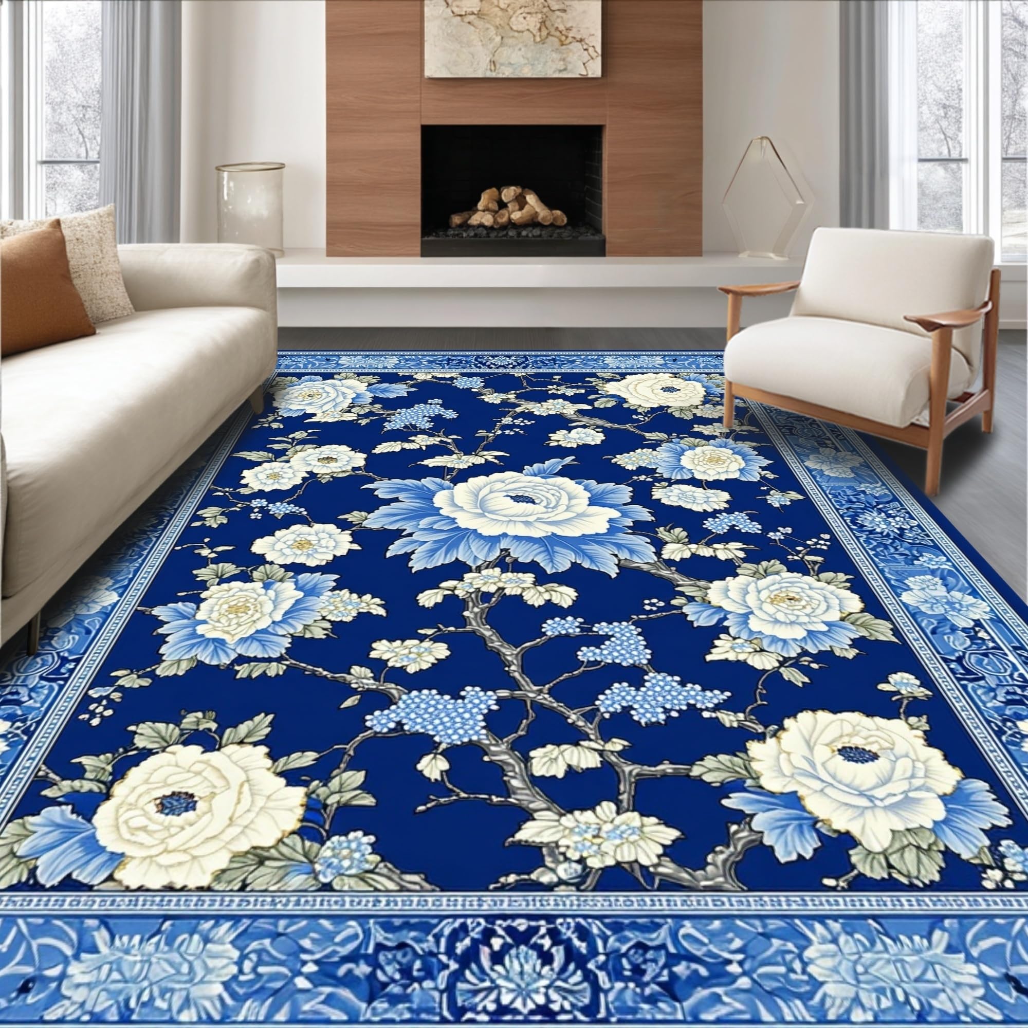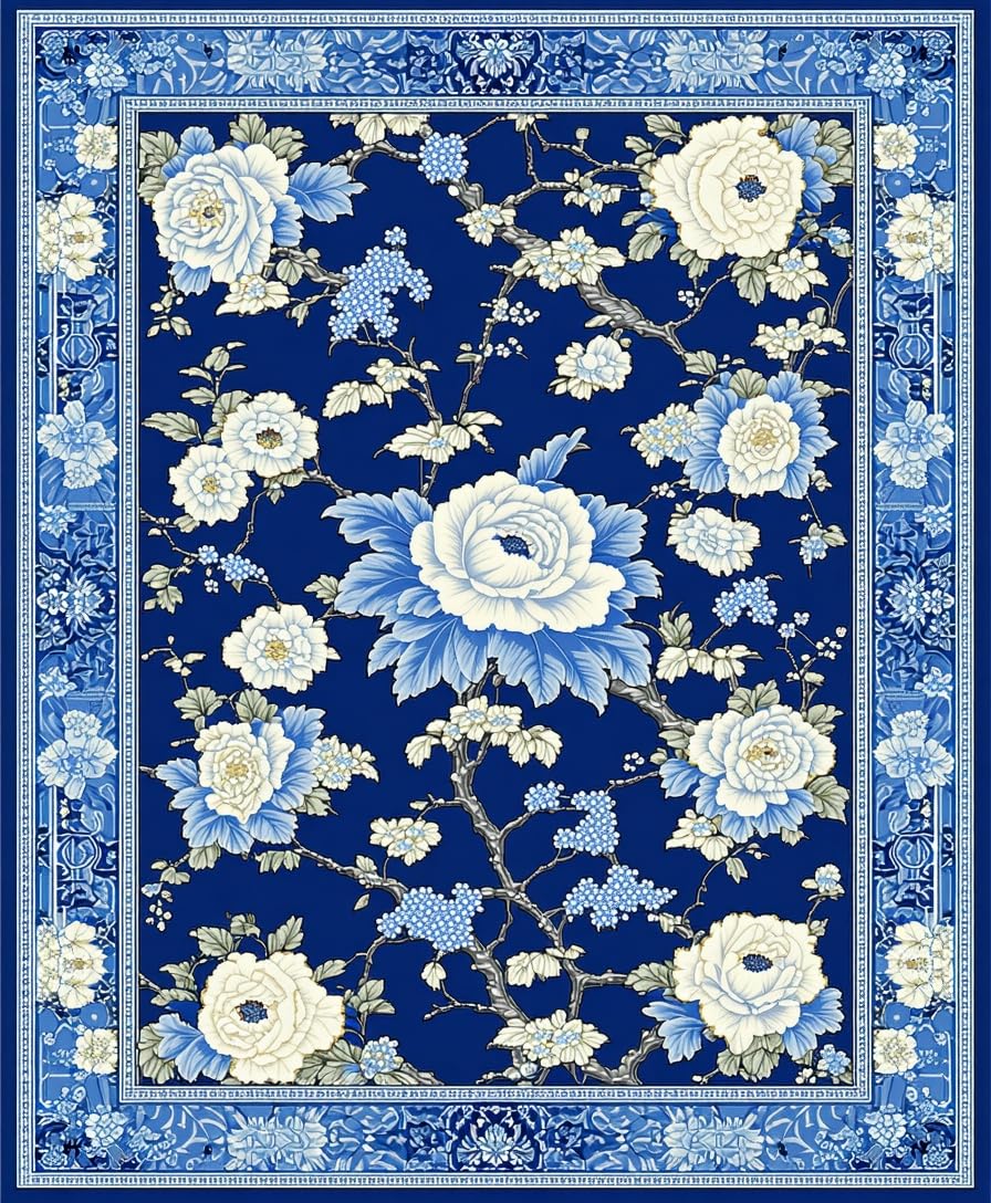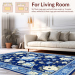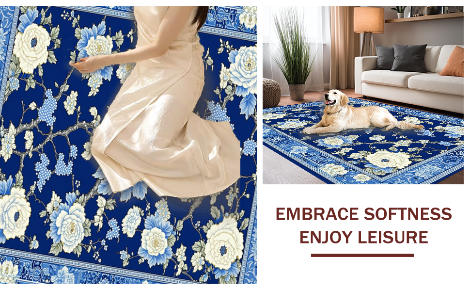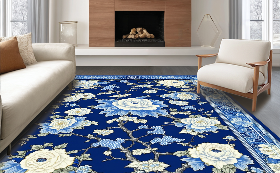 Ultra Soft Area Rug, Non Slip, Stain Resistant, Washable Area Rugs for Living Room, Bedroom, Luxurious Porcelain Inspired Design Elements(Blue) Overview: