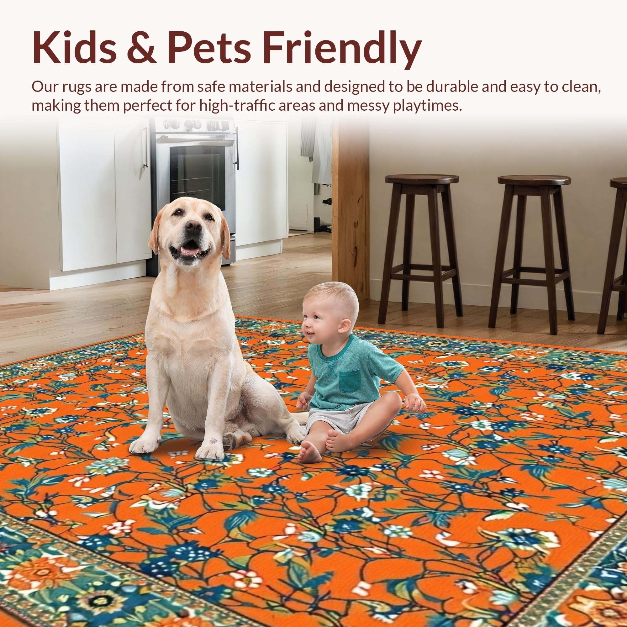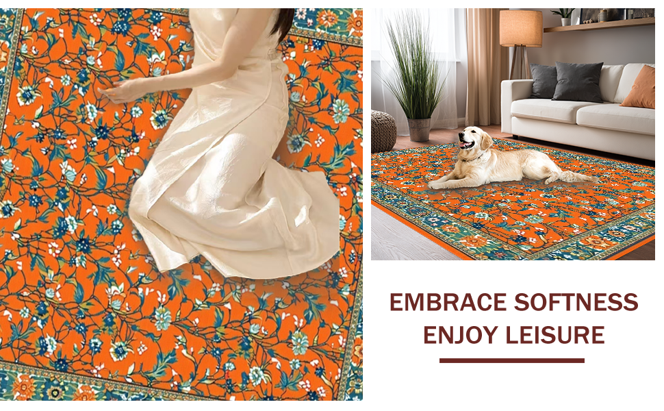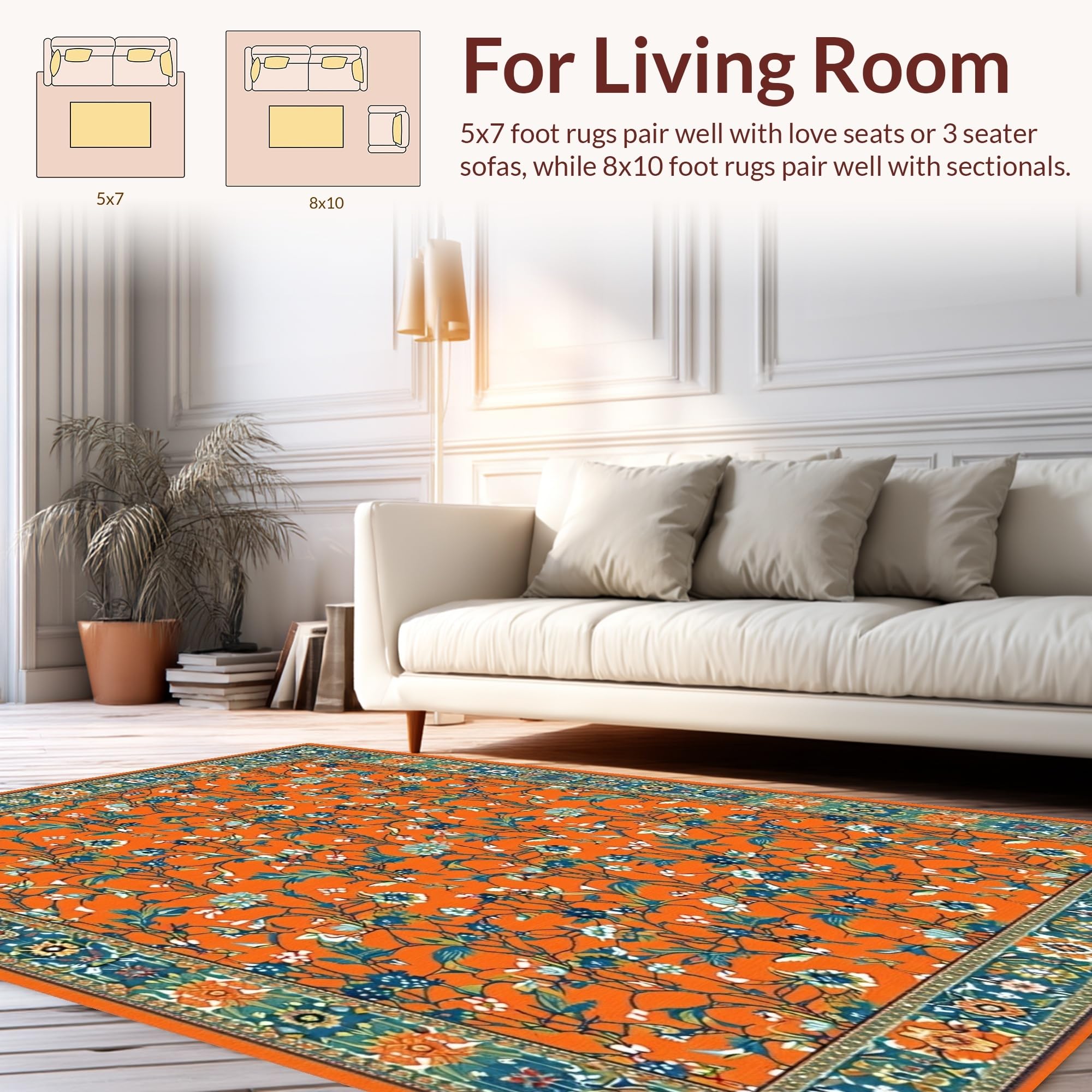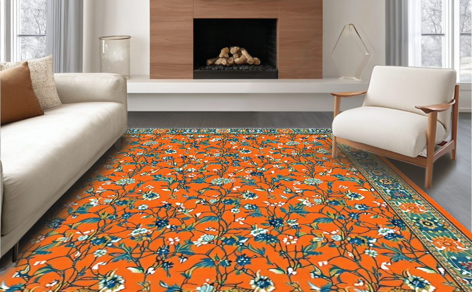 Ultra Soft Area Rug, Non Slip, Stain Resistant, Washable Area Rugs for Living Room, Bedroom, Luxurious Textured Garden Motif(Orange) Overview: