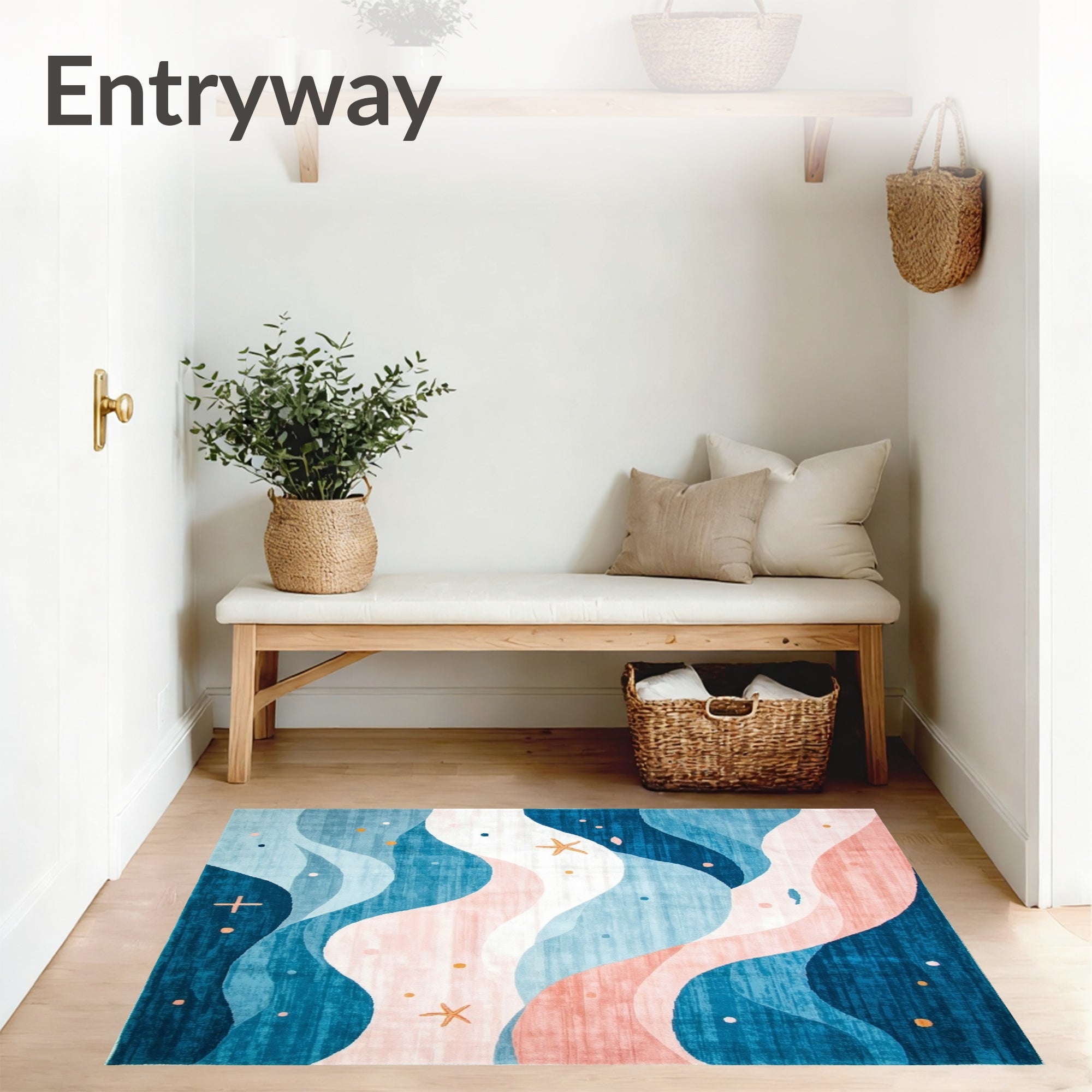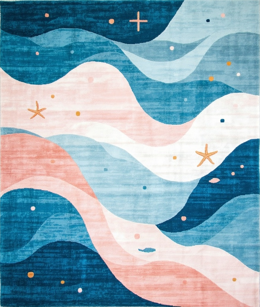 Flatwoven High Traffic Area Rug, Marine Life Abstract with Pastel Waves and Sea Creature Shapes, Non Slip, Stain Resistant, Washable Area Rugs for Living Room, Bedroom (Blue) Overview:
