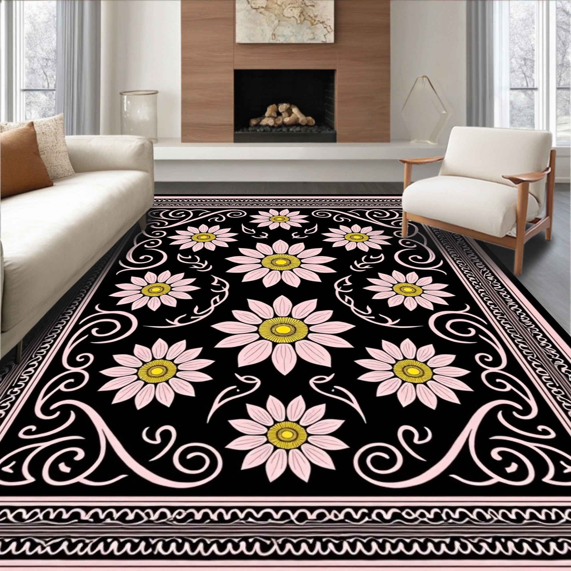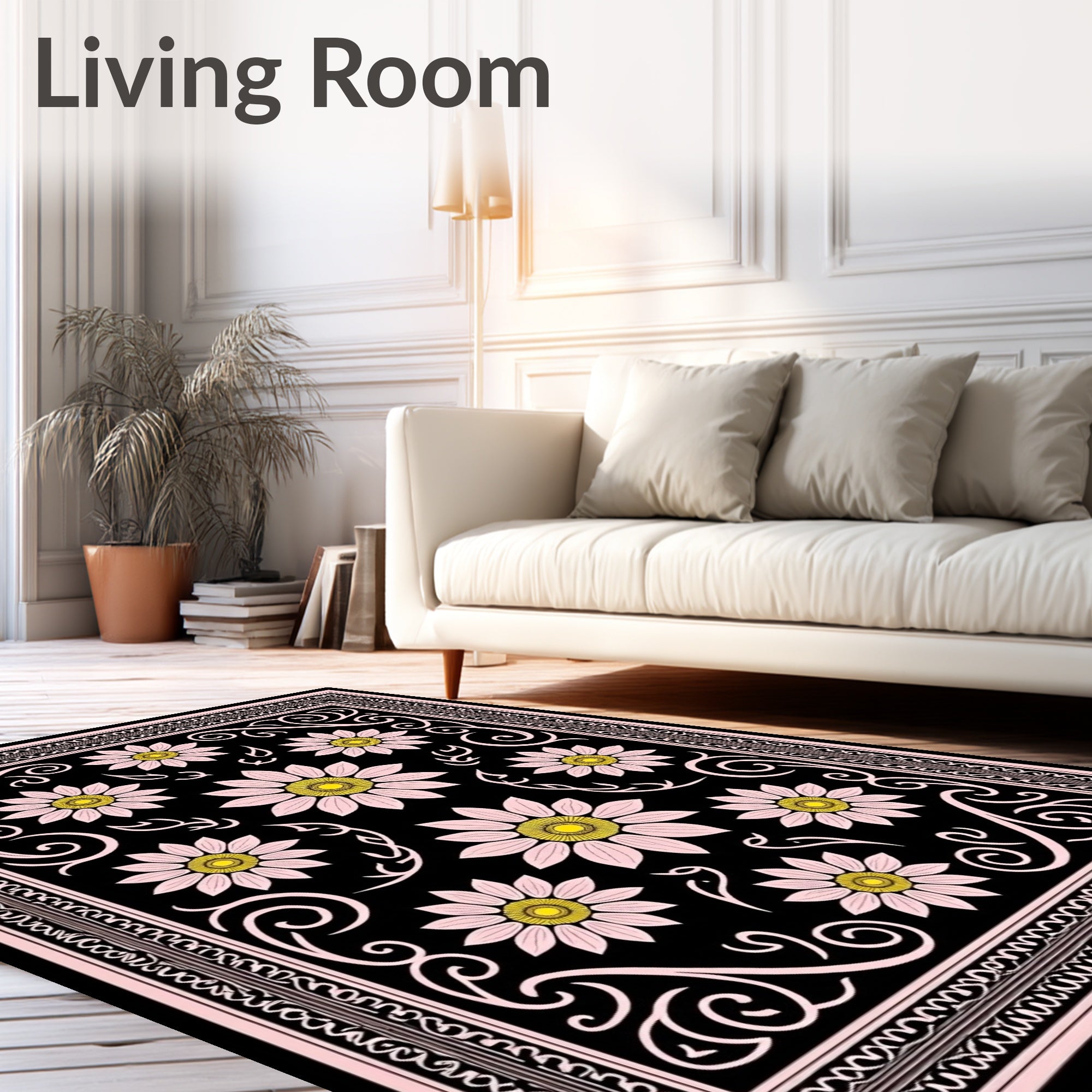 Ultra Soft Area Rug, Non Slip, Stain Resistant, Washable Area Rugs for Living Room, Bedroom, Meadow Bloom Trellis Motif with Stylized Petals and Interlocking Vines(Black) Overview: