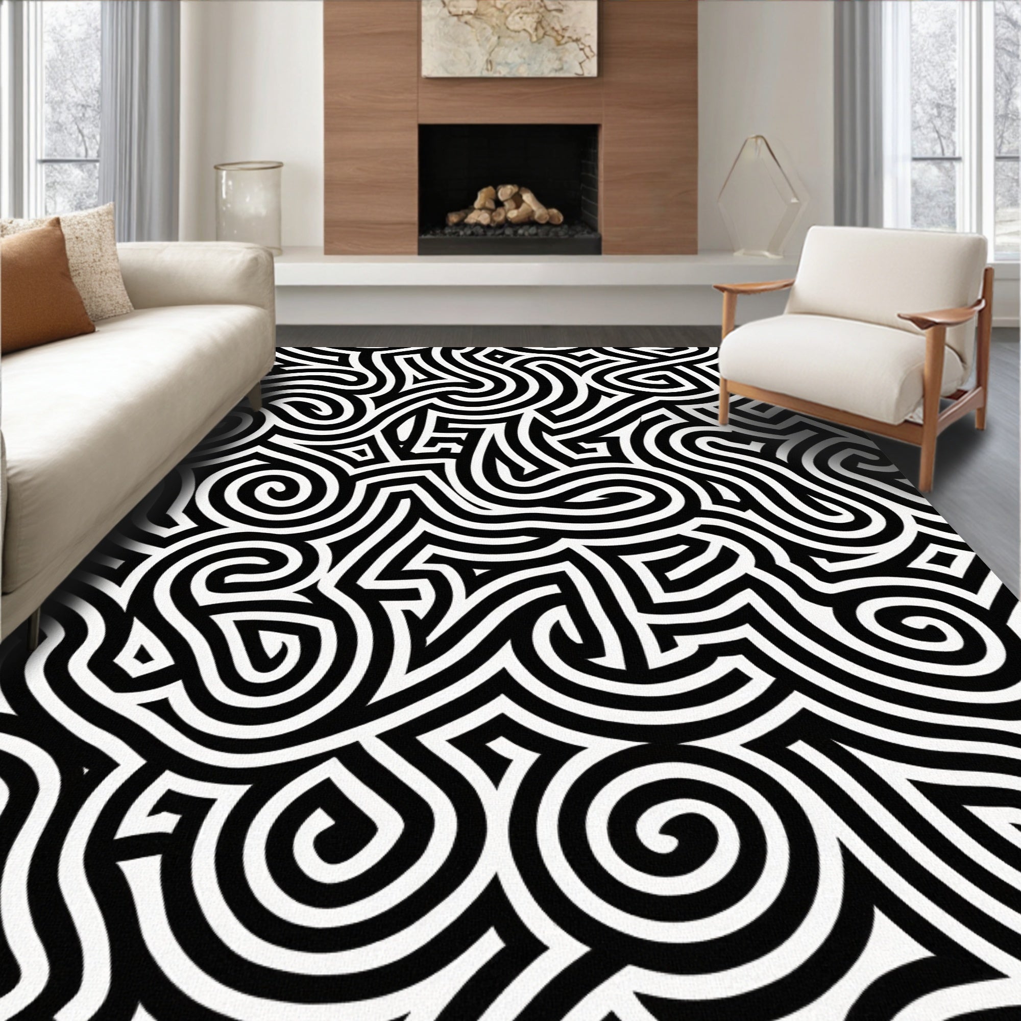 Ultra Soft Area Rug, Non Slip, Stain Resistant, Washable Area Rugs for Living Room, Bedroom, Midnight Cascade Interlocking Maze Spiral Elegant Minimalist(Black) Overview: