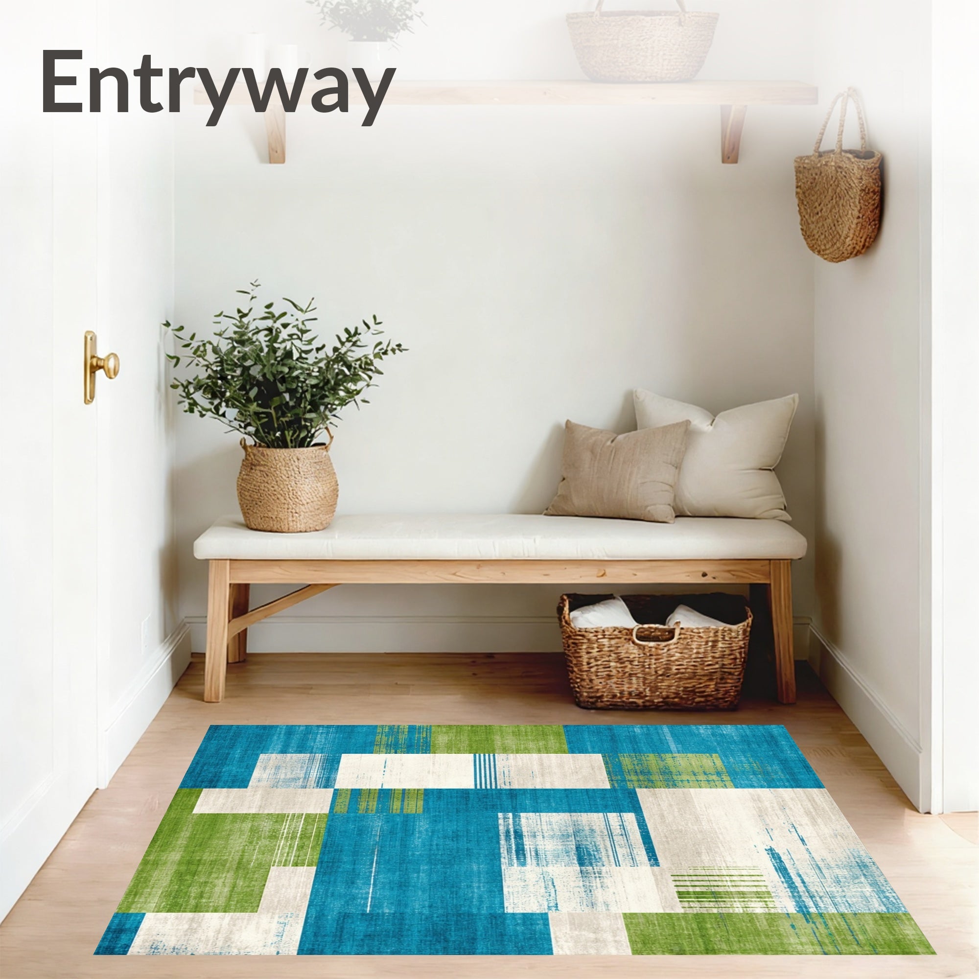 Ultra Soft Area Rug, Non Slip, Stain Resistant, Washable Area Rugs for Living Room, Bedroom, Minimalist Non Shedding with Distressed Blue Green and Beige Check(Blue) Overview: