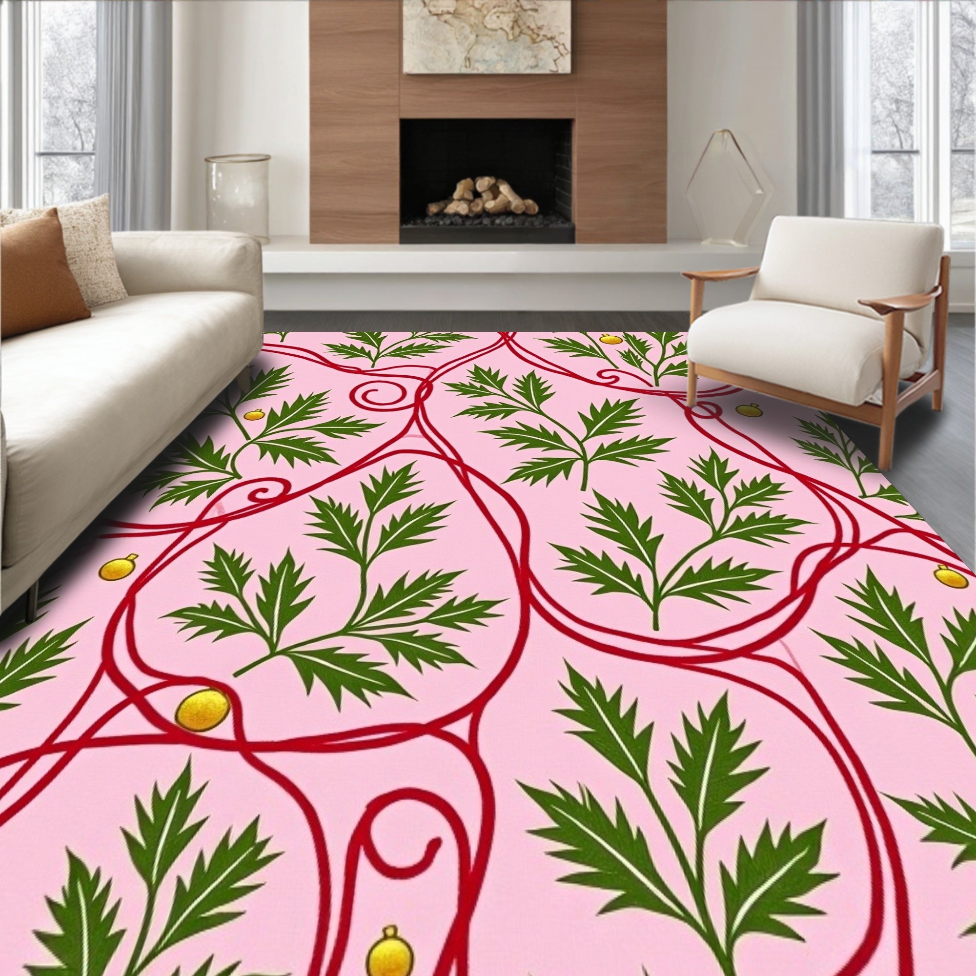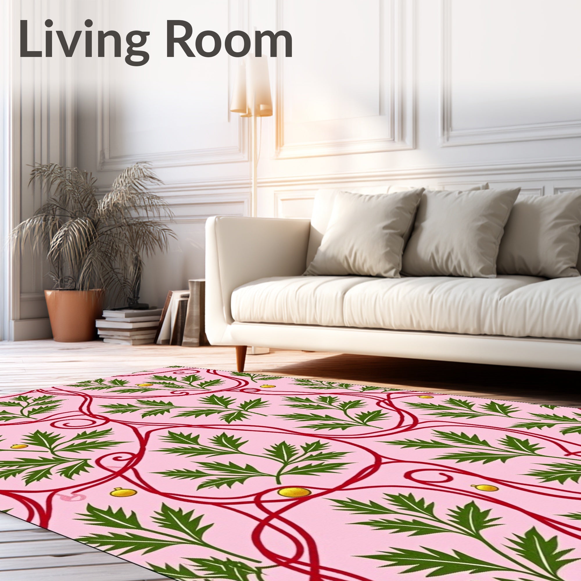 Ultra Soft Area Rug, Non Slip, Stain Resistant, Washable Area Rugs for Living Room, Bedroom, Mistletoe Cluster with Ribbon Swirls and Festive Bauble Detailing Arc Shape(Pink) Overview: