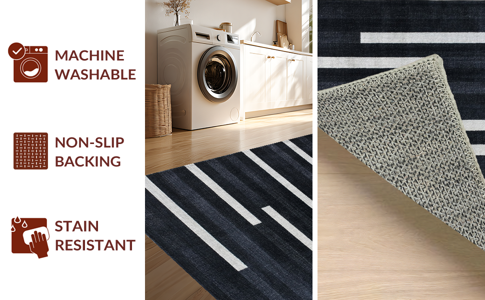 Ultra Soft Area Rug, Non Slip, Stain Resistant, Washable Area Rugs for Living Room, Bedroom, Modern Minimalist Striped Woven Rug With Dramatic Contrast Design(Black) Overview:
