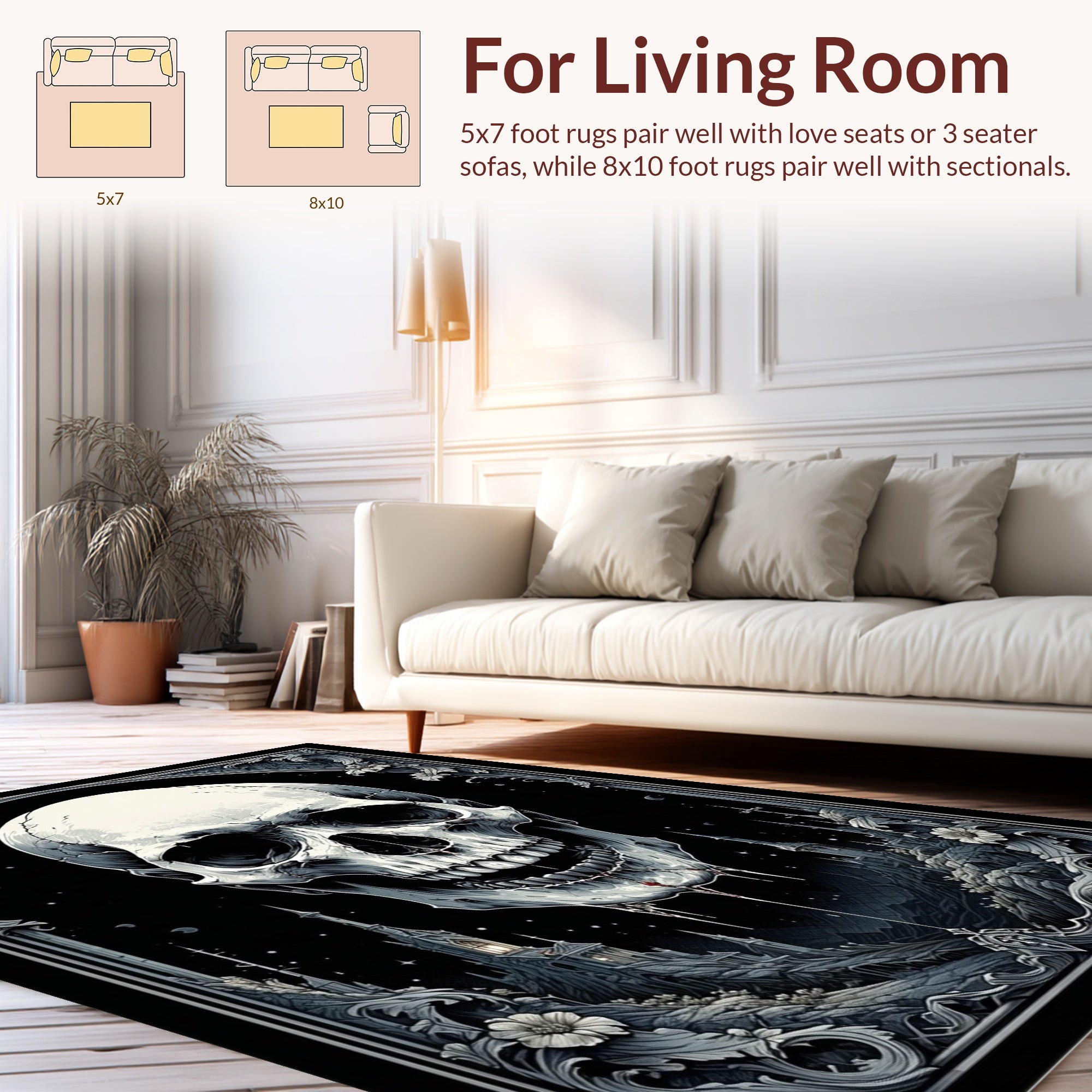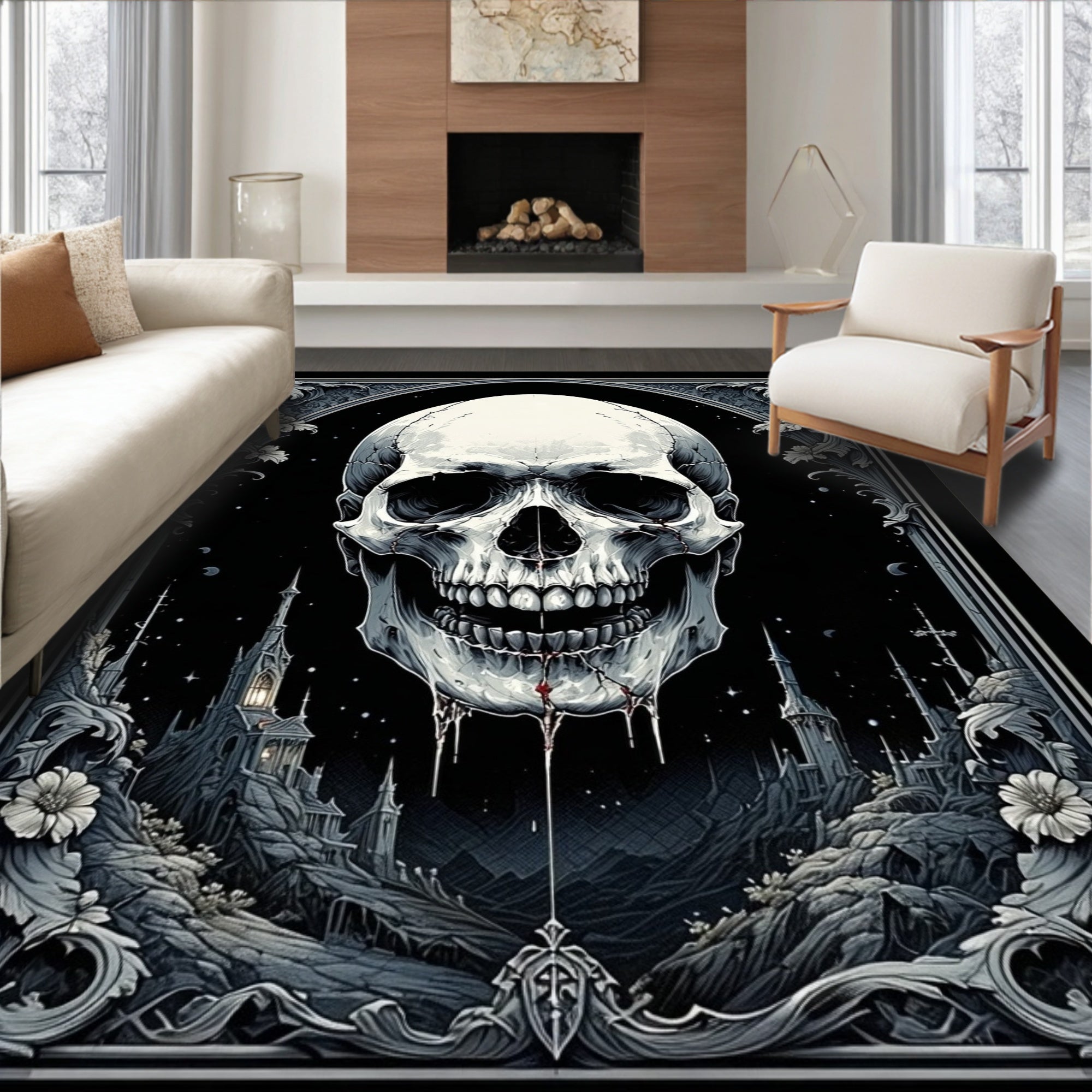 Flatwoven High Traffic Area Rug, Mysterious Floral and Skull, Non Slip, Stain Resistant, Washable Area Rugs for Living Room, Bedroom (Black) Overview: