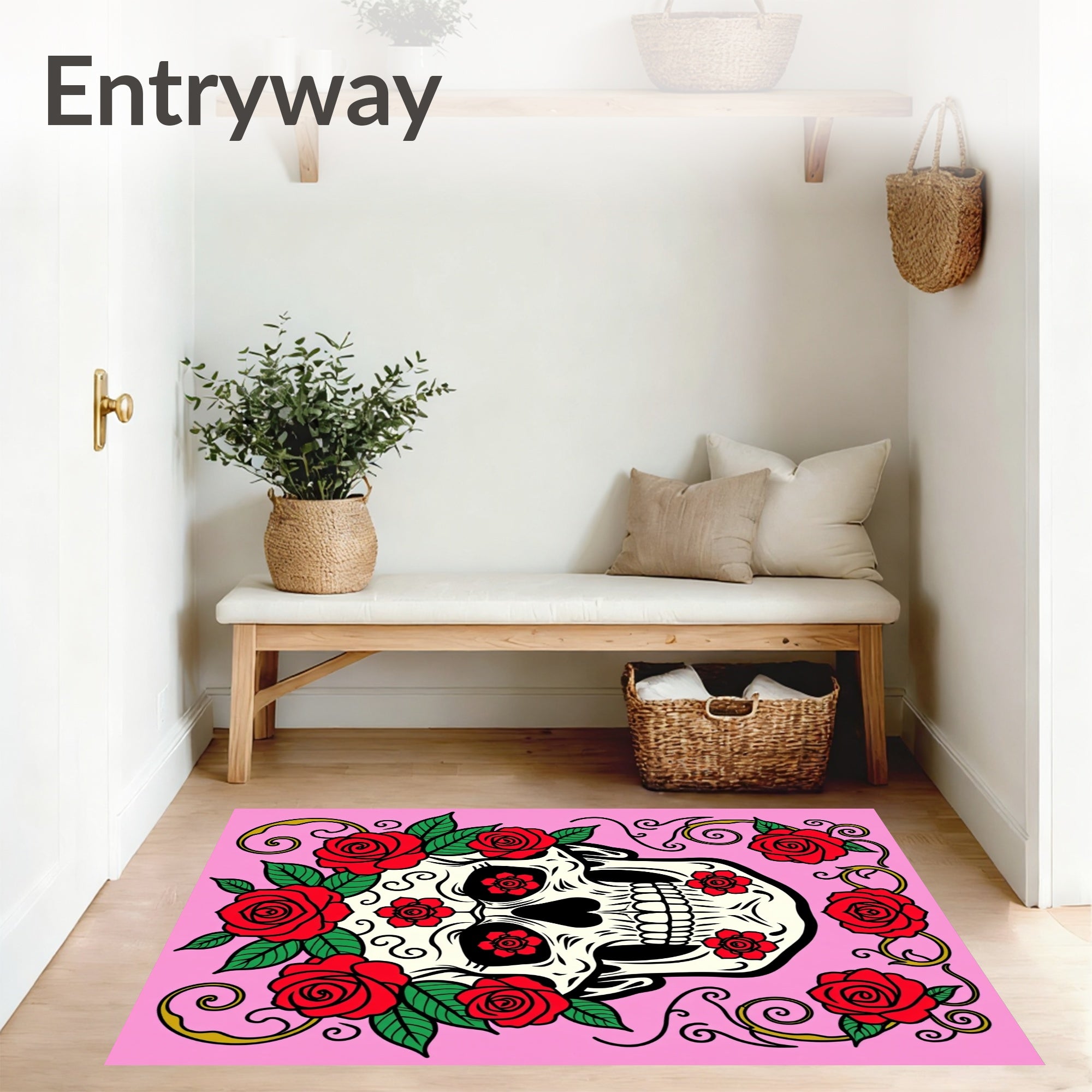 Ultra Soft Area Rug, Non Slip, Stain Resistant, Washable Area Rugs for Living Room, Bedroom, Mystical Afterlife Floral Cranium Decorative Artisan Creation(Pink) Overview: