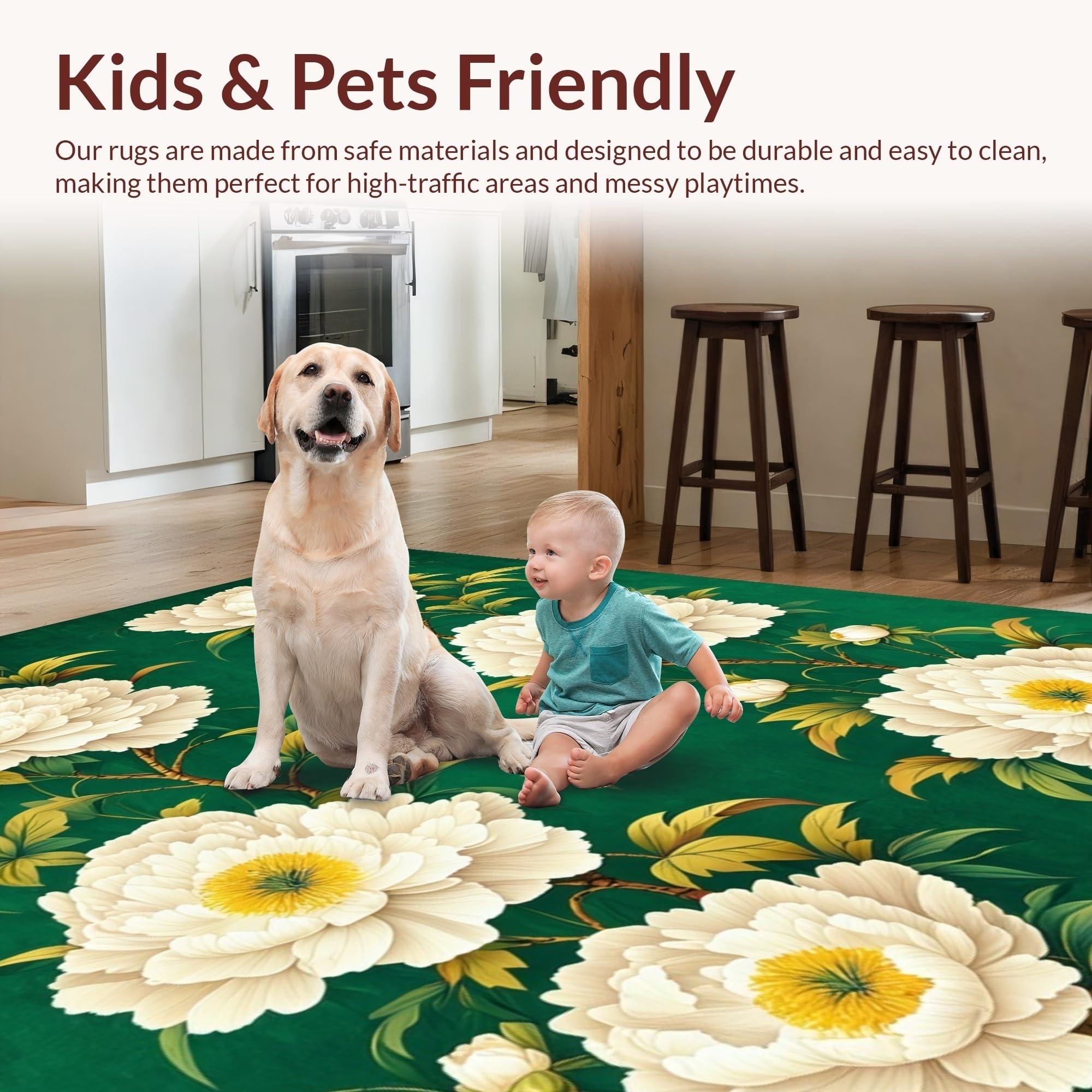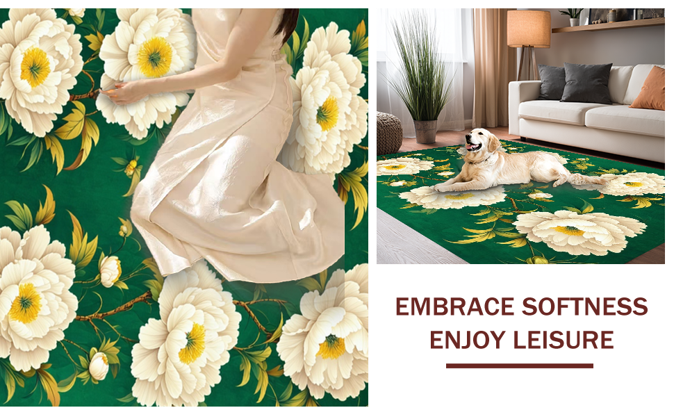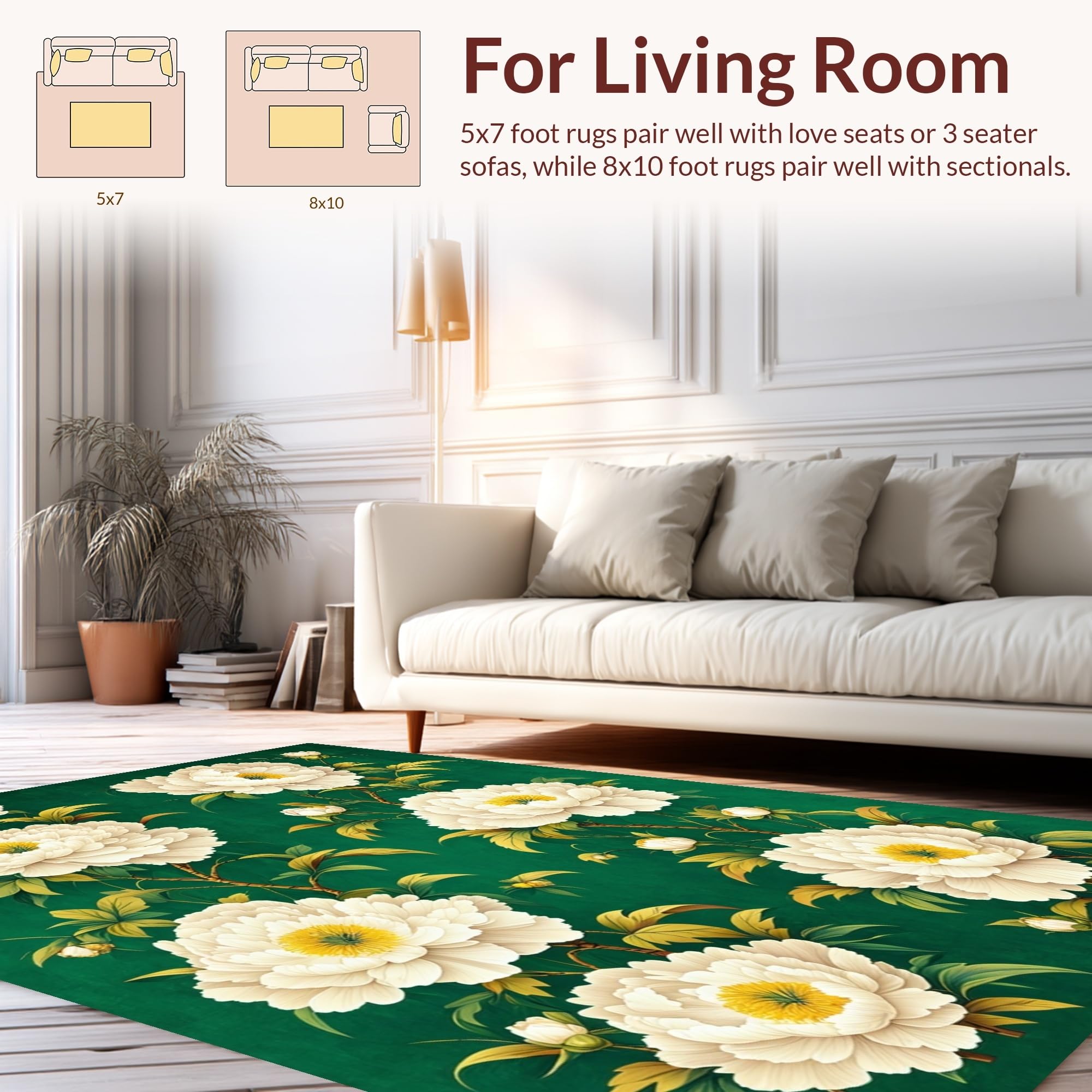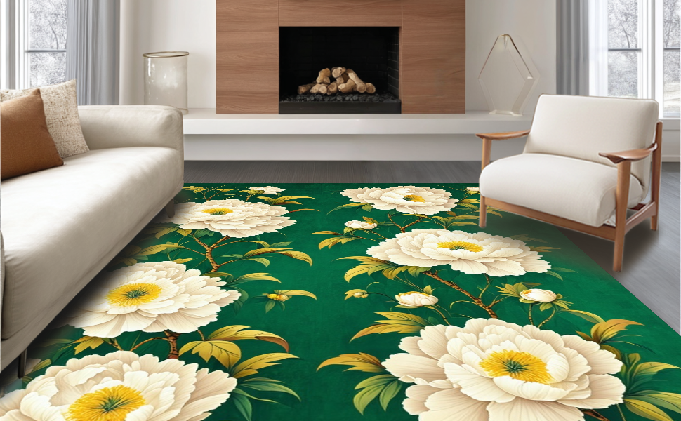 Ultra Soft Area Rug, Non Slip, Stain Resistant, Washable Area Rugs for Living Room, Bedroom, Naturalistic Peony Blossom Style(Green) Overview: