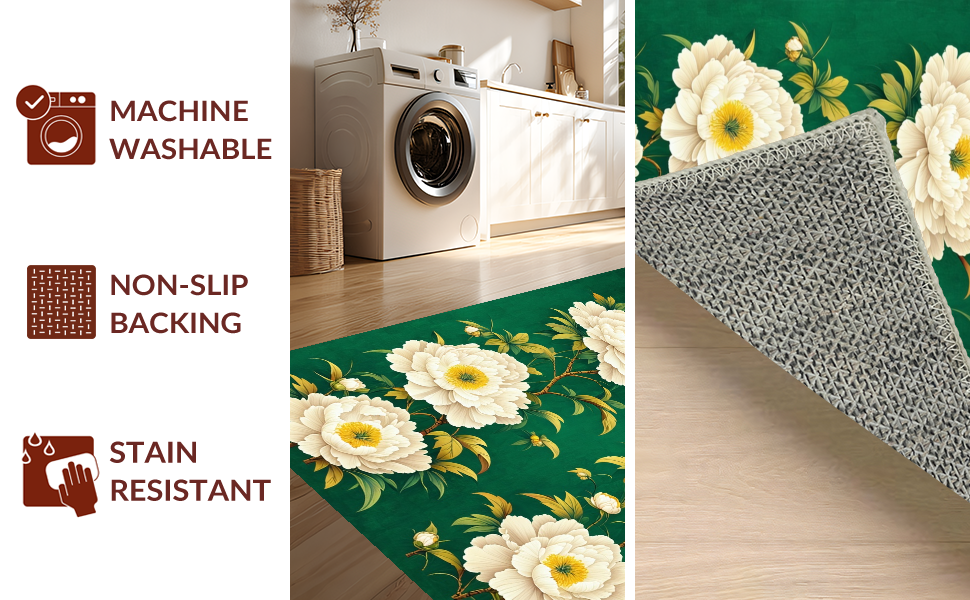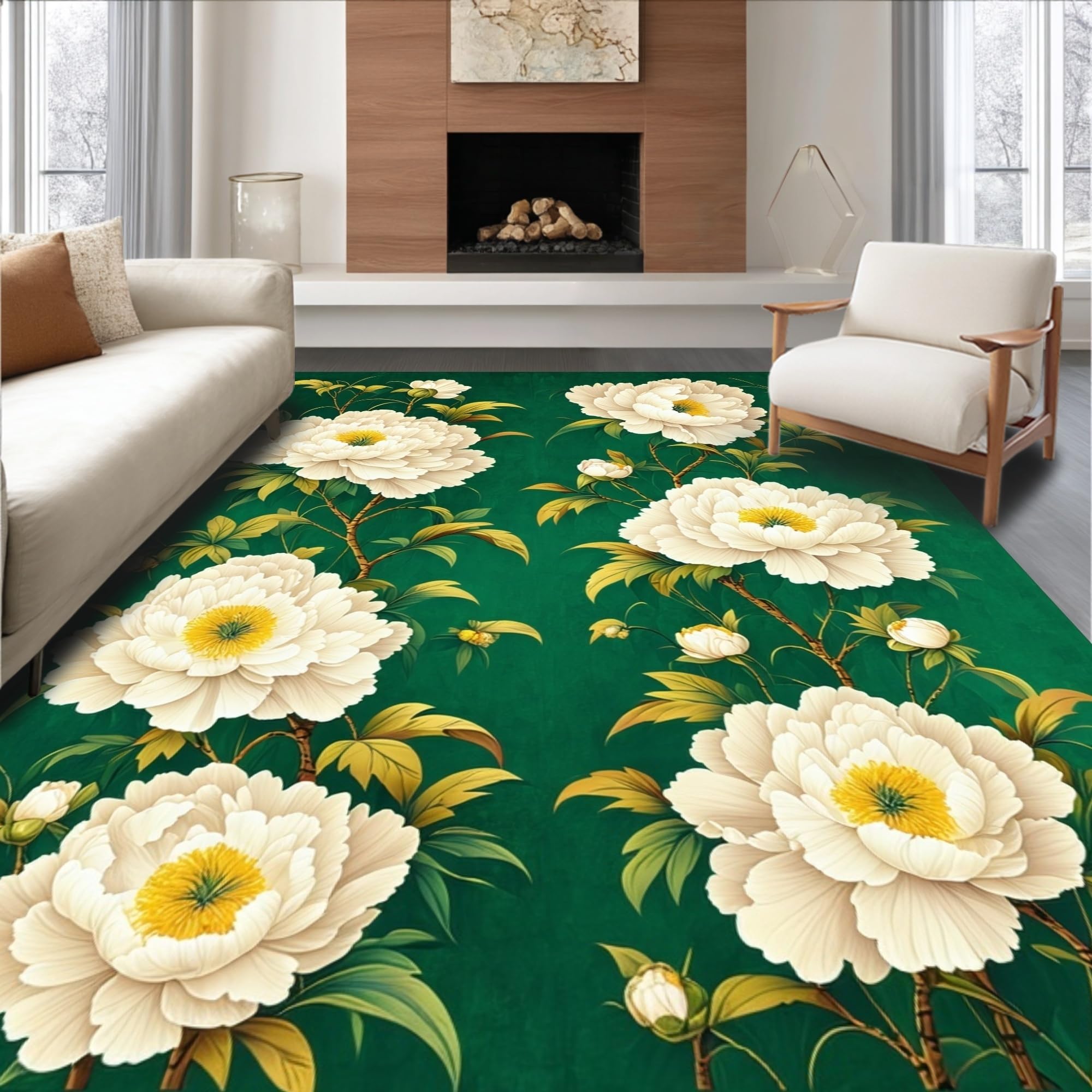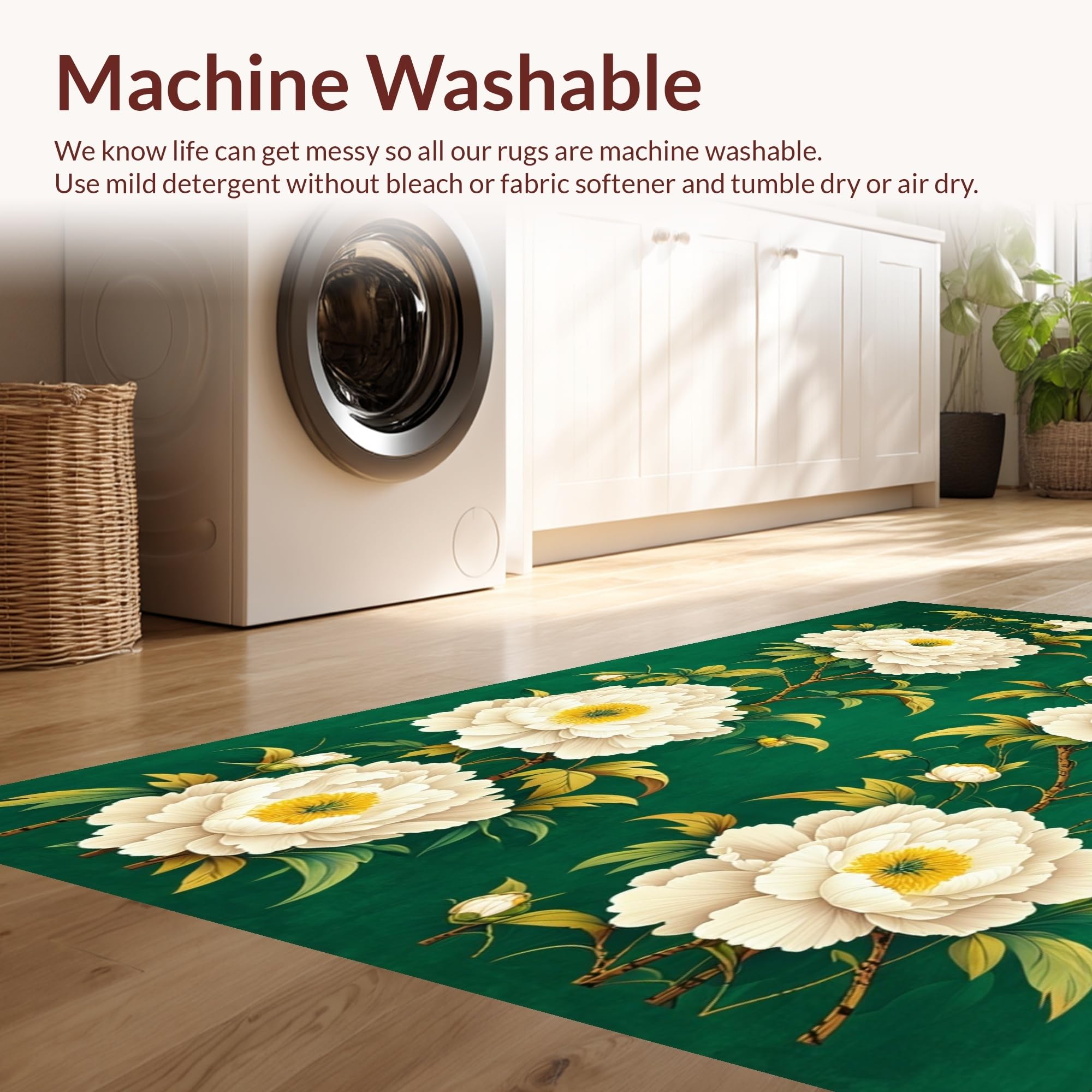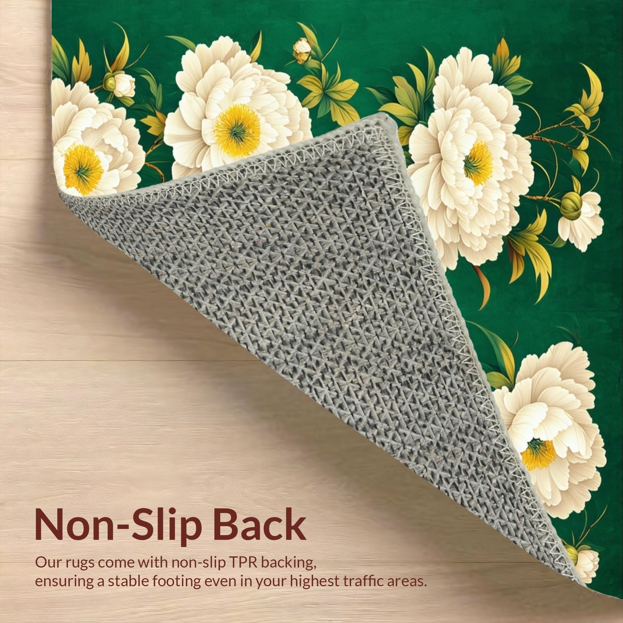 Ultra Soft Area Rug, Non Slip, Stain Resistant, Washable Area Rugs for Living Room, Bedroom, Naturalistic Peony Blossom Style(Green) Overview: