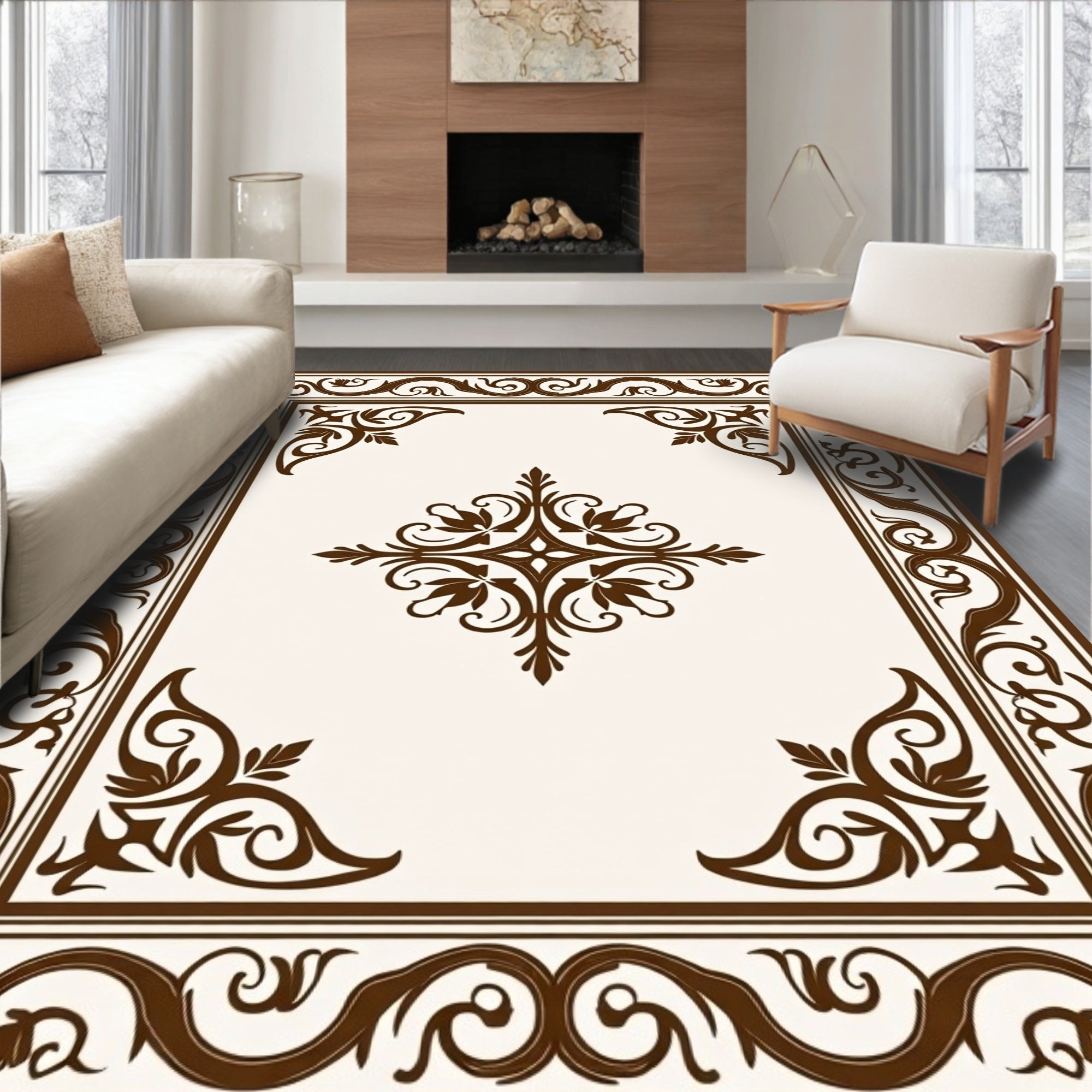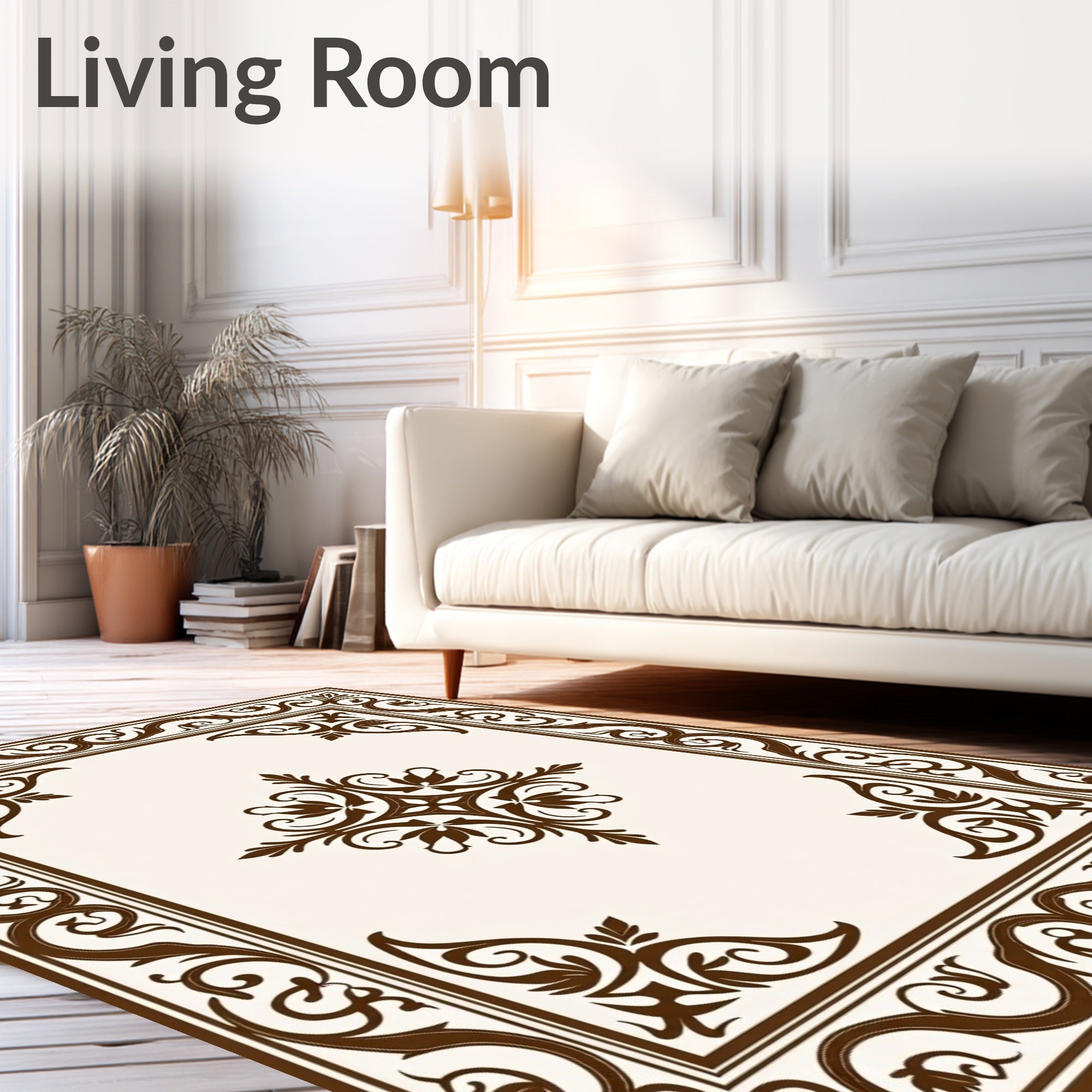 Flatwoven High Traffic Area Rug, Noble Baroque Scrollwork Arrangement Jeweled, Non Slip, Stain Resistant, Washable Area Rugs for Living Room, Bedroom (Brown) Overview: