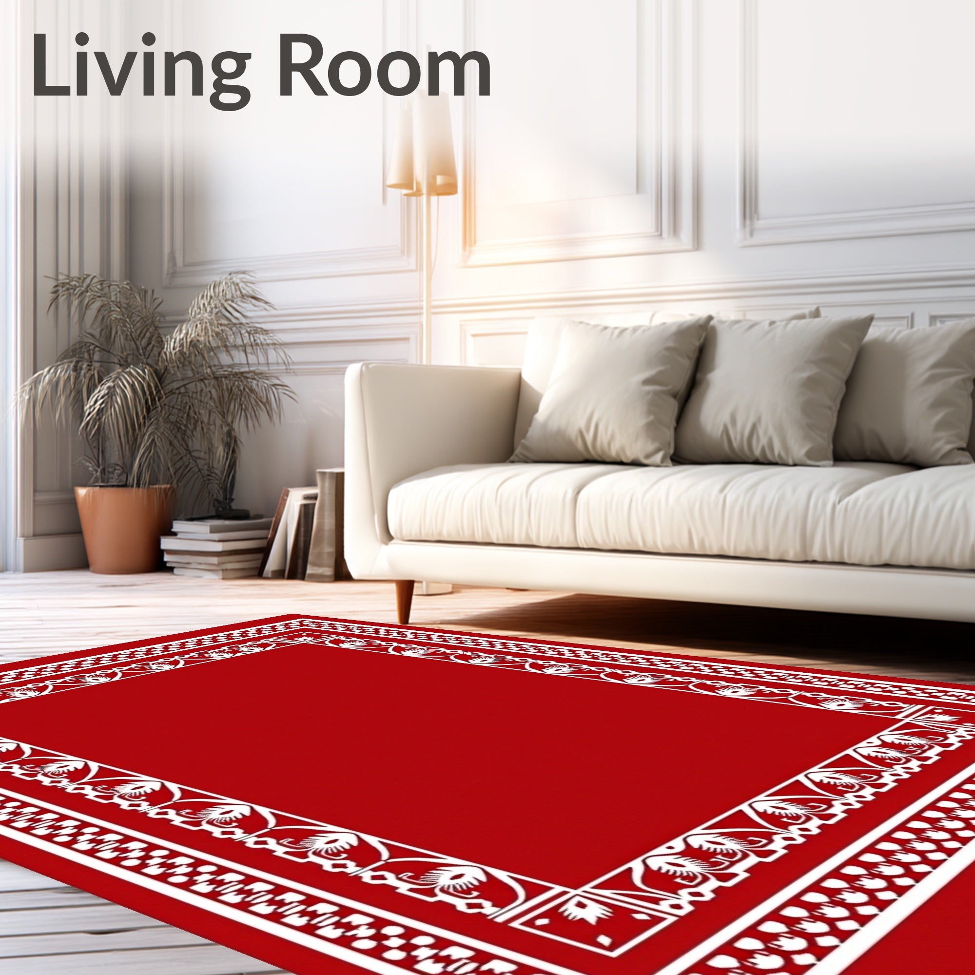 Ultra Soft Area Rug, Non Slip, Stain Resistant, Washable Area Rugs for Living Room, Bedroom, Nordic Inspired Reindeer with Interlocking Snowflake Bands(Red) Overview: