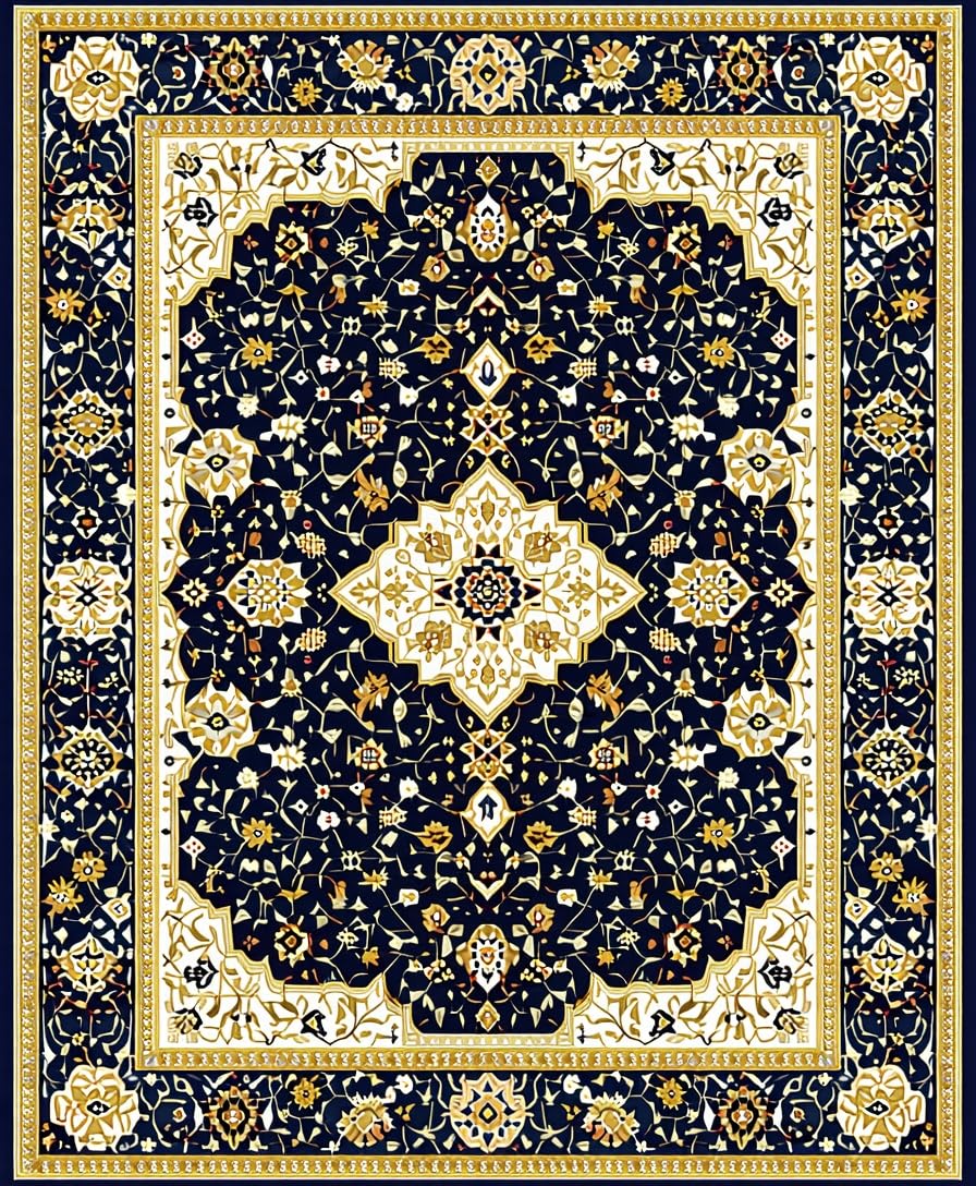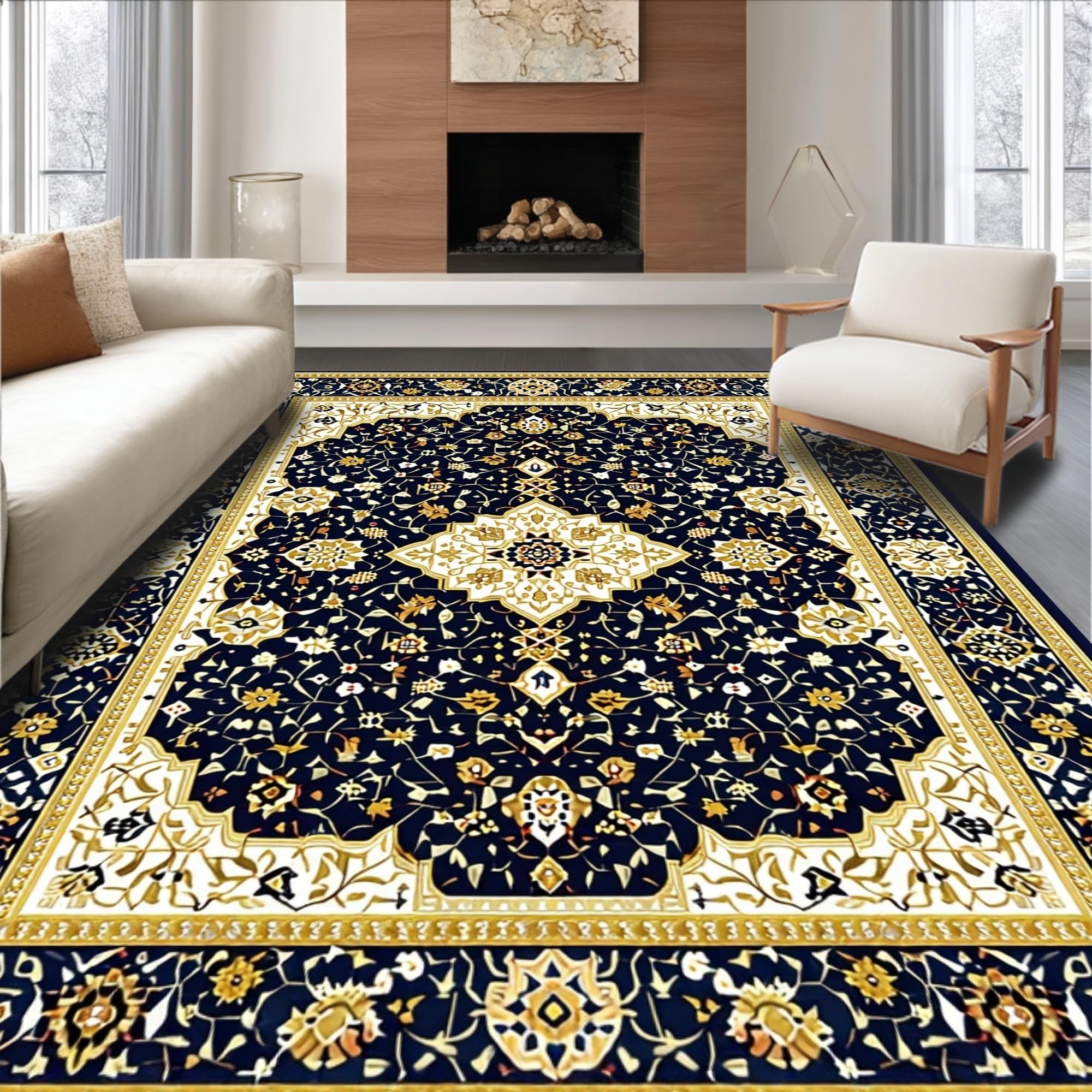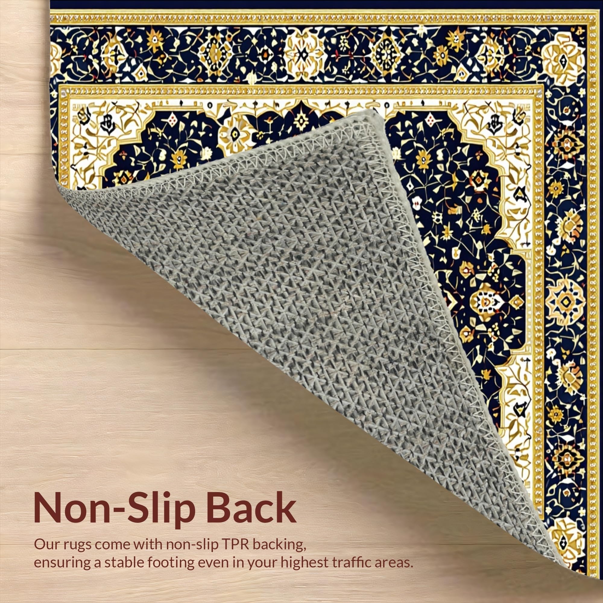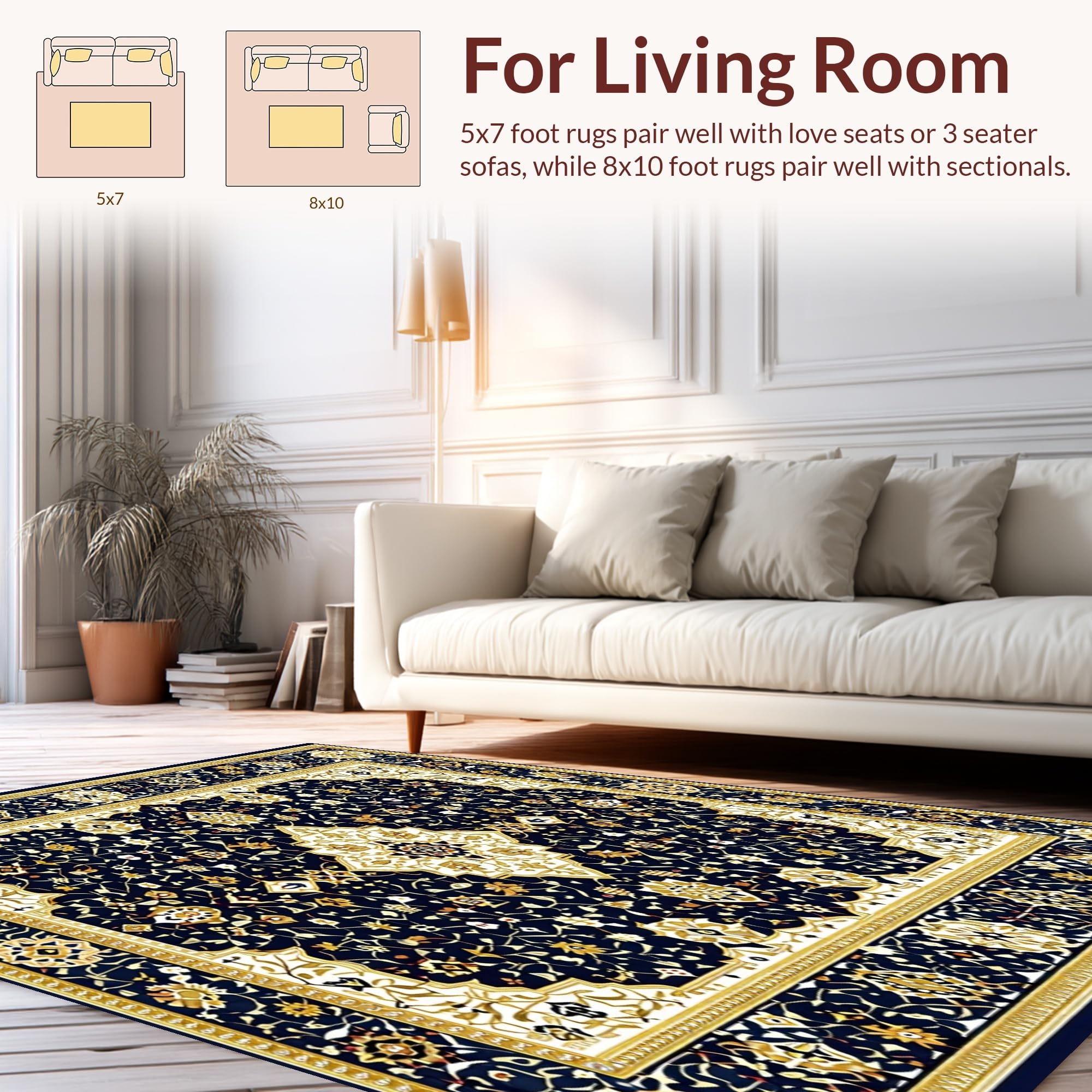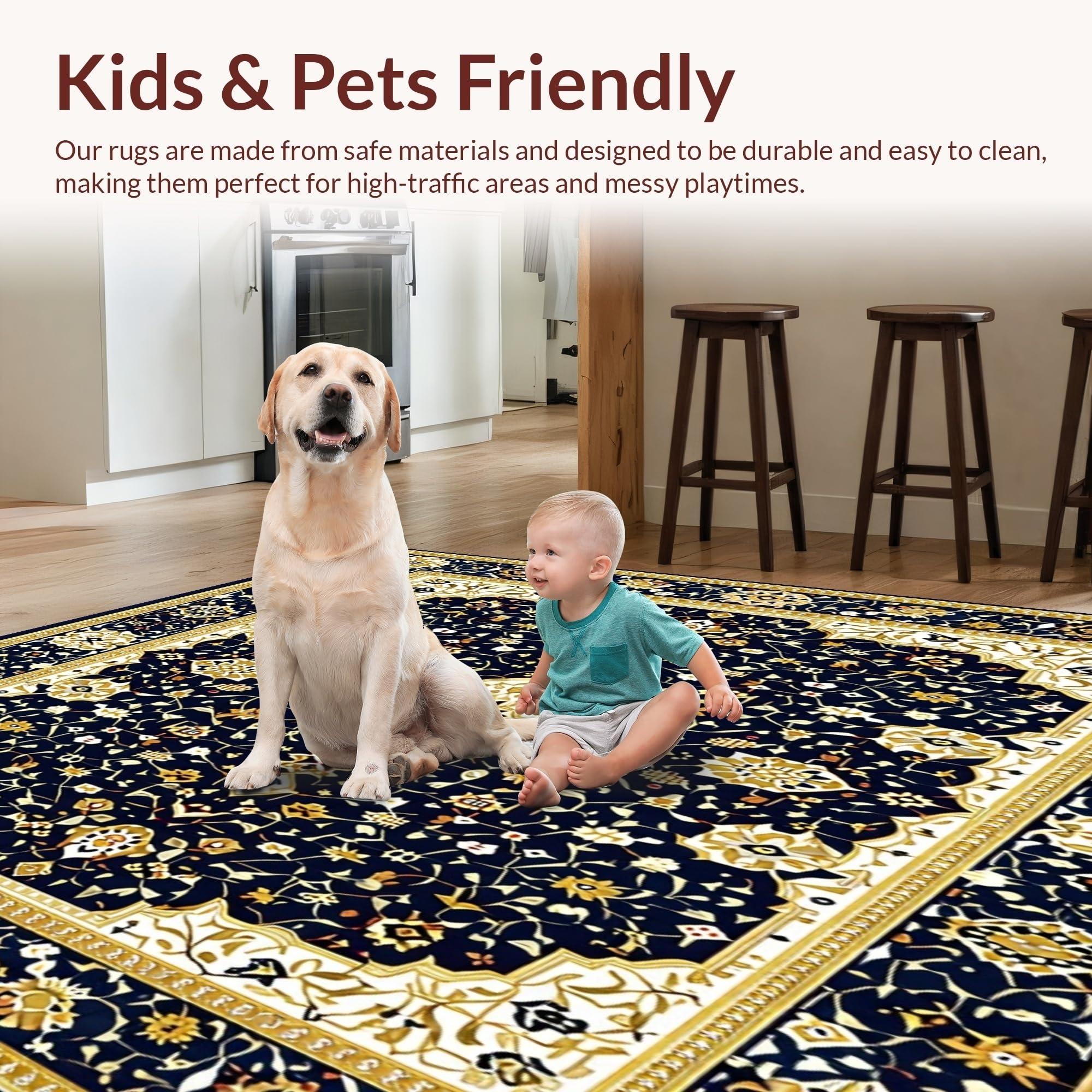 Ultra Soft Area Rug, Non Slip, Stain Resistant, Washable Area Rugs for Living Room, Bedroom, Oushak with Dark Navy and Gold Details(Black) Overview: