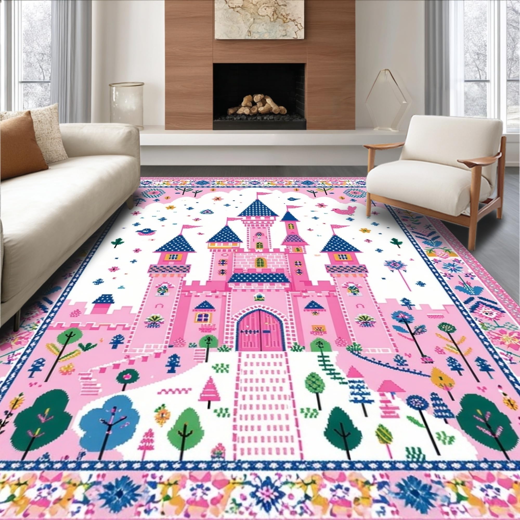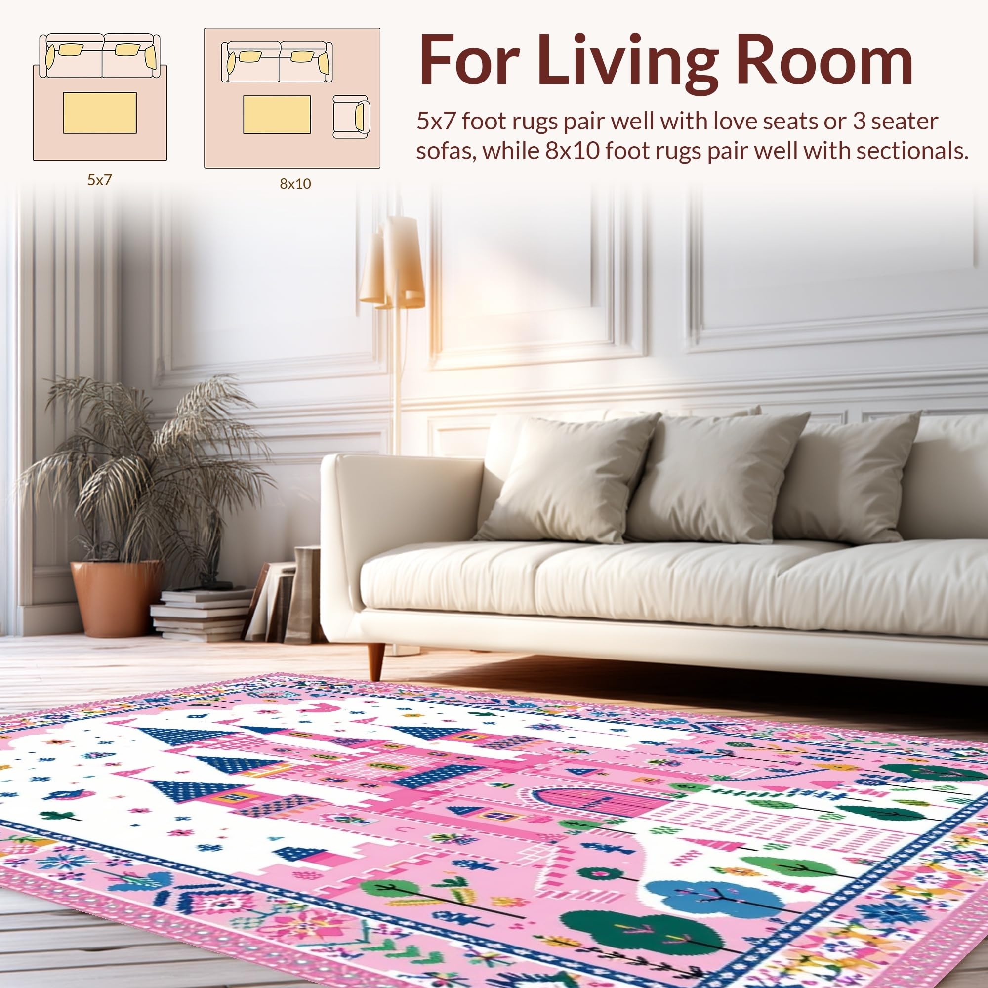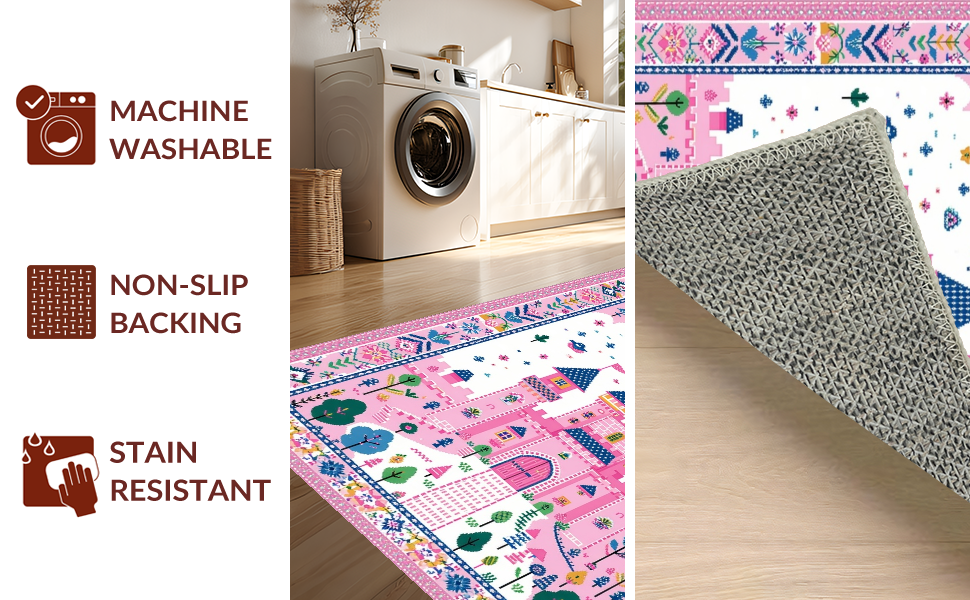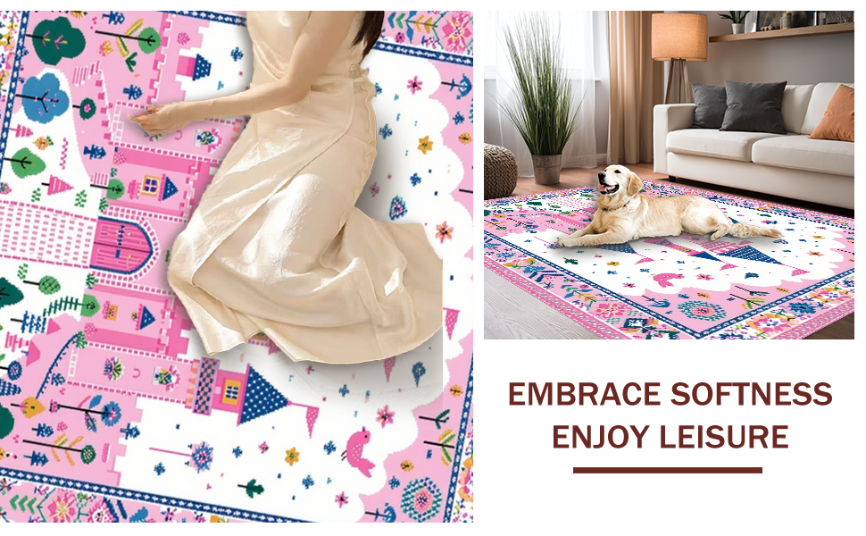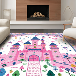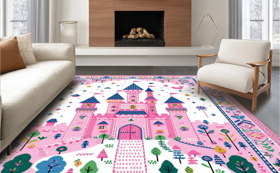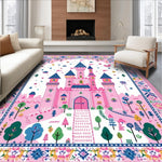 Ultra Soft Area Rug, Non Slip, Stain Resistant, Washable Area Rugs for Living Room, Bedroom, Playful Castle Themed Aesthetic(Pink) Overview: