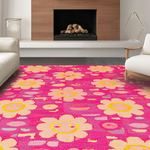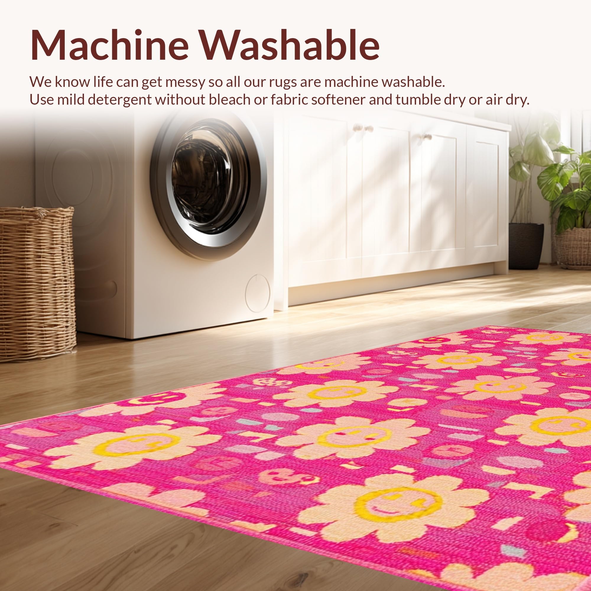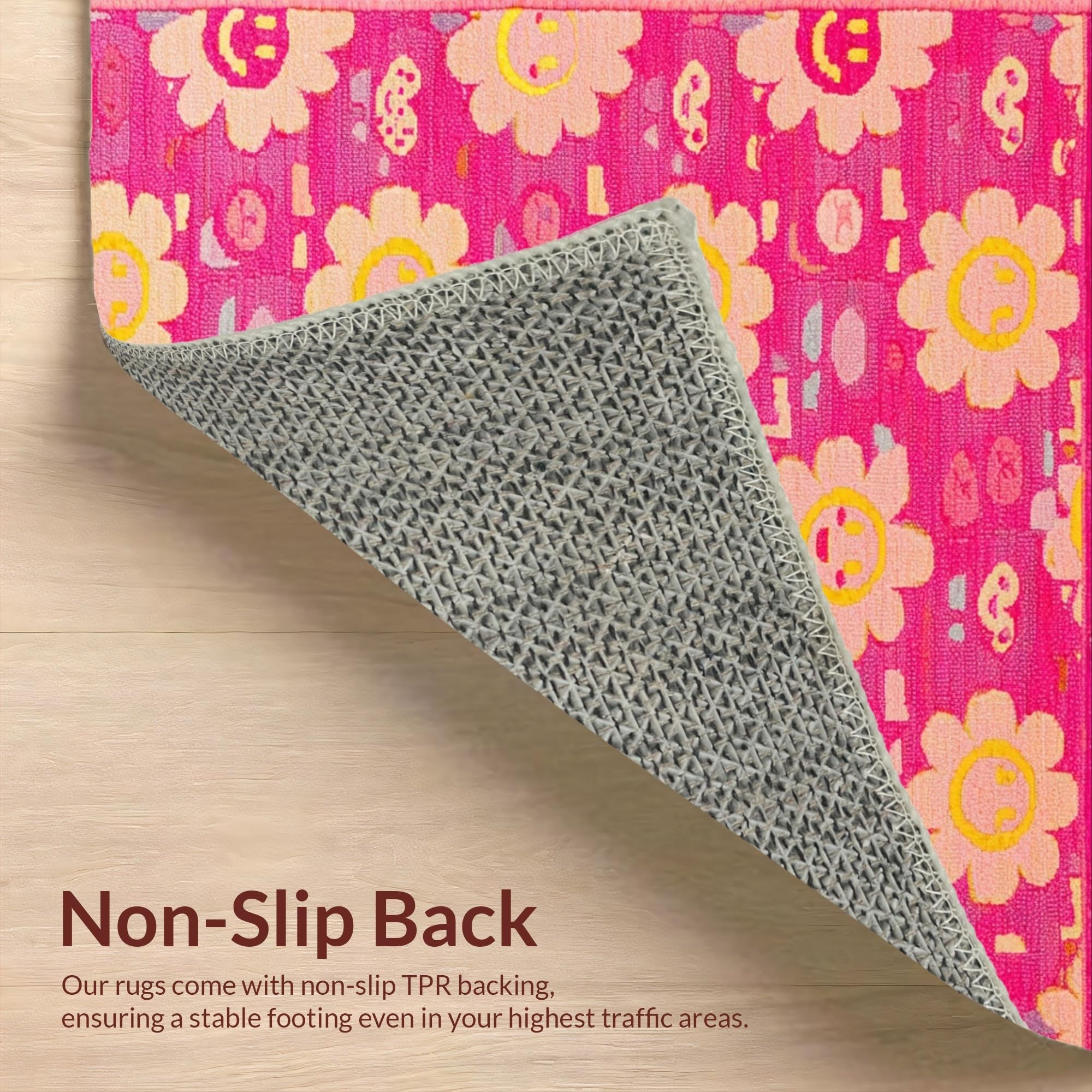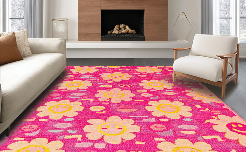 Ultra Soft Area Rug, Non Slip, Stain Resistant, Washable Area Rugs for Living Room, Bedroom, Playful Floral Smiley Aesthetic(Pink) Overview: