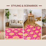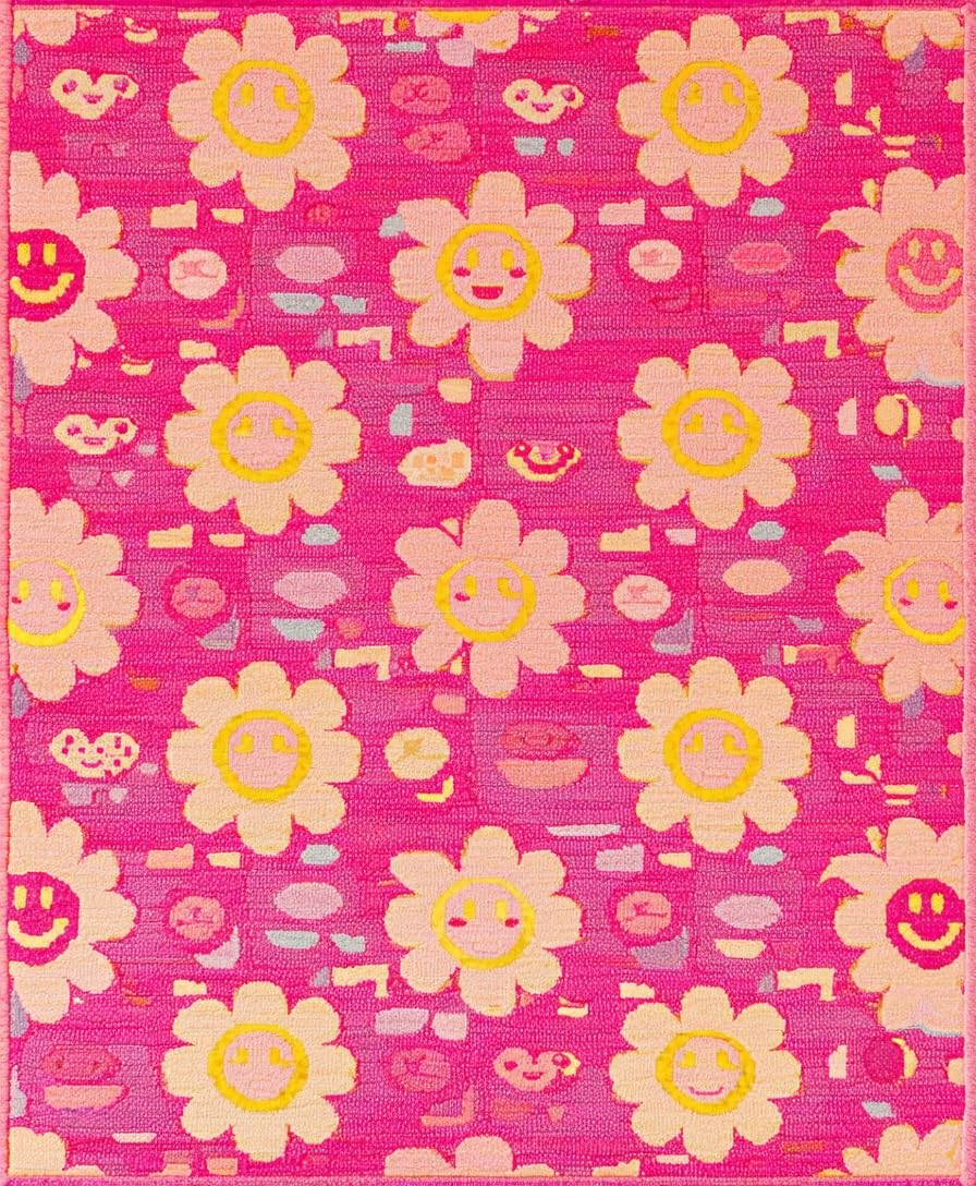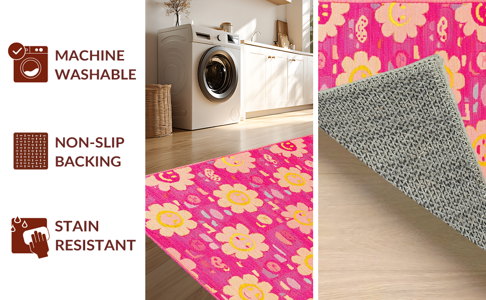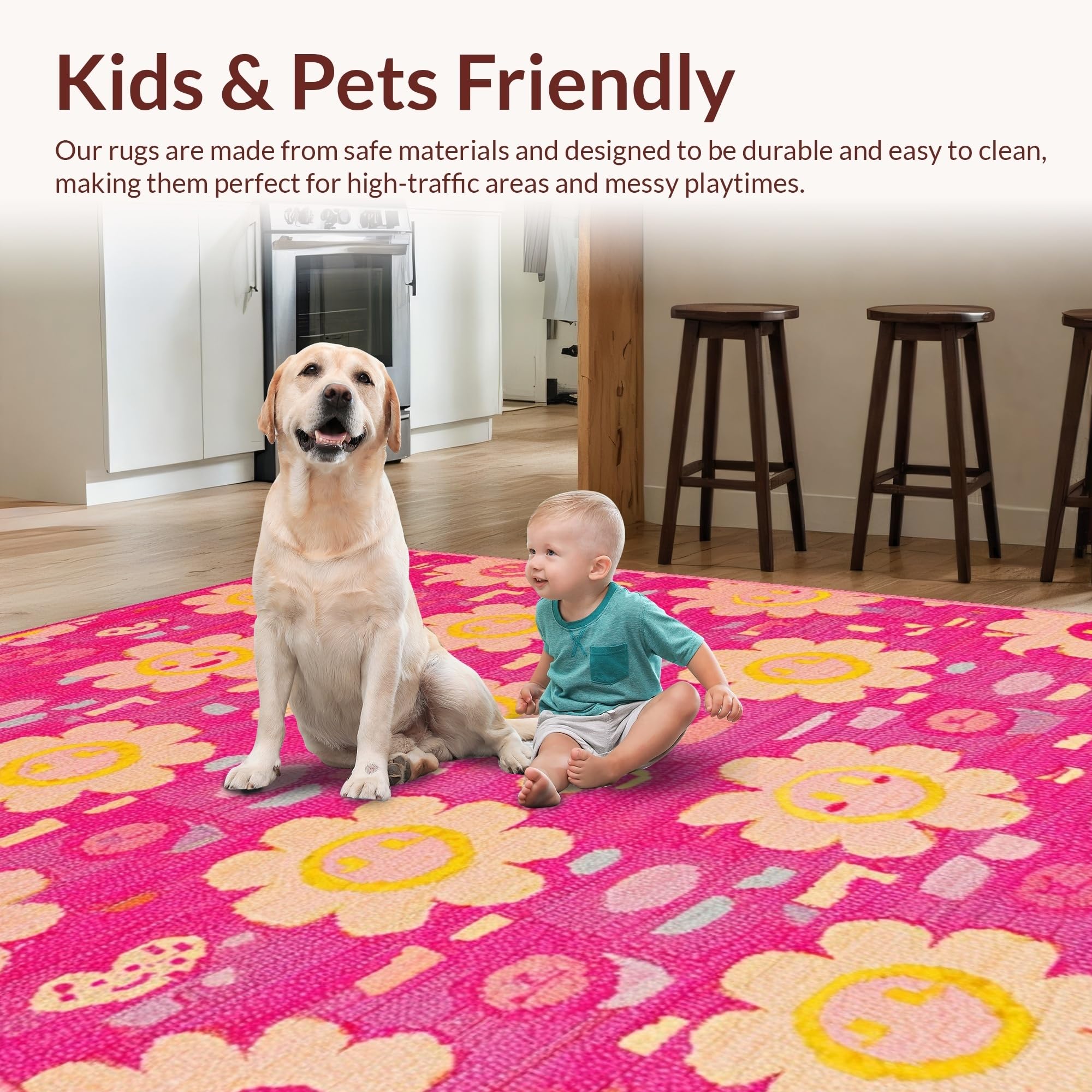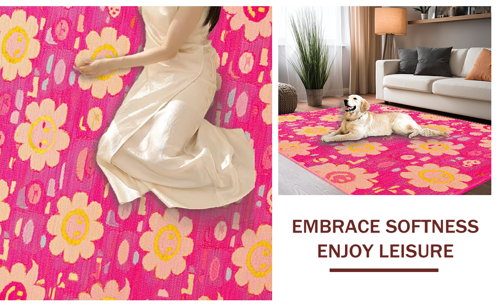 Ultra Soft Area Rug, Non Slip, Stain Resistant, Washable Area Rugs for Living Room, Bedroom, Playful Floral Smiley Aesthetic(Pink) Overview:
