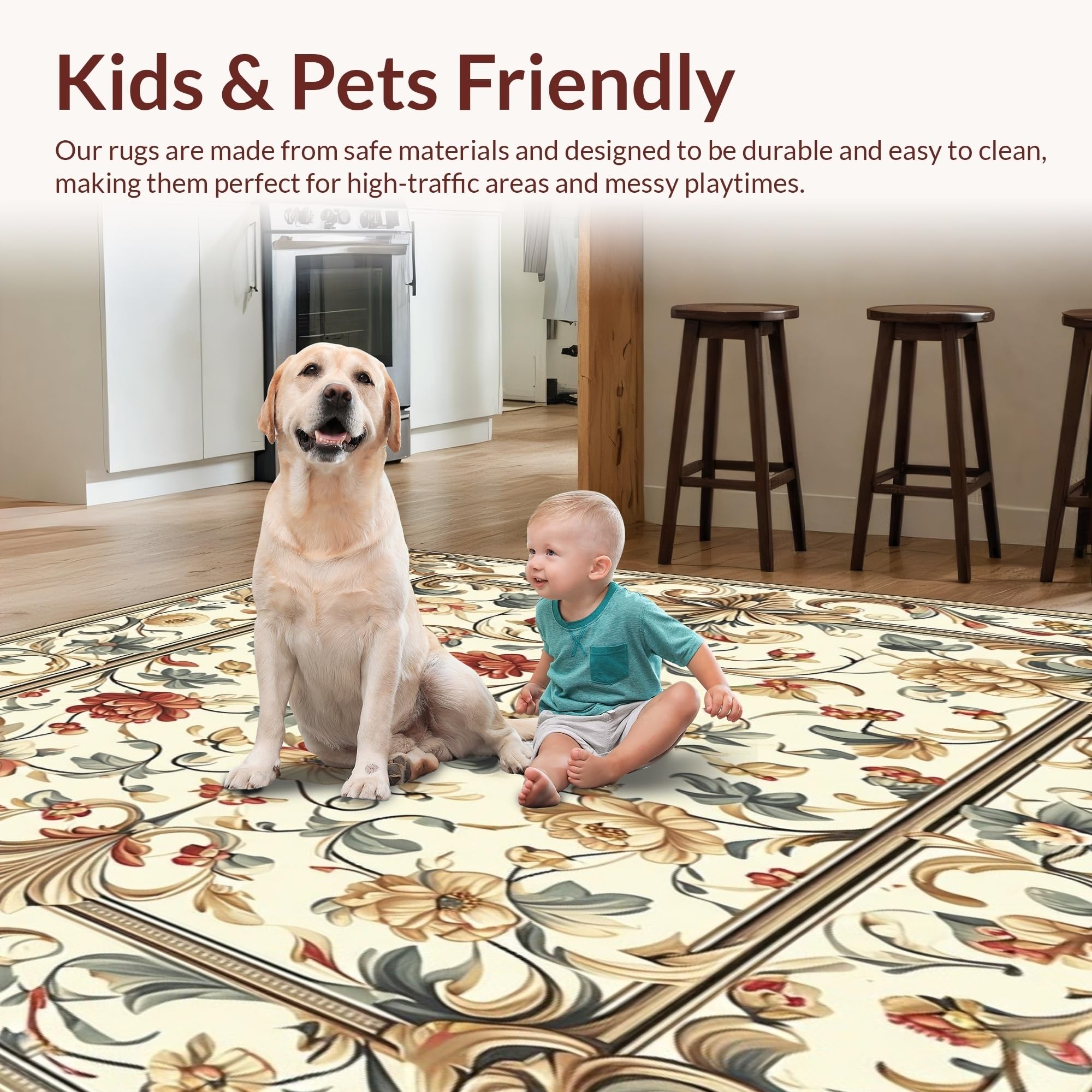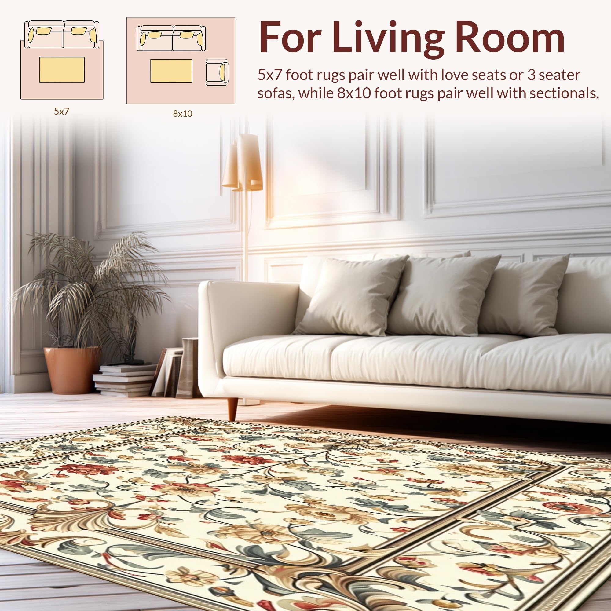 Ultra Soft Area Rug, Non Slip, Stain Resistant, Washable Area Rugs for Living Room, Bedroom, Refined Smoke and Beige Featuring Ornate Floral Leaf Motif Design(Beige) Overview: