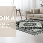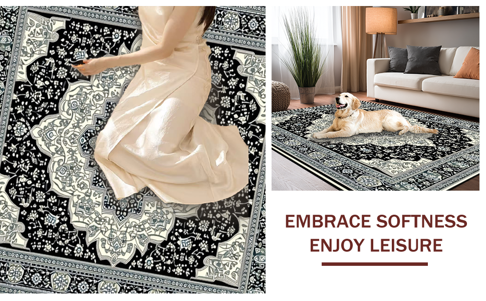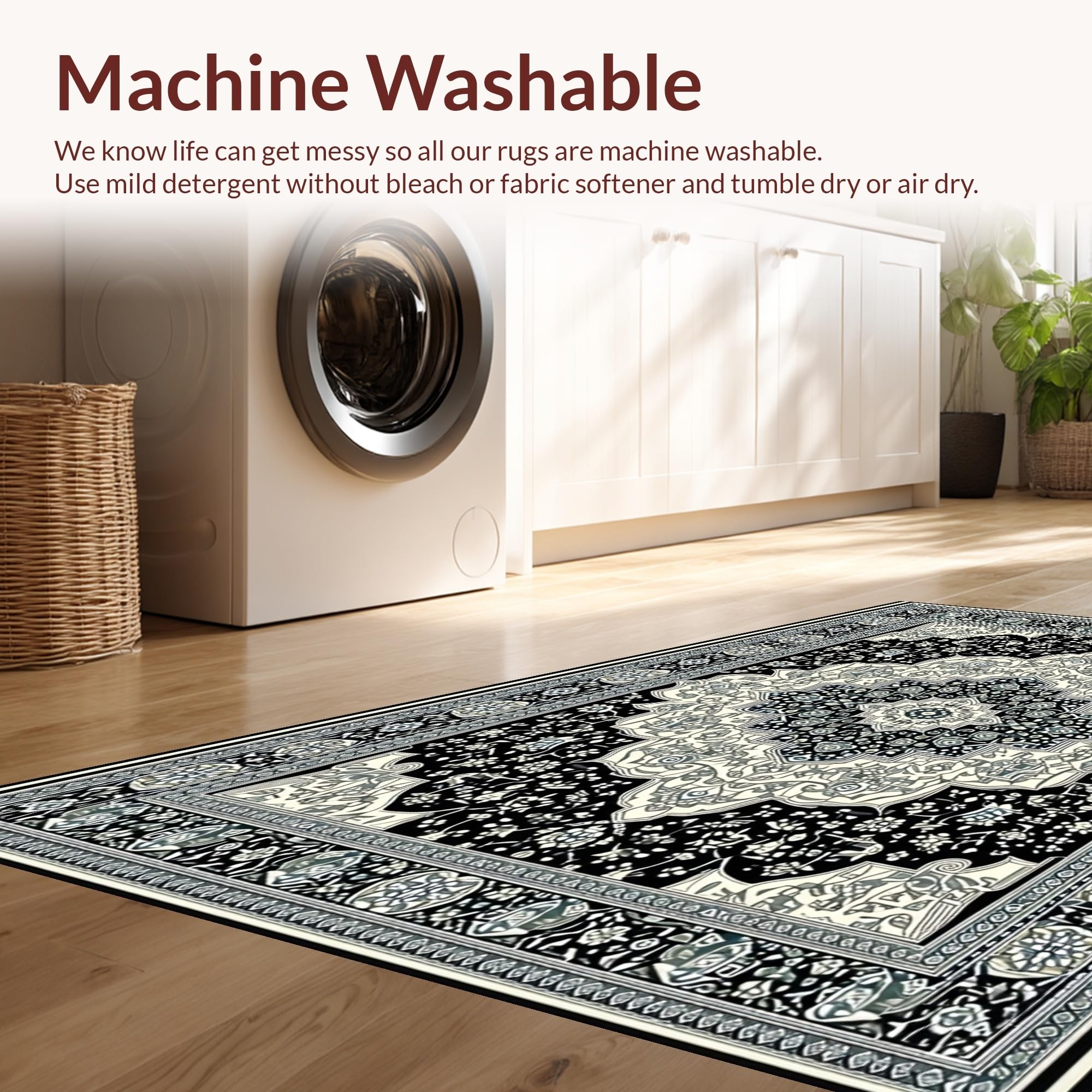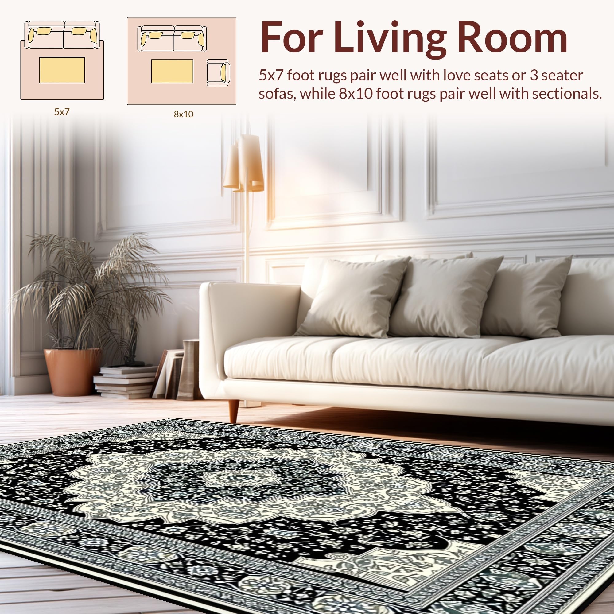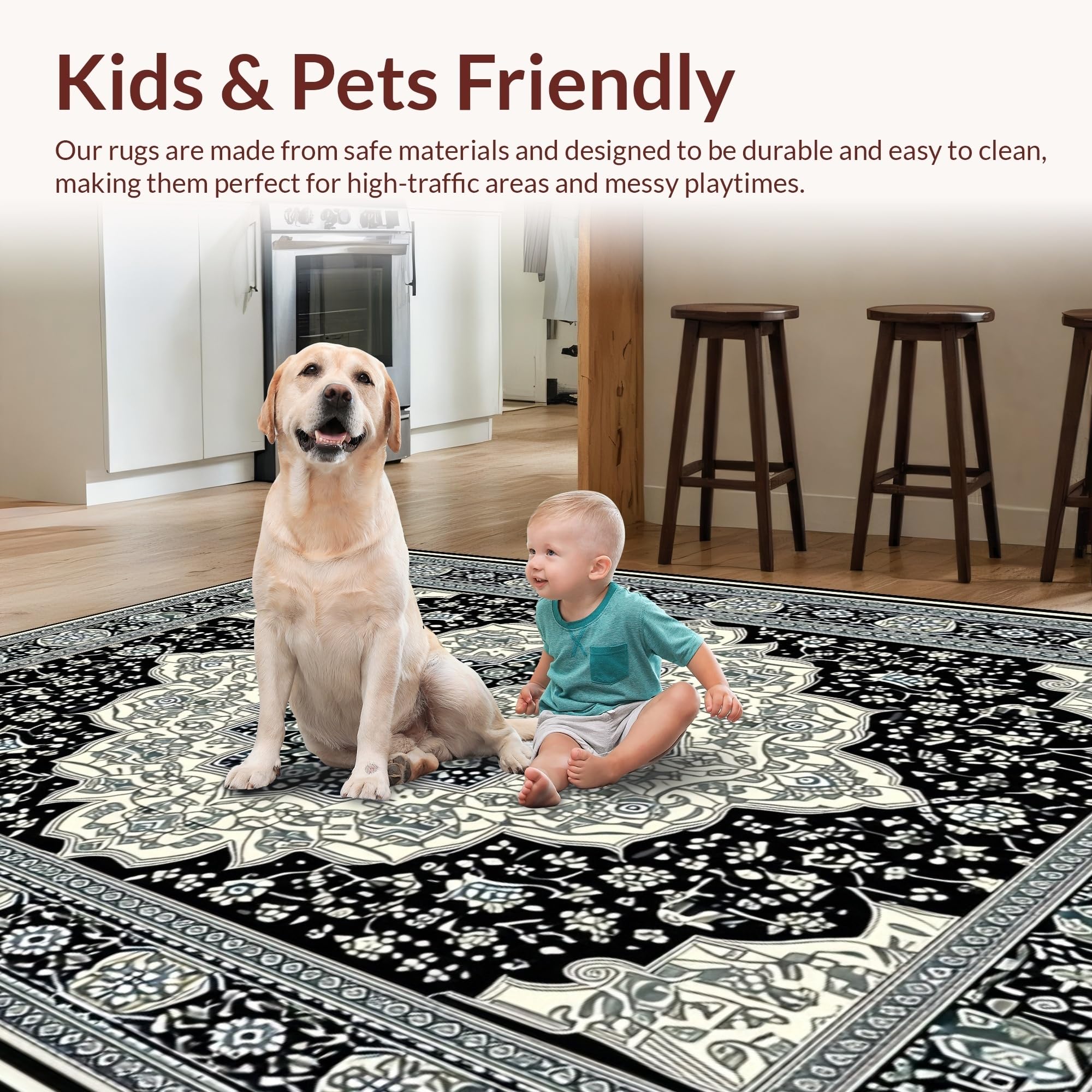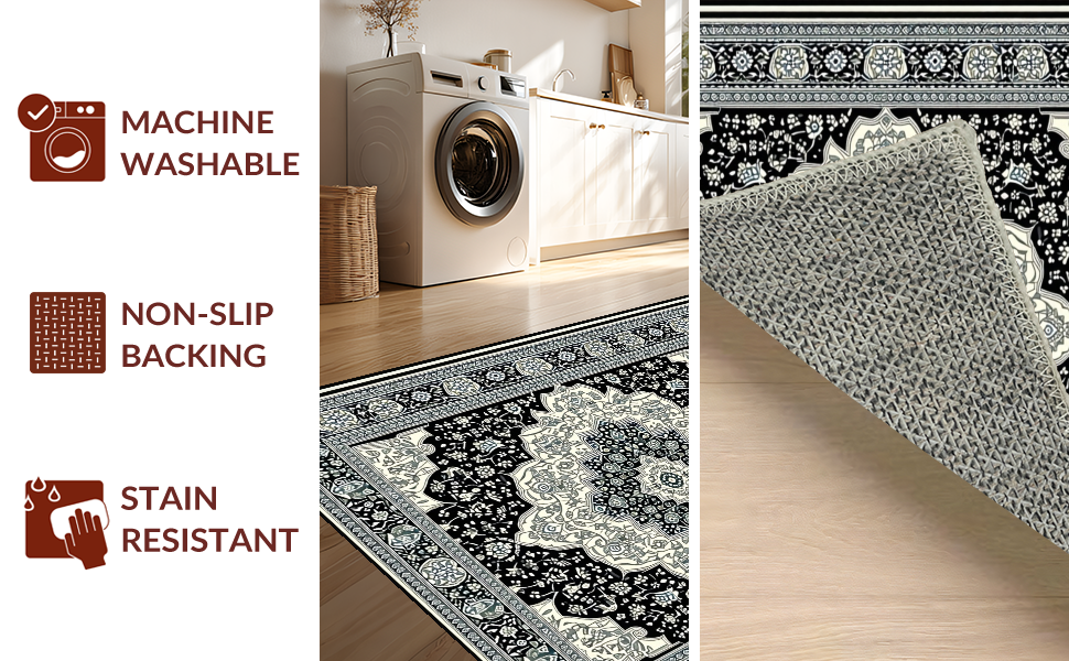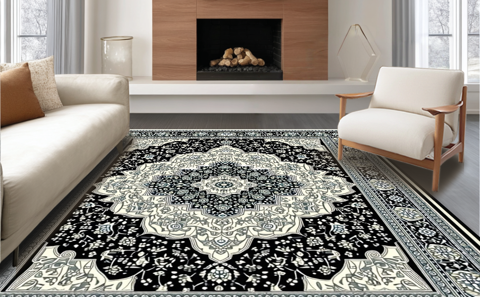 Ultra Soft Area Rug, Non Slip, Stain Resistant, Washable Area Rugs for Living Room, Bedroom, Refined Vintage Monochrome Theme(Black) Overview: