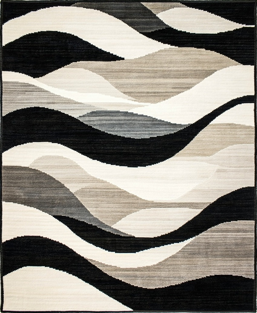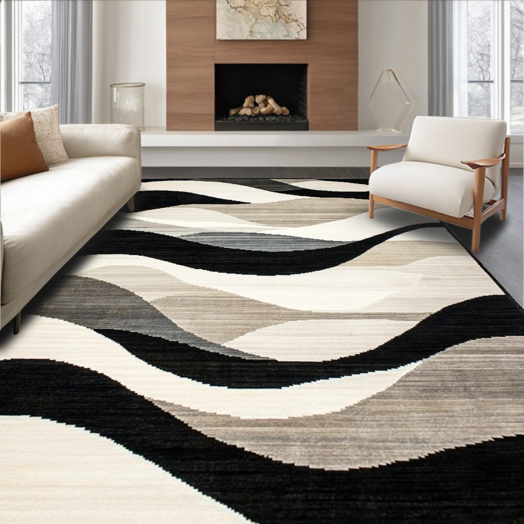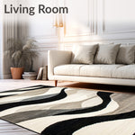 Ultra Soft Area Rug, Non Slip, Stain Resistant, Washable Area Rugs for Living Room, Bedroom, Retro Graphic Wave Area with Flowing Black and Beige Curves Neutral Harmony(Gray) Overview: