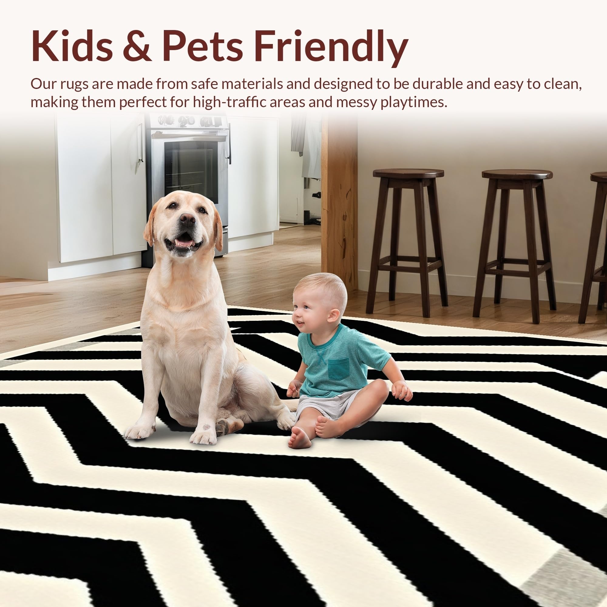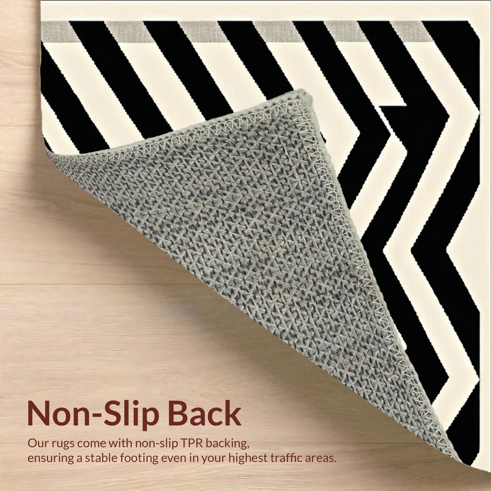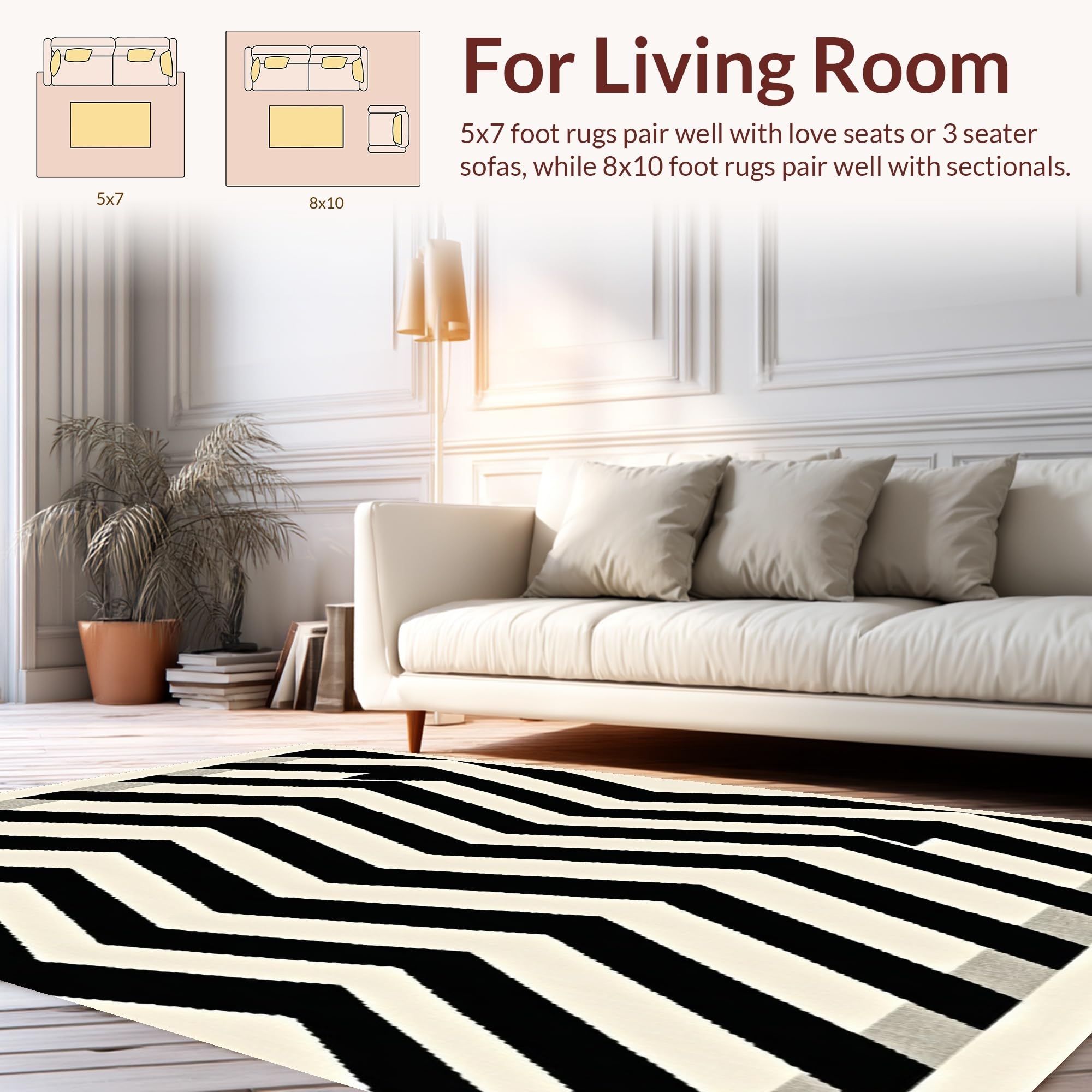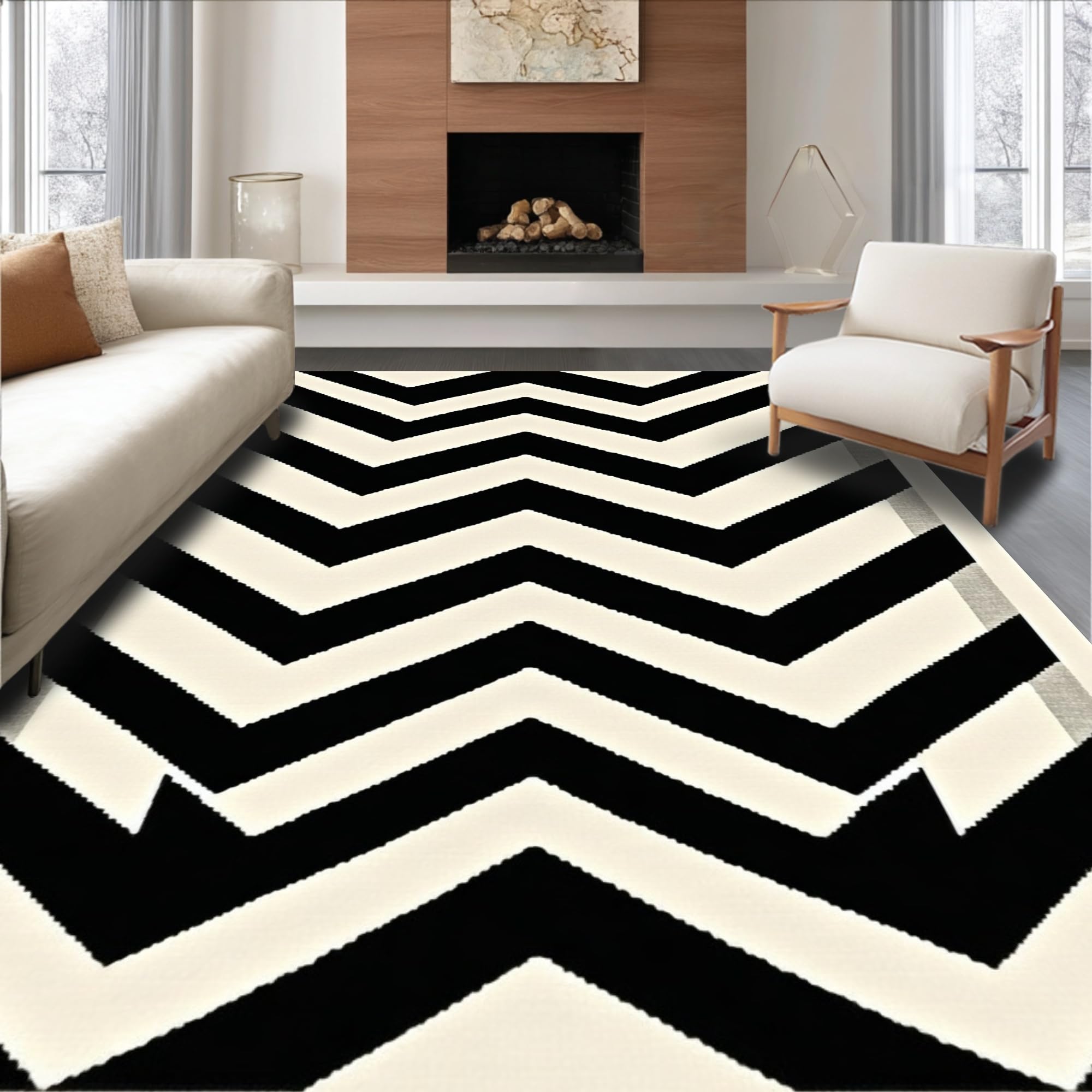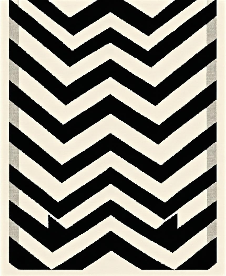 Ultra Soft Area Rug, Non Slip, Stain Resistant, Washable Area Rugs for Living Room, Bedroom, Reversible Patio Area with Modern Chevron Stripes and Contrast Borders(Black) Overview: