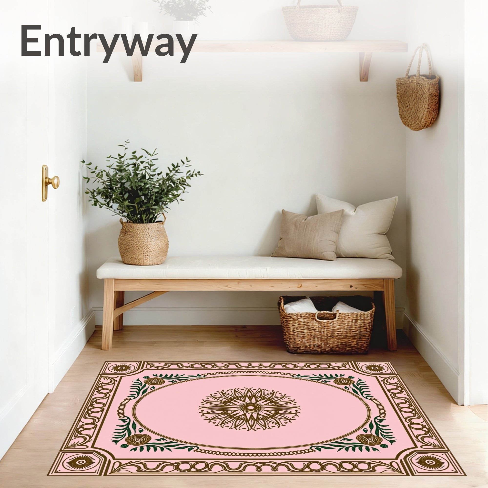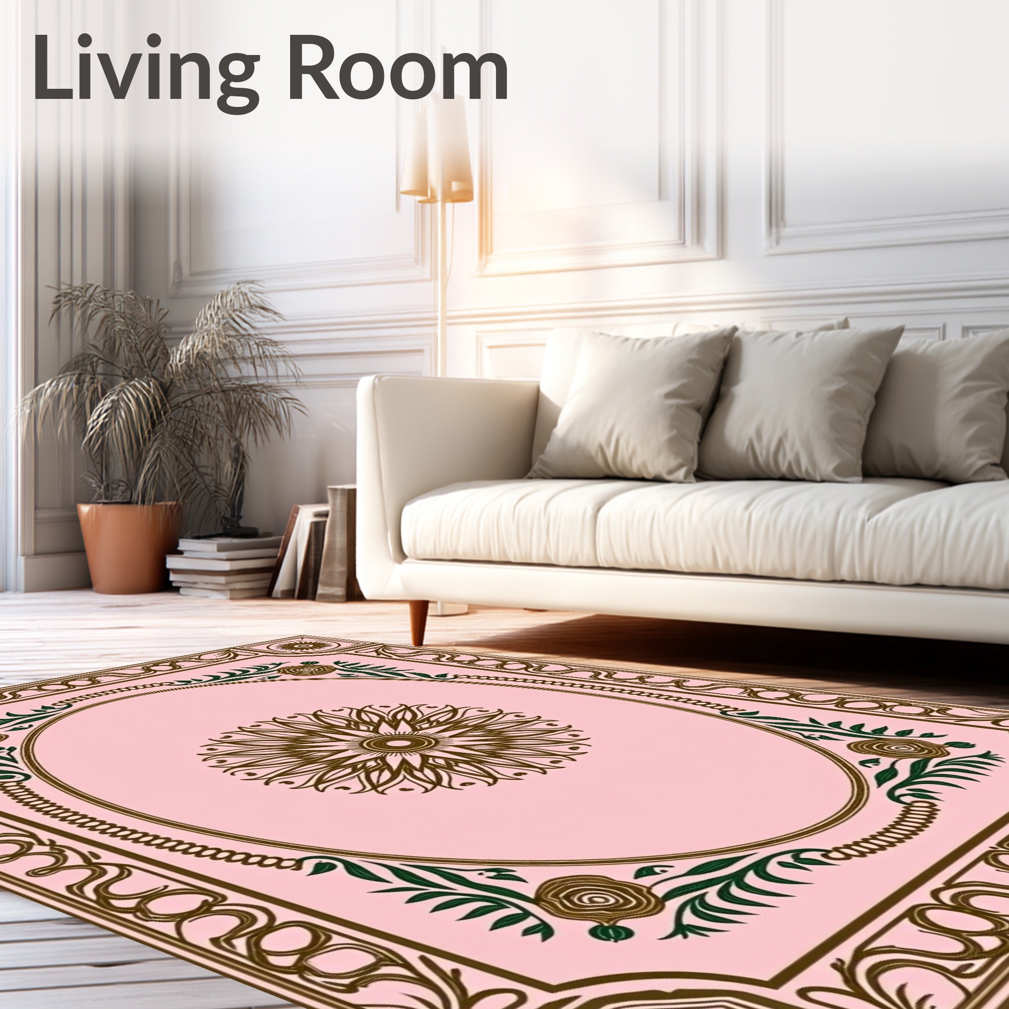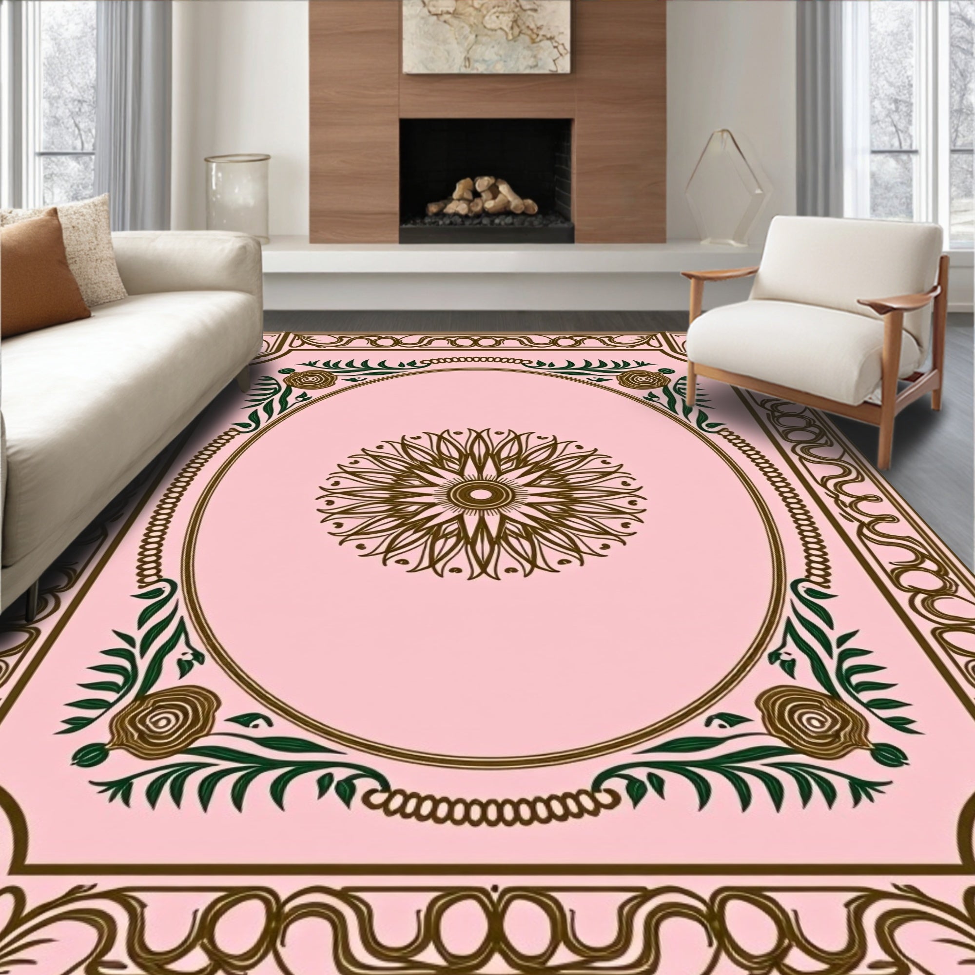 Flatwoven High Traffic Area Rug, Rose Blossom Medallion Motif with Intertwined Petals and Delicate Vines, Non Slip, Stain Resistant, Washable Area Rugs for Living Room, Bedroom (Pink) Overview: