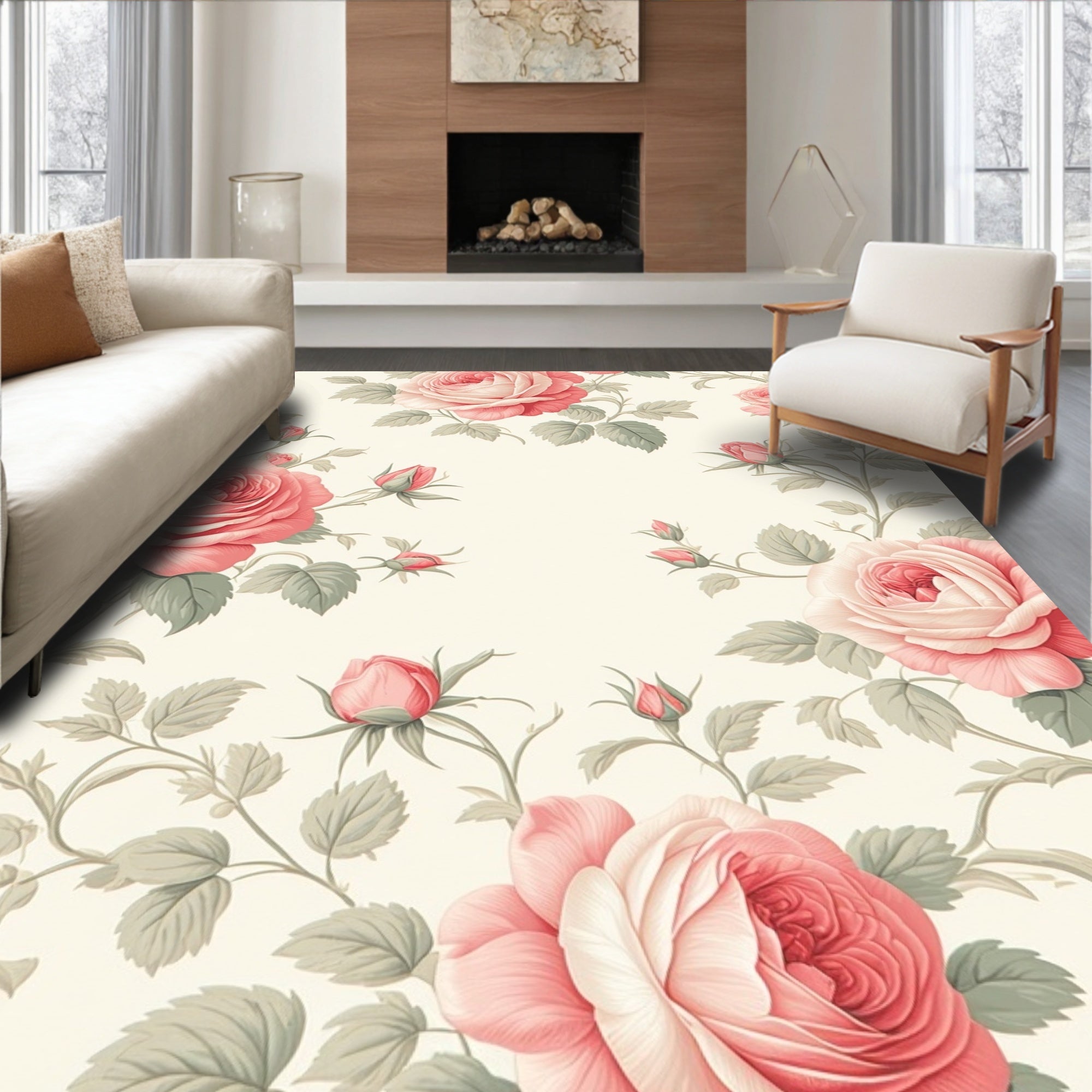 Flatwoven High Traffic Area Rug, Rose Garden Pink Floral, Non Slip, Stain Resistant, Washable Area Rugs for Living Room, Bedroom (Ivory) Overview:
