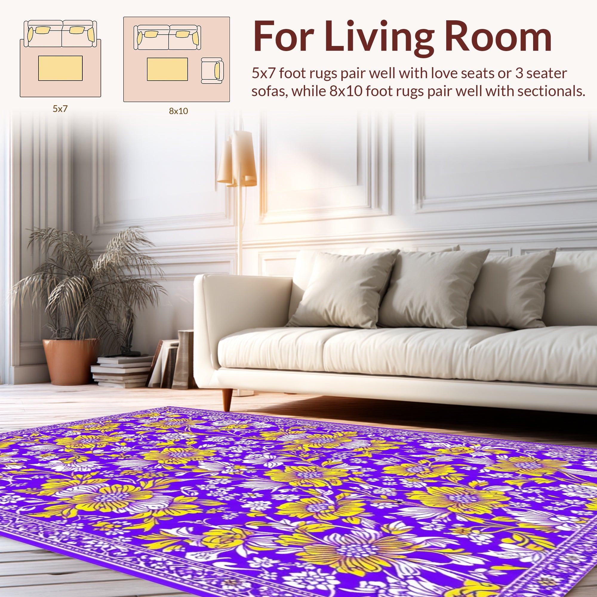 Flatwoven High Traffic Area Rug, Rustic Artful Floral Touch, Non Slip, Stain Resistant, Washable Area Rugs for Living Room, Bedroom (Purple) Overview: