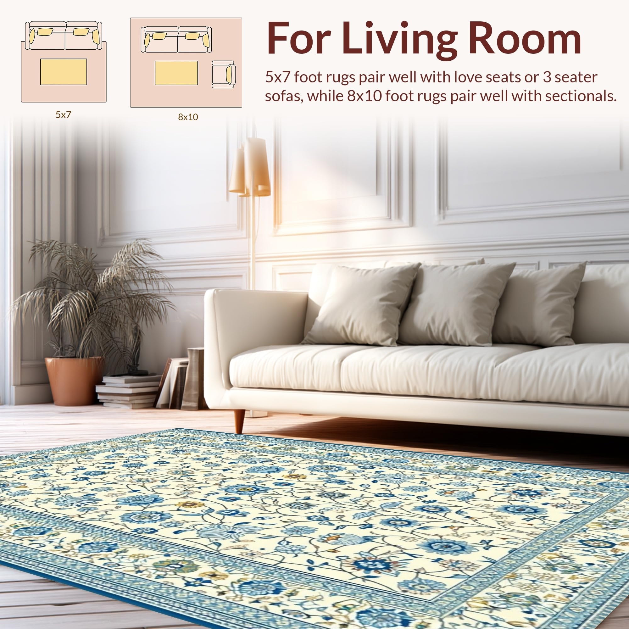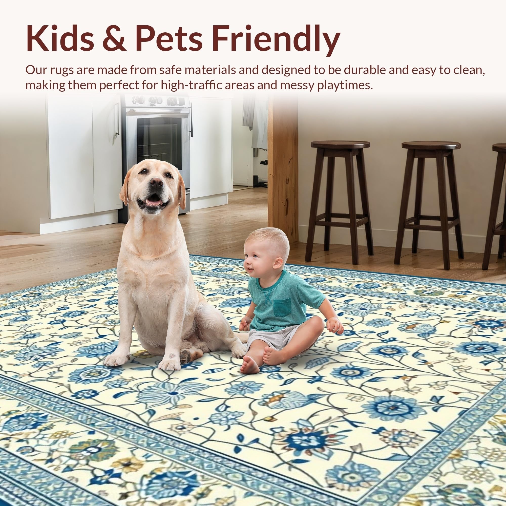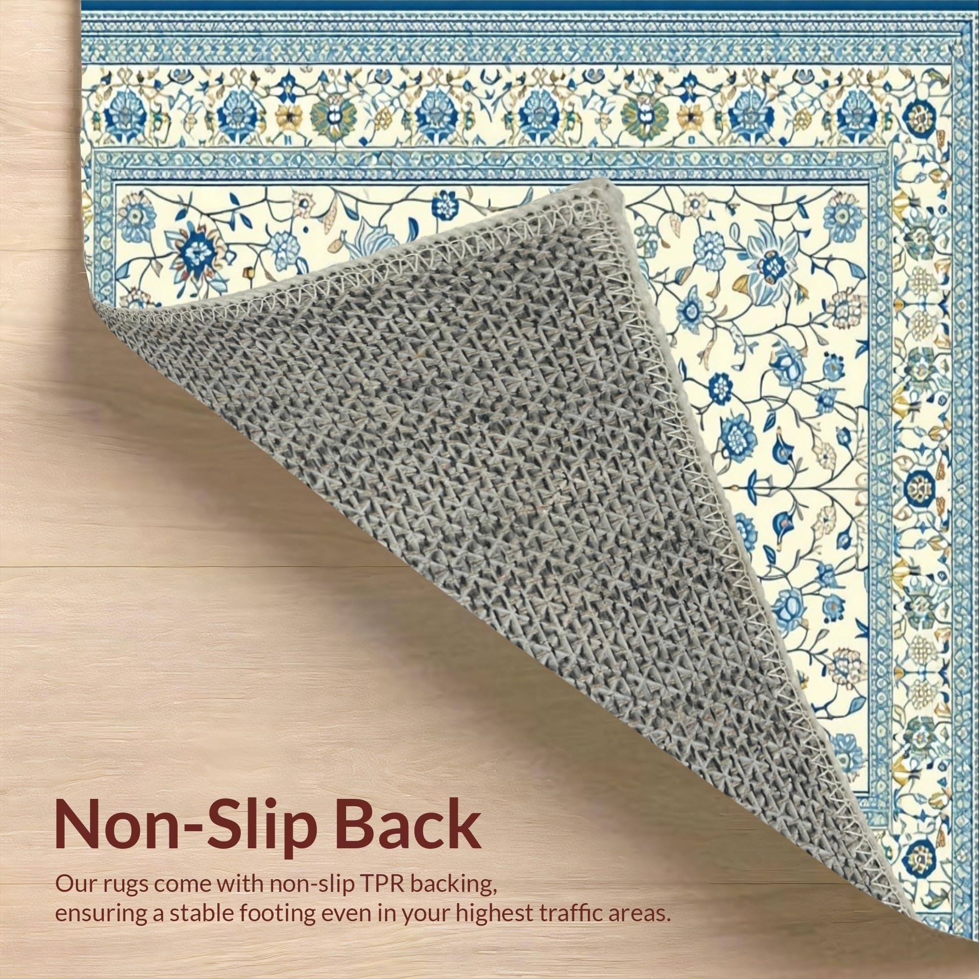 Ultra Soft Area Rug, Non Slip, Stain Resistant, Washable Area Rugs for Living Room, Bedroom, Rustic Blue Tiled Design(Beige) Overview: