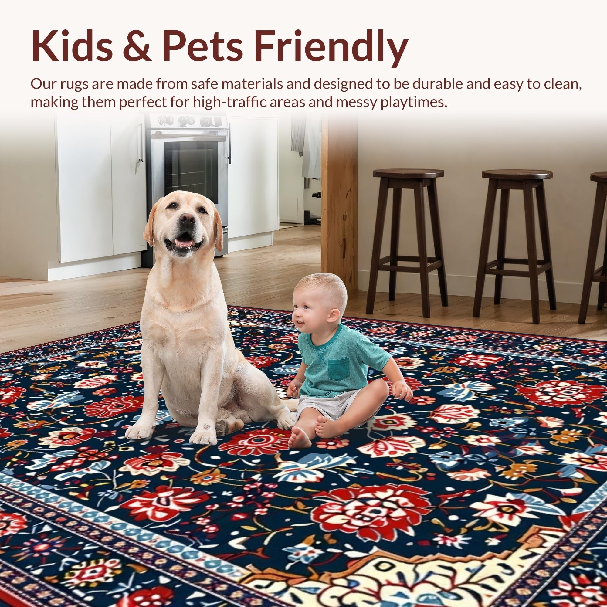 Ultra Soft Area Rug, Non Slip, Stain Resistant, Washable Area Rugs for Living Room, Bedroom, Rustic Dark Blue Flower Motif(Blue) Overview:
