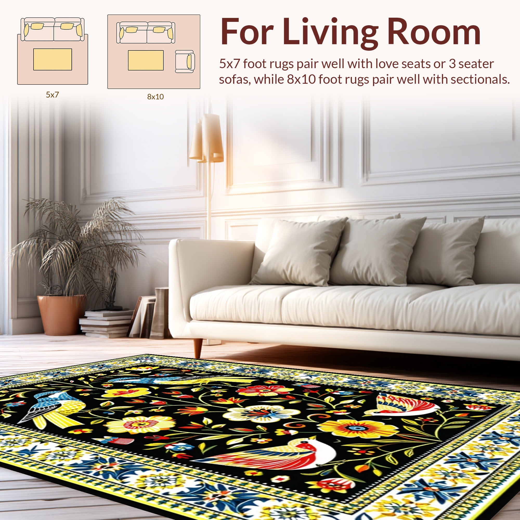 Flatwoven High Traffic Area Rug, Rustic Elegant Botanical Design, Non Slip, Stain Resistant, Washable Area Rugs for Living Room, Bedroom (Black) Overview: