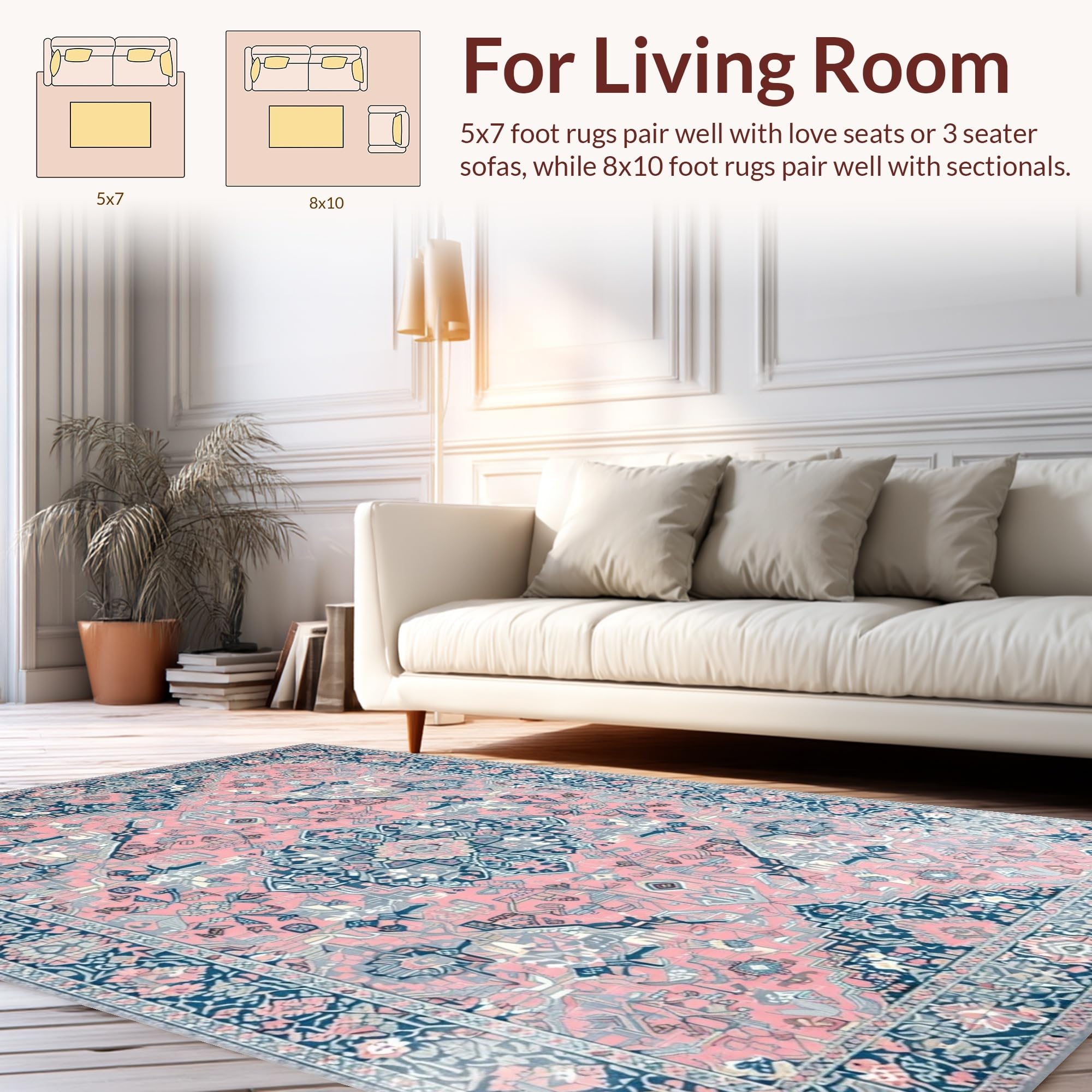 Ultra Soft Area Rug, Non Slip, Stain Resistant, Washable Area Rugs for Living Room, Bedroom, Rustic Geometric Tile Motif(Pink) Overview:
