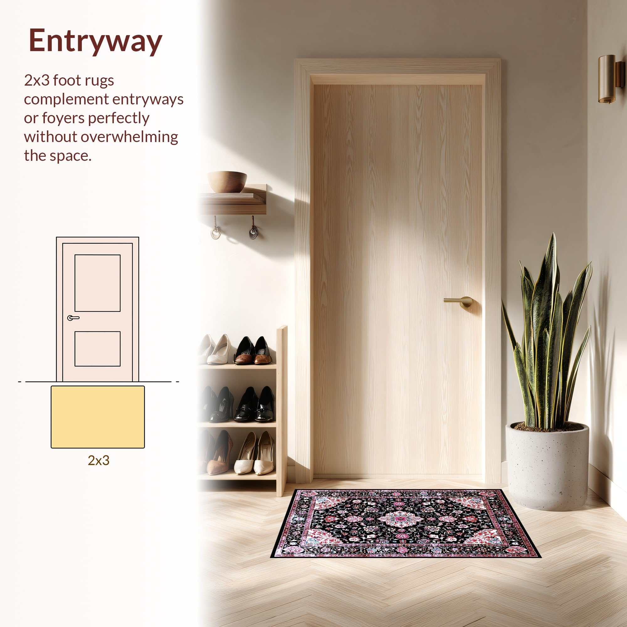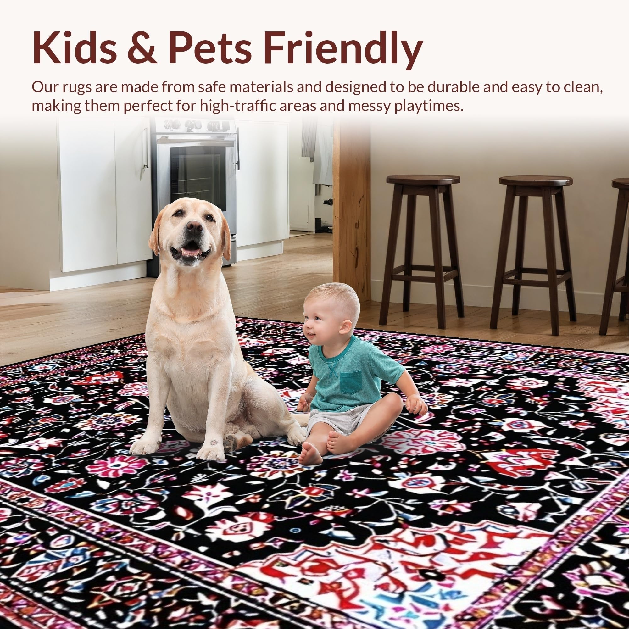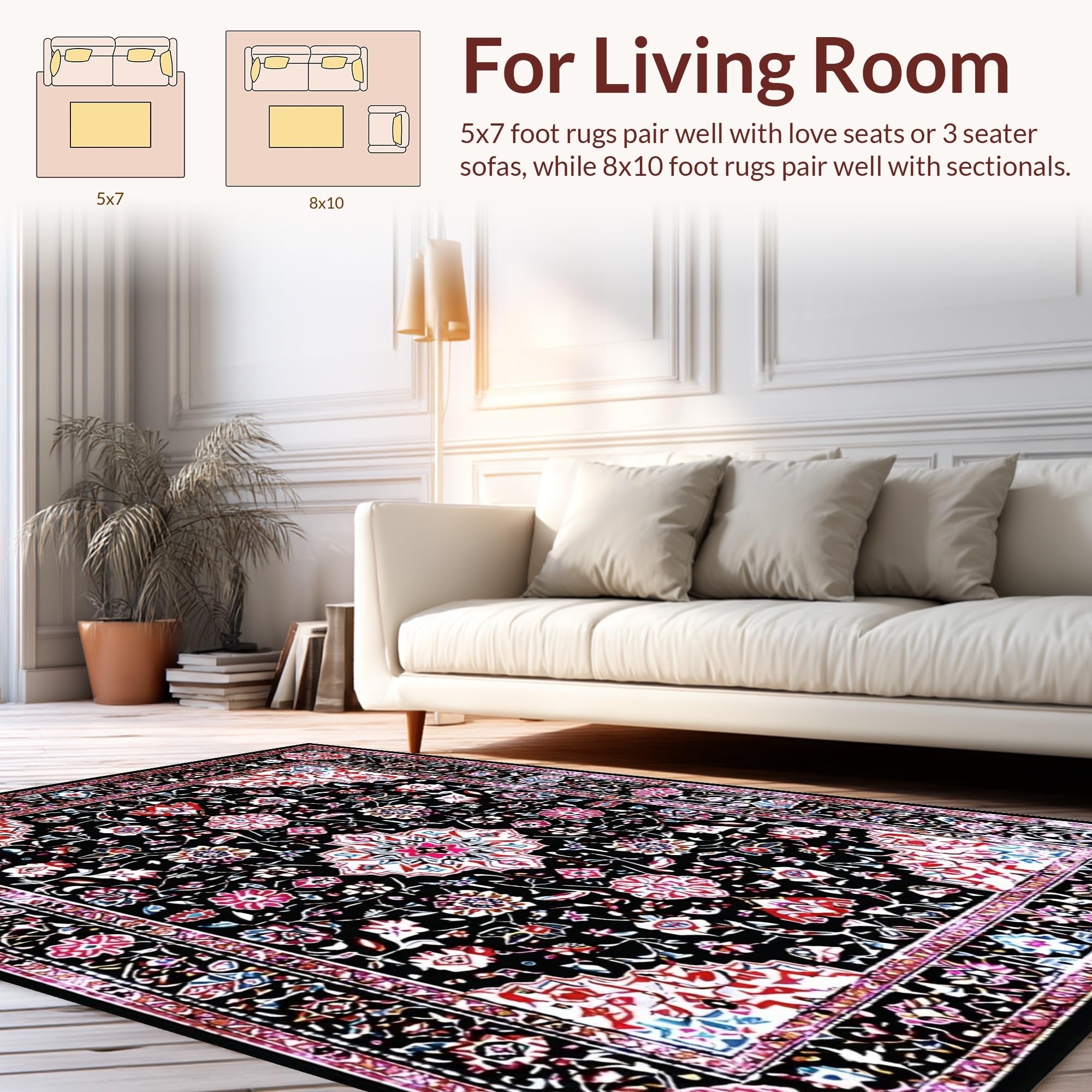 Ultra Soft Area Rug, Non Slip, Stain Resistant, Washable Area Rugs for Living Room, Bedroom, Rustic Tiled Floral Arrangement(Black) Overview: