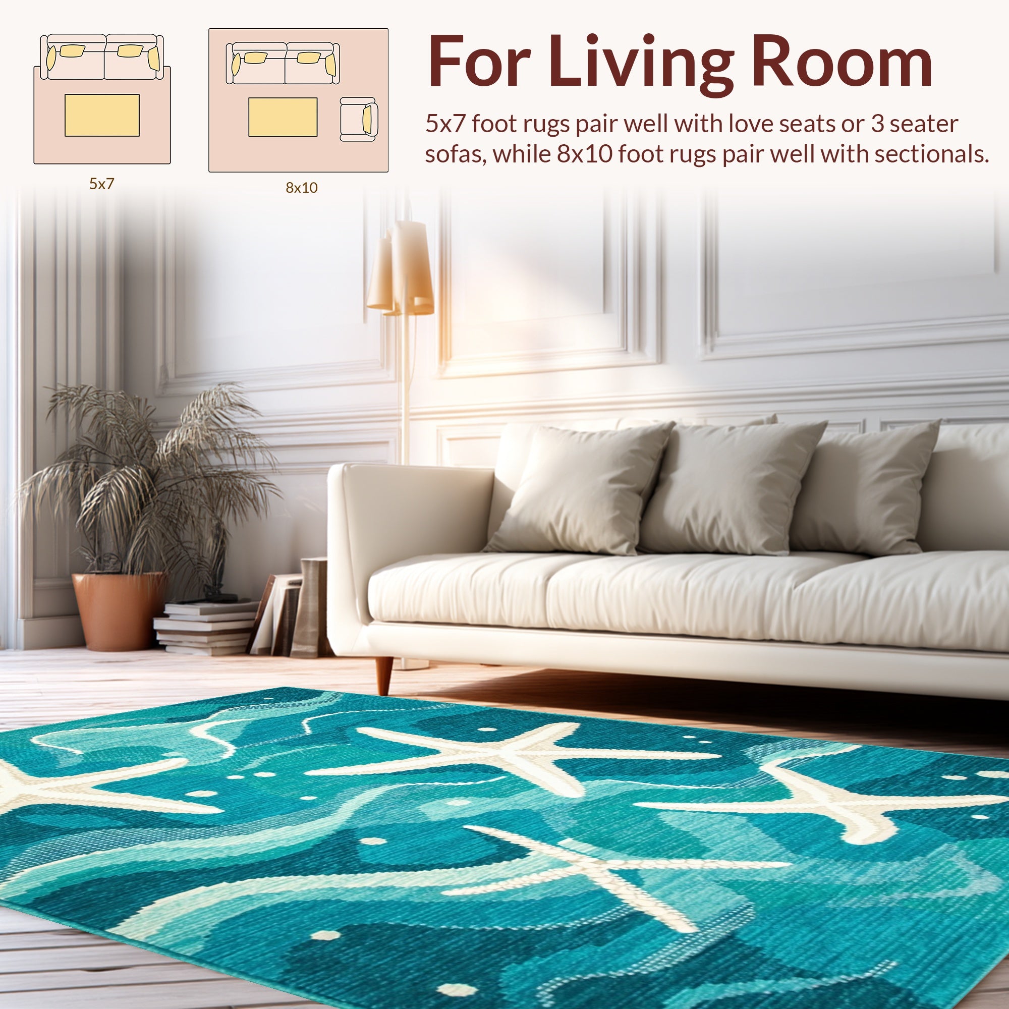 Ultra Soft Area Rug, Non Slip, Stain Resistant, Washable Area Rugs for Living Room, Bedroom, Seaside Starfish Ocean Runner Teal Blue Accent Area Non Slip(Blue) Overview: