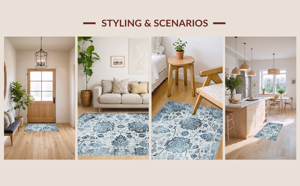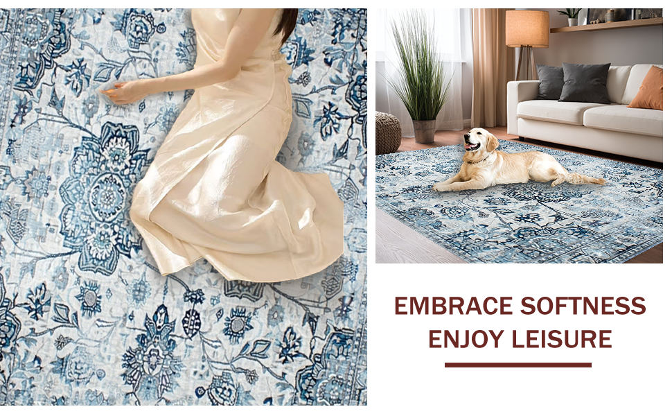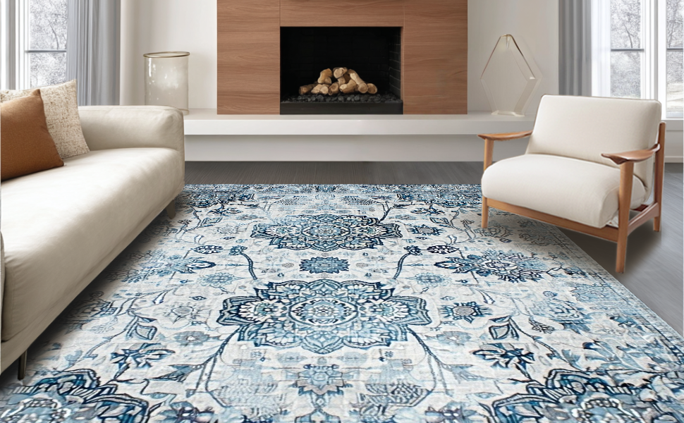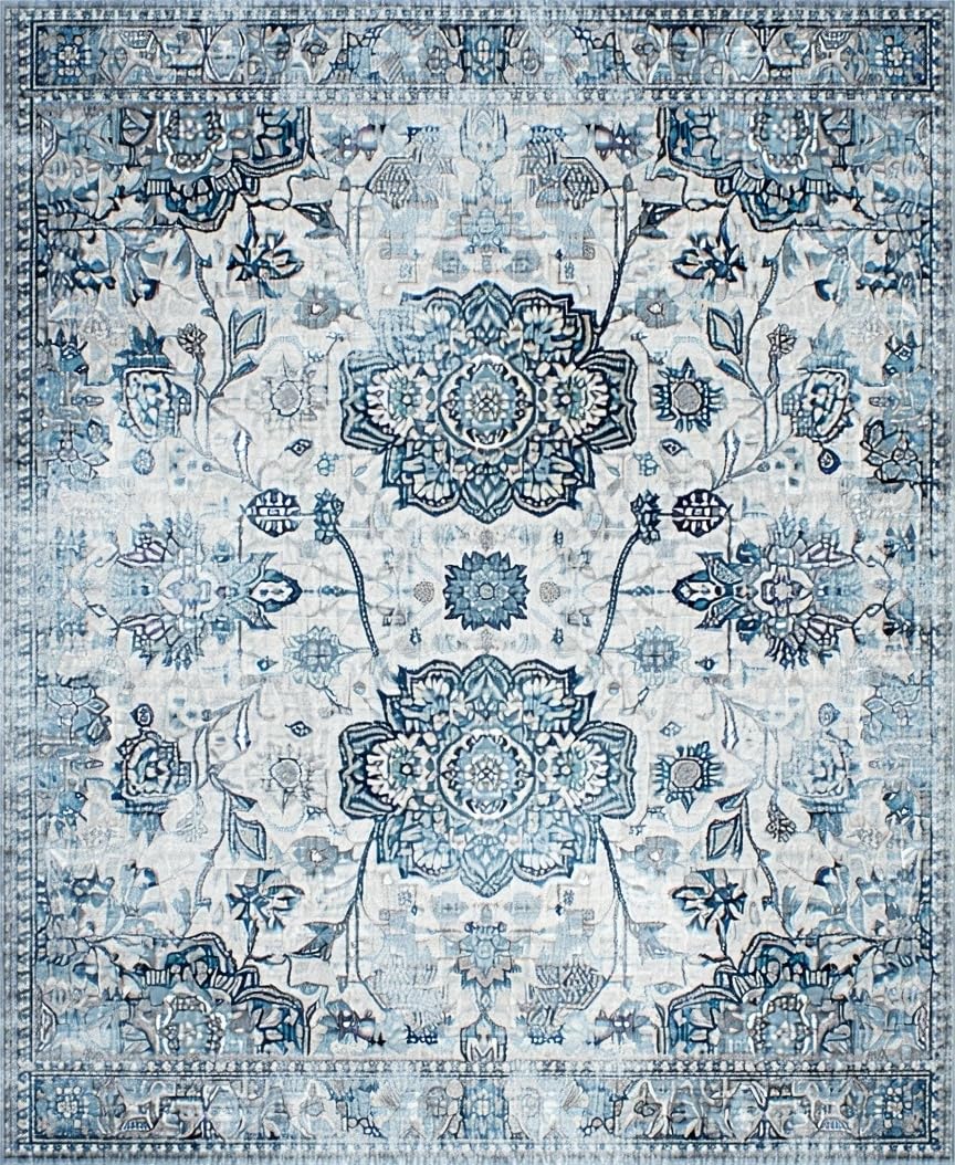 Ultra Soft Area Rug, Non Slip, Stain Resistant, Washable Area Rugs for Living Room, Bedroom, Serene Monochromatic Floral Elements(Blue) Overview: