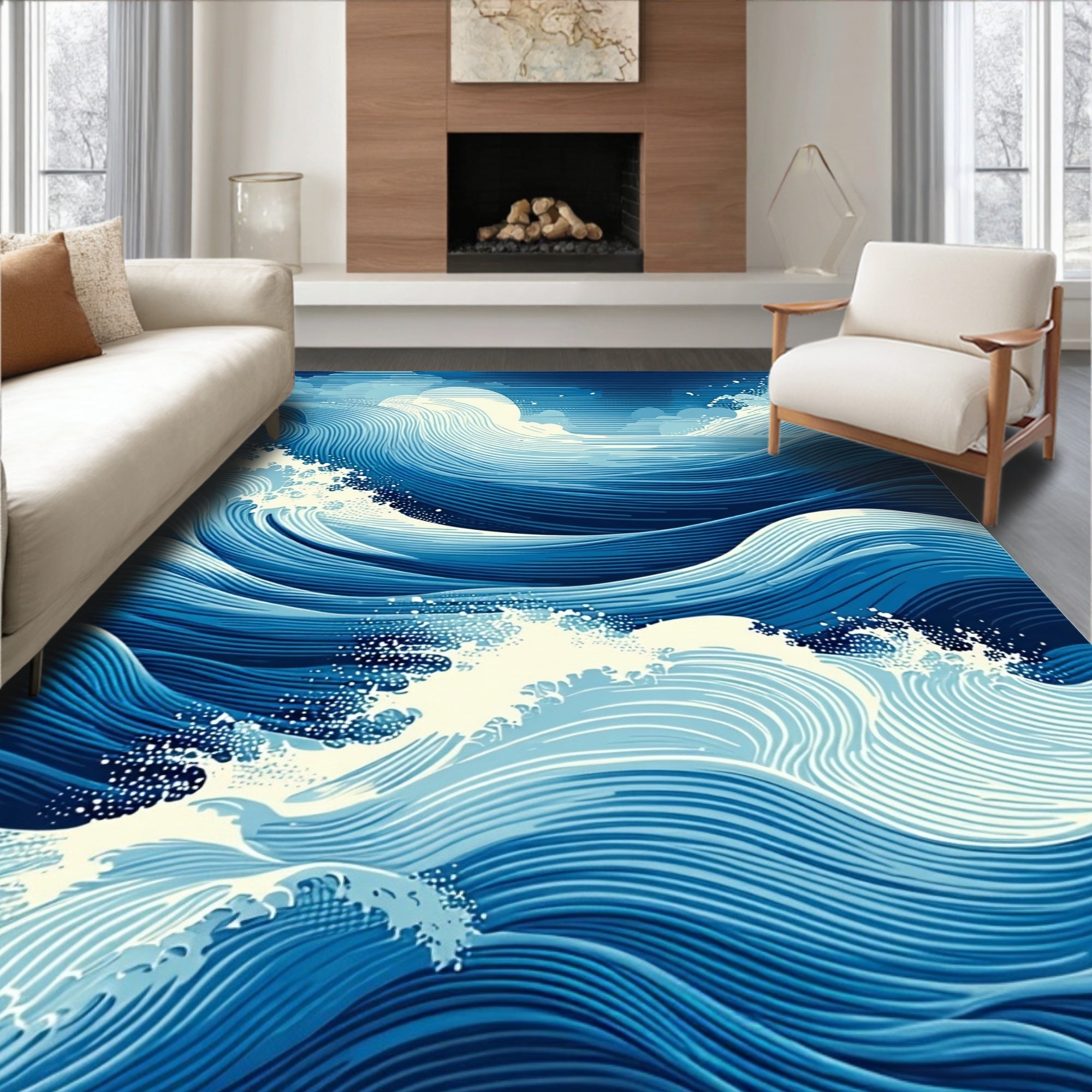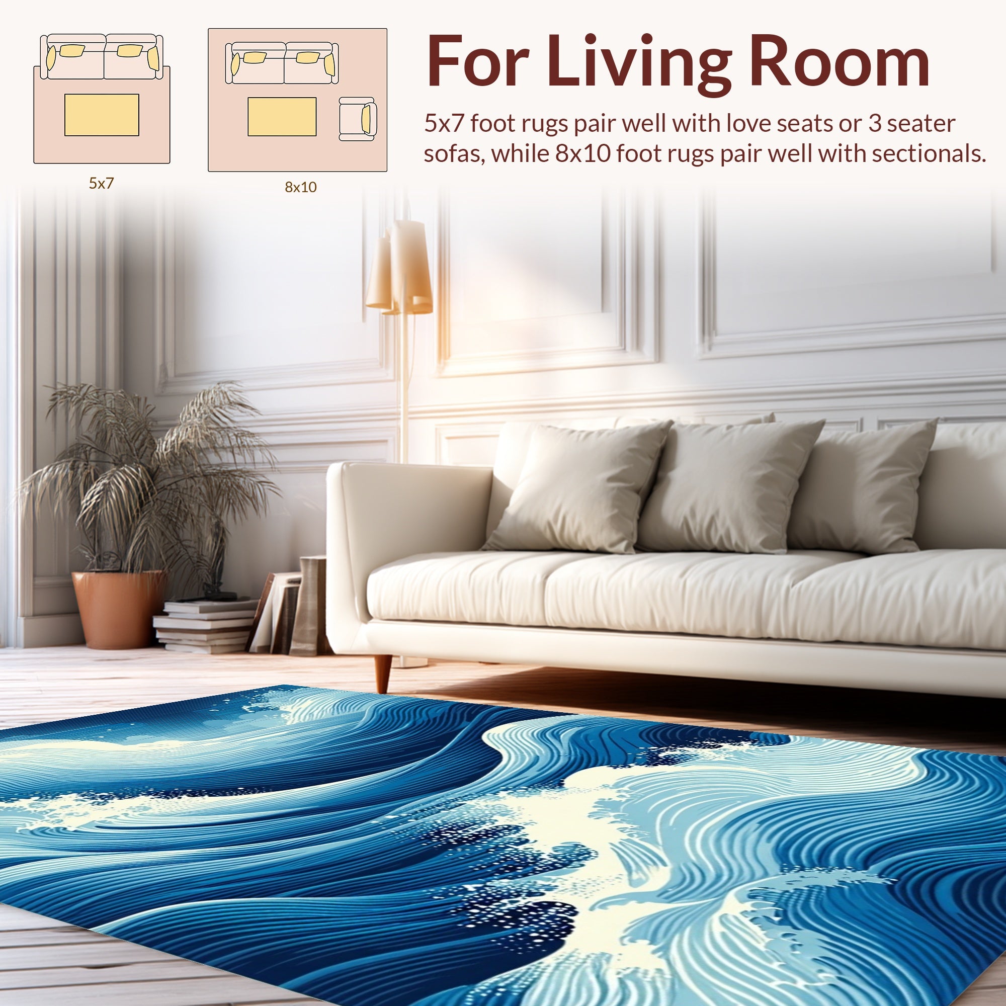 Flatwoven High Traffic Area Rug, Serene Turquoise Wave Arrangement, Non Slip, Stain Resistant, Washable Area Rugs for Living Room, Bedroom (Blue) Overview: