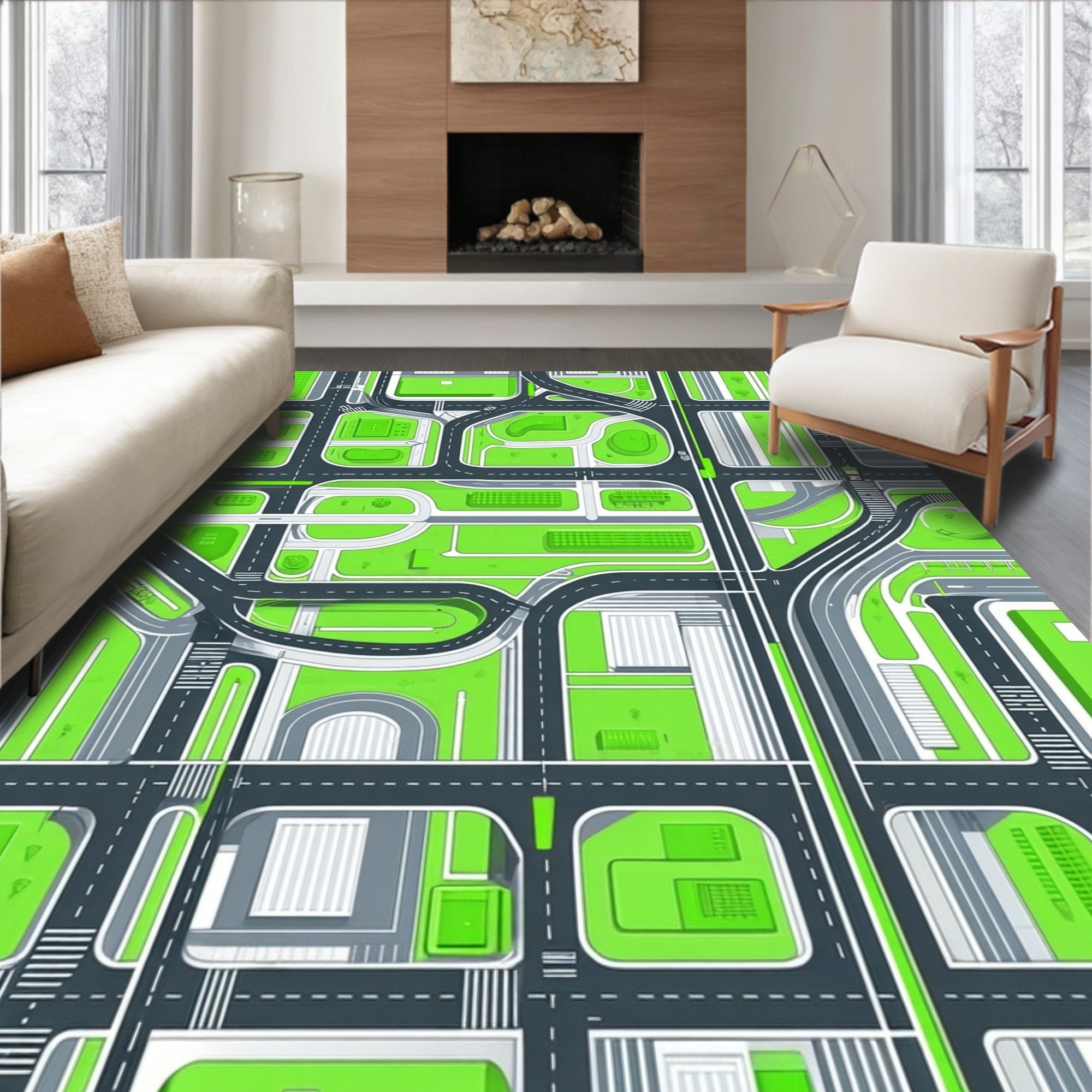 Flatwoven High Traffic Area Rug, Sleek Modern Parking Garage Theme, Non Slip, Stain Resistant, Washable Area Rugs for Living Room, Bedroom (Green) Overview: